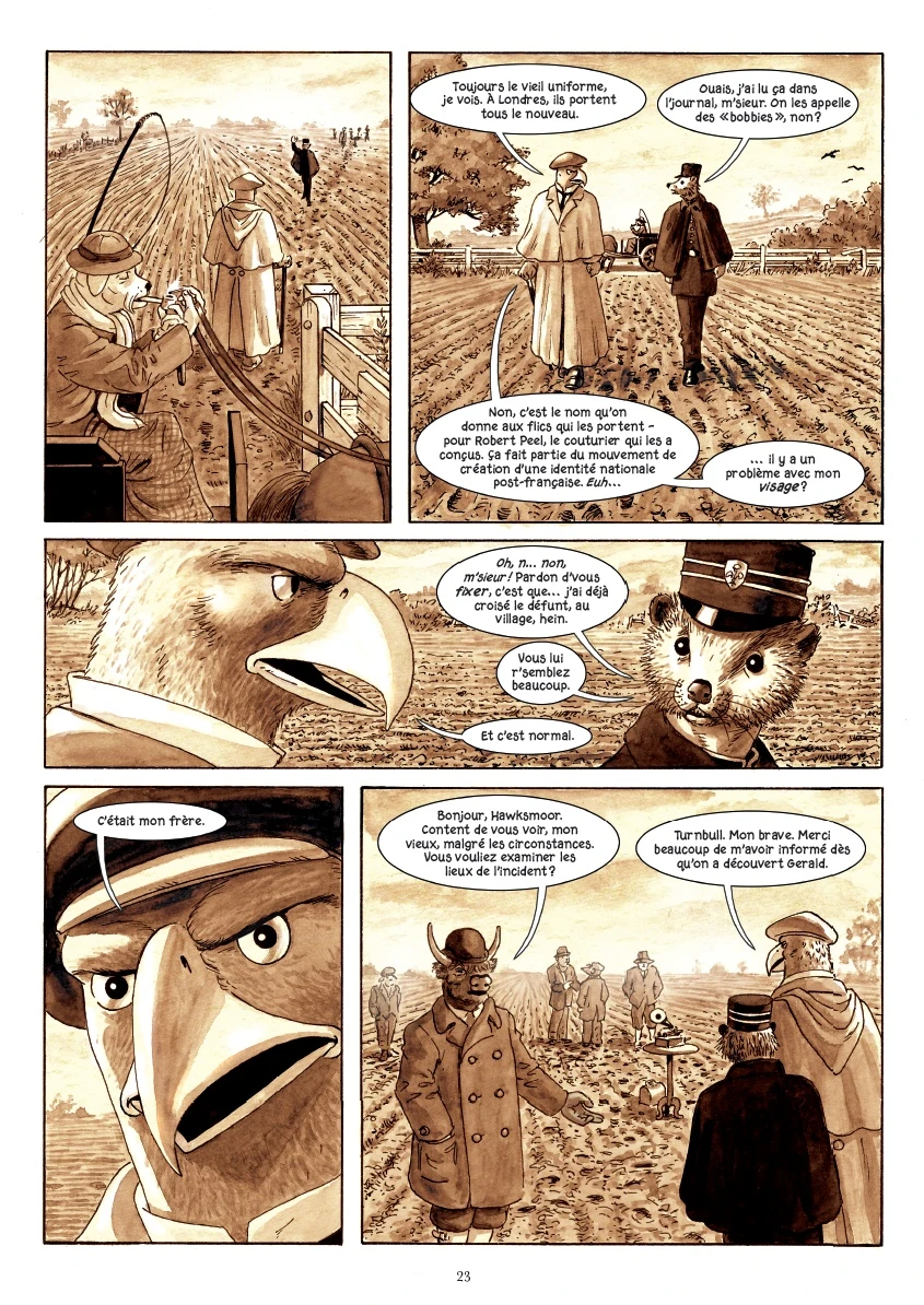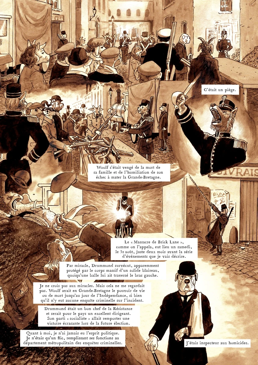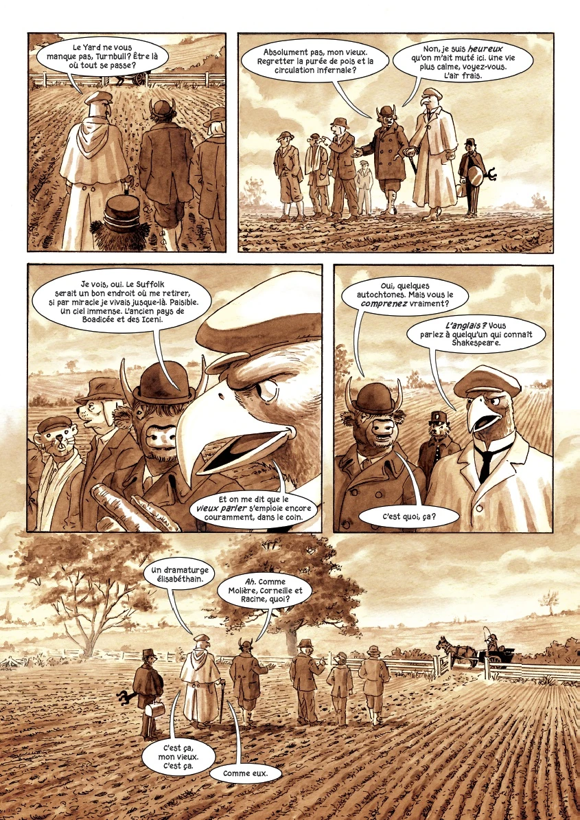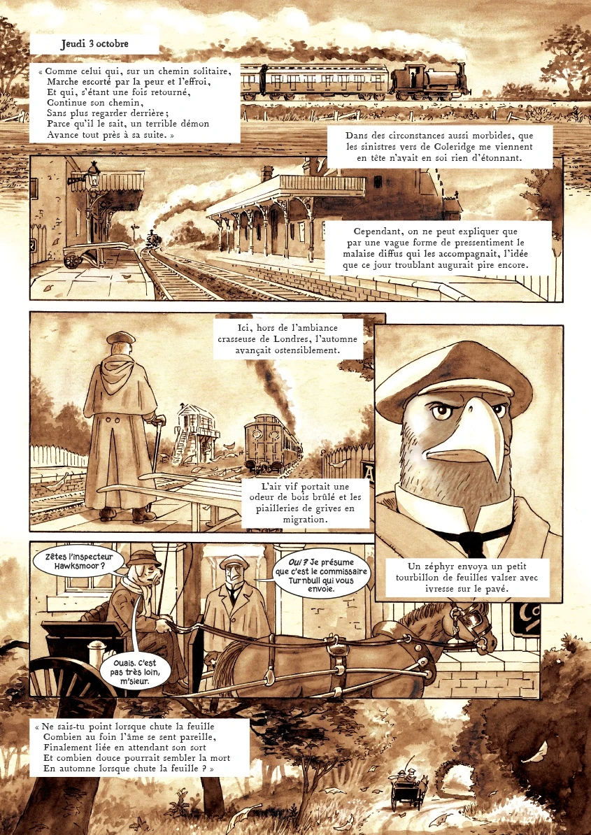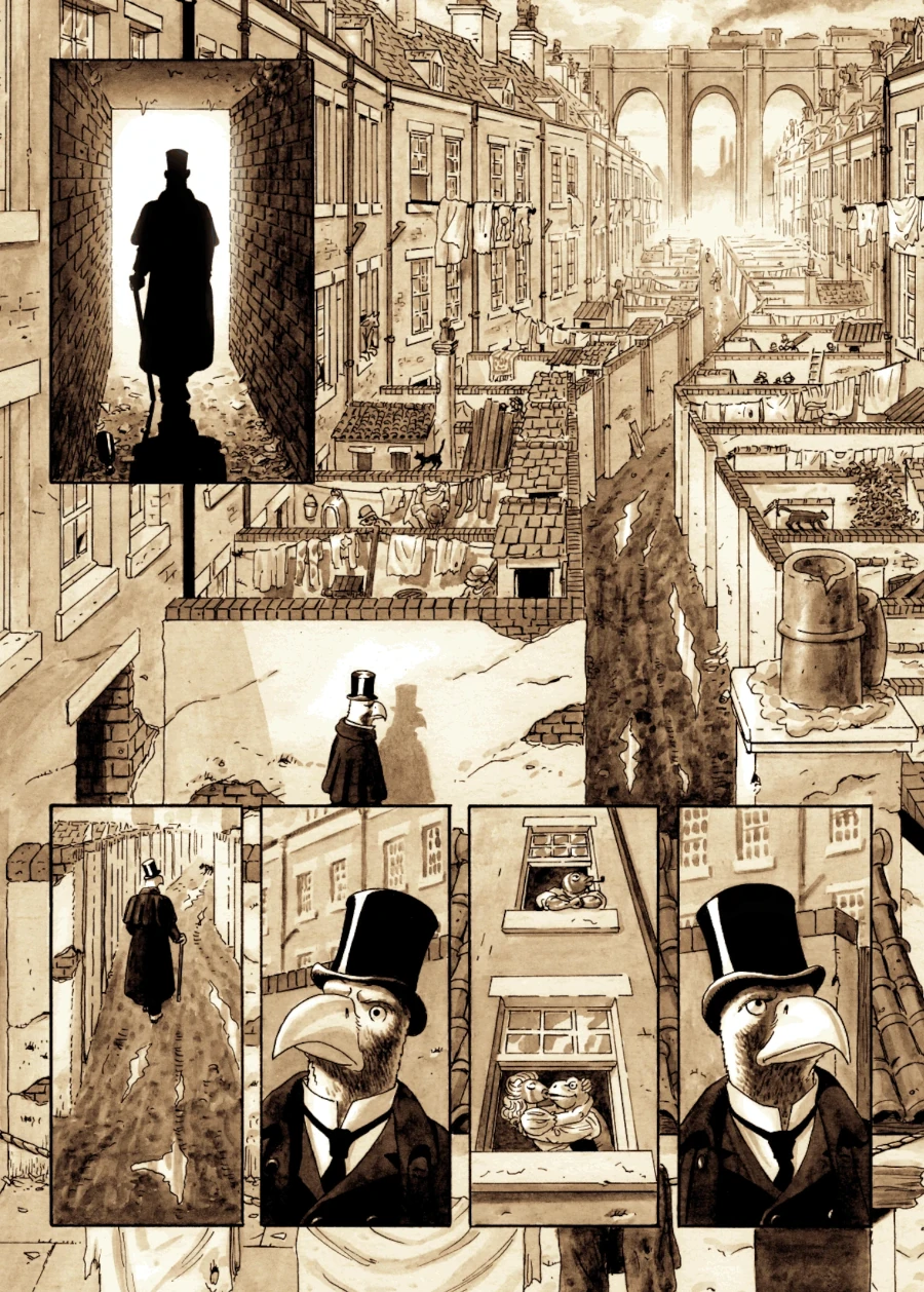 Dire que j’attendais « Les Carnets de Stamford Hawksmoor » avec impatience est un doux euphémisme. J’adore la série mère Grandville, et de manière générale toutes les œuvres de Bryan Talbot. J’avais d’ailleurs longuement interviewé l’auteur à Angoulême en janvier 2024, et découvert la centaine de planches alors réalisées, sur sa tablette… presque 2 ans plus tard, je mets enfin les mains sur l’album, fébrilement, ayant peur d’être déçu, de trop en attendre. Et bien non, ouf. Je précise tout d’abord une chose importante : il n’est absolument pas nécessaire d’avoir lu Grandville pour lire et apprécier cette préquelle. L’histoire est complètement indépendante, et propose une enquête « à la Sherlock » absolument passionnante… les références au personnage de Conan Doyle abondent, à commencer par le nom du protagoniste (Stamford apparait dans le premier roman, « Une étude en rouge »). L’enquête est bien construite et parfaitement narrée, même si sa complexité nécessite une lecture attentive. Comme c’est souvent le cas, Bryan Talbot parsème son récit de parallèles et réflexions sur notre société… les allusions à la catastrophe « Brexit » sont évidentes, mais l’auteur en profite également pour nous donner son avis sur les déboulonnages de statues liées à l'esclavage, par exemple. La mise en image est magnifique. La représentation brumeuse du Londres victorien est des plus réussies, notamment grâce aux superbes couleurs aquarelles sépia, pour un rendu vintage. Les personnages animaliers sont toujours aussi réussis, ainsi que les fiacres Hansom et les costumes d’époque. Voilà, une enquête classique, certes, et parfois difficile à suivre, mais je me suis régalé, et je me prends à rêver d’une suite (même ce n’est pas du tout d’actualité). Un coup de cœur !