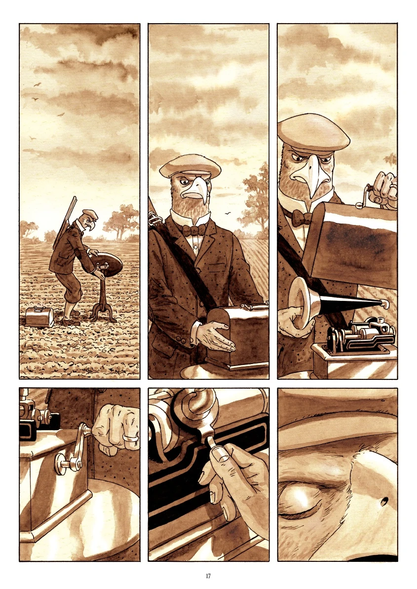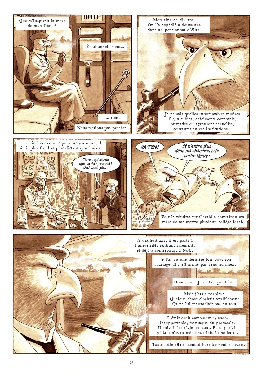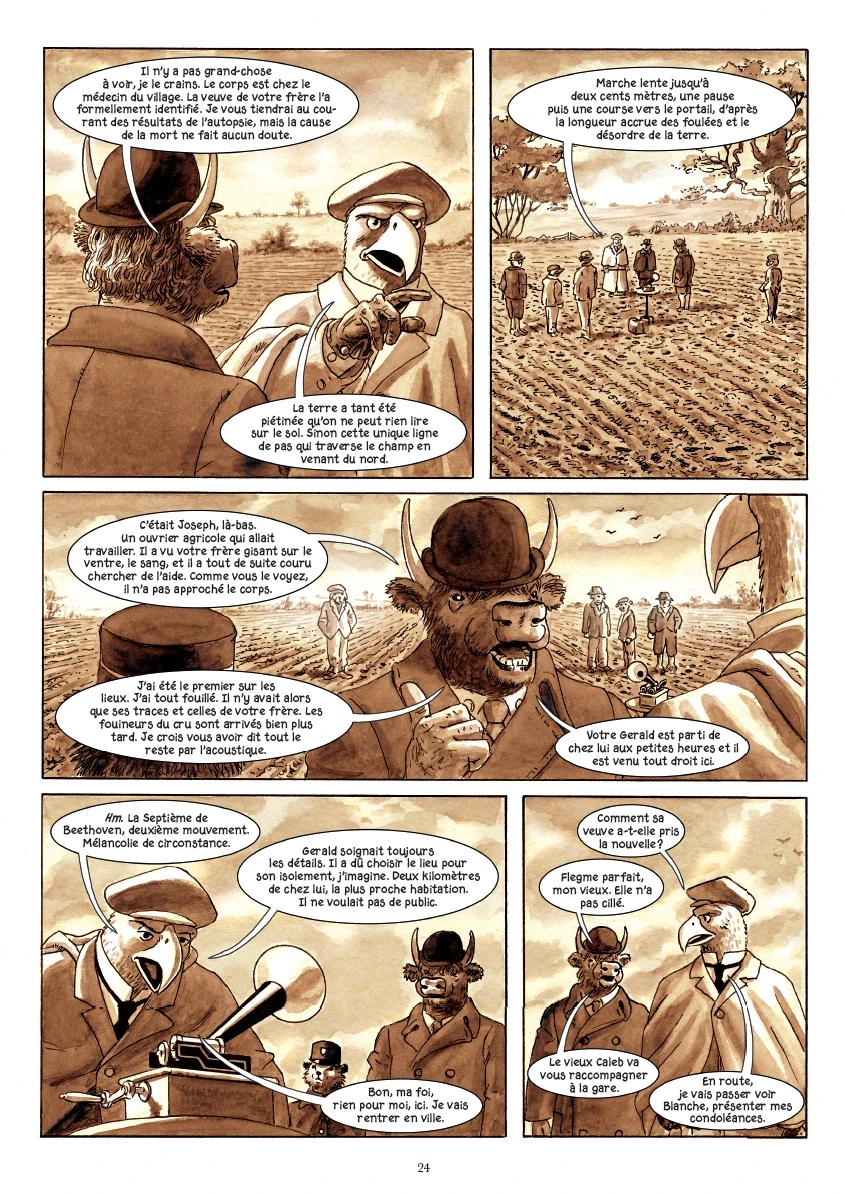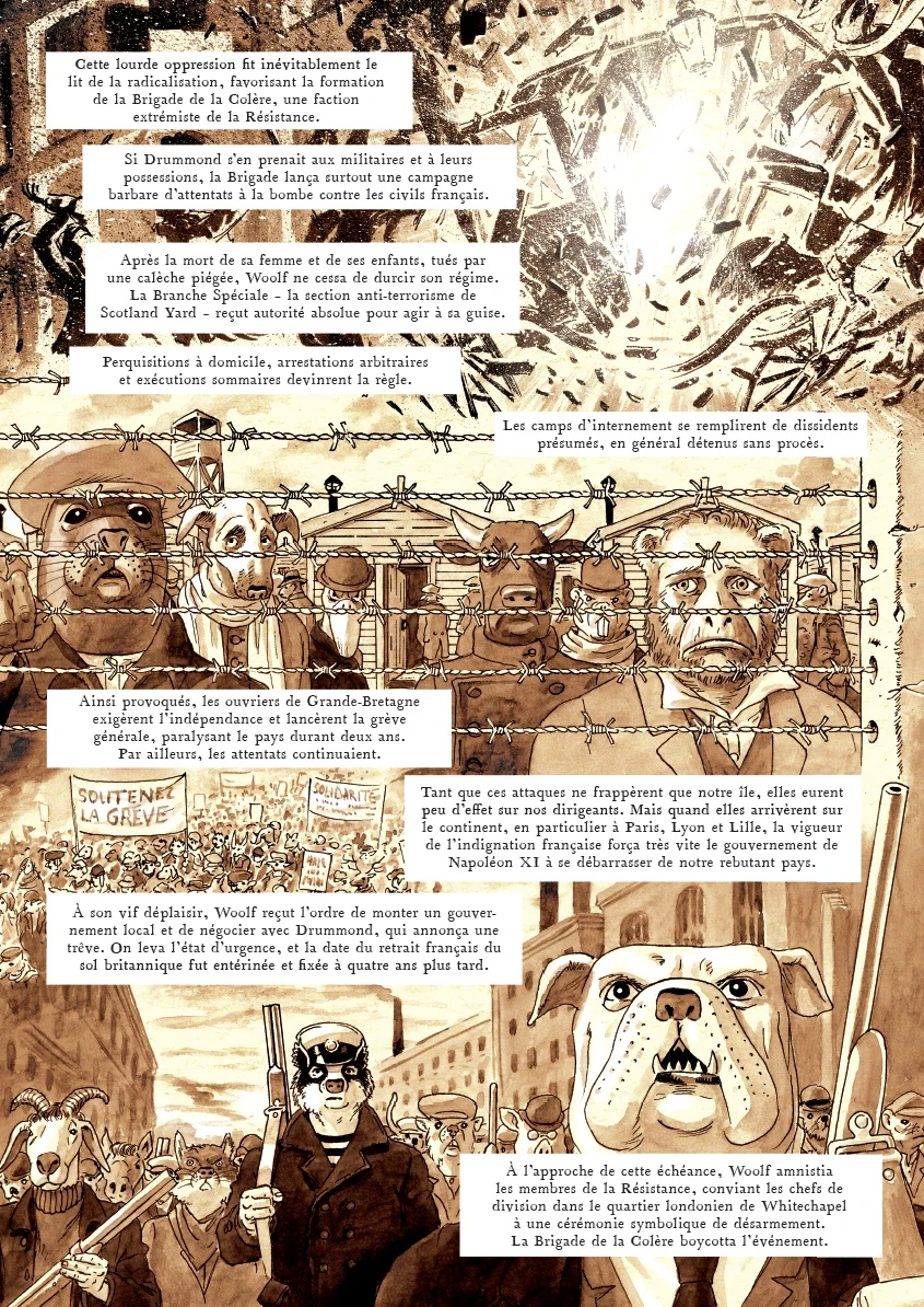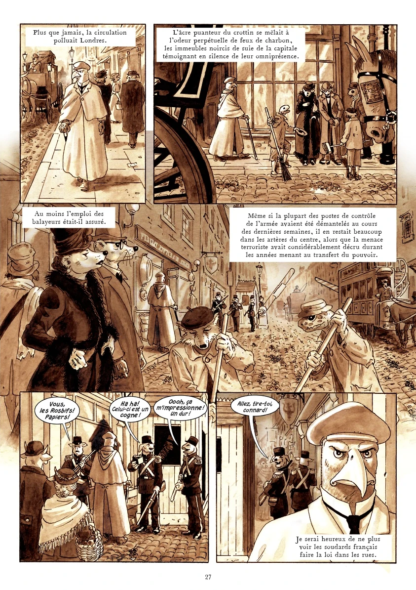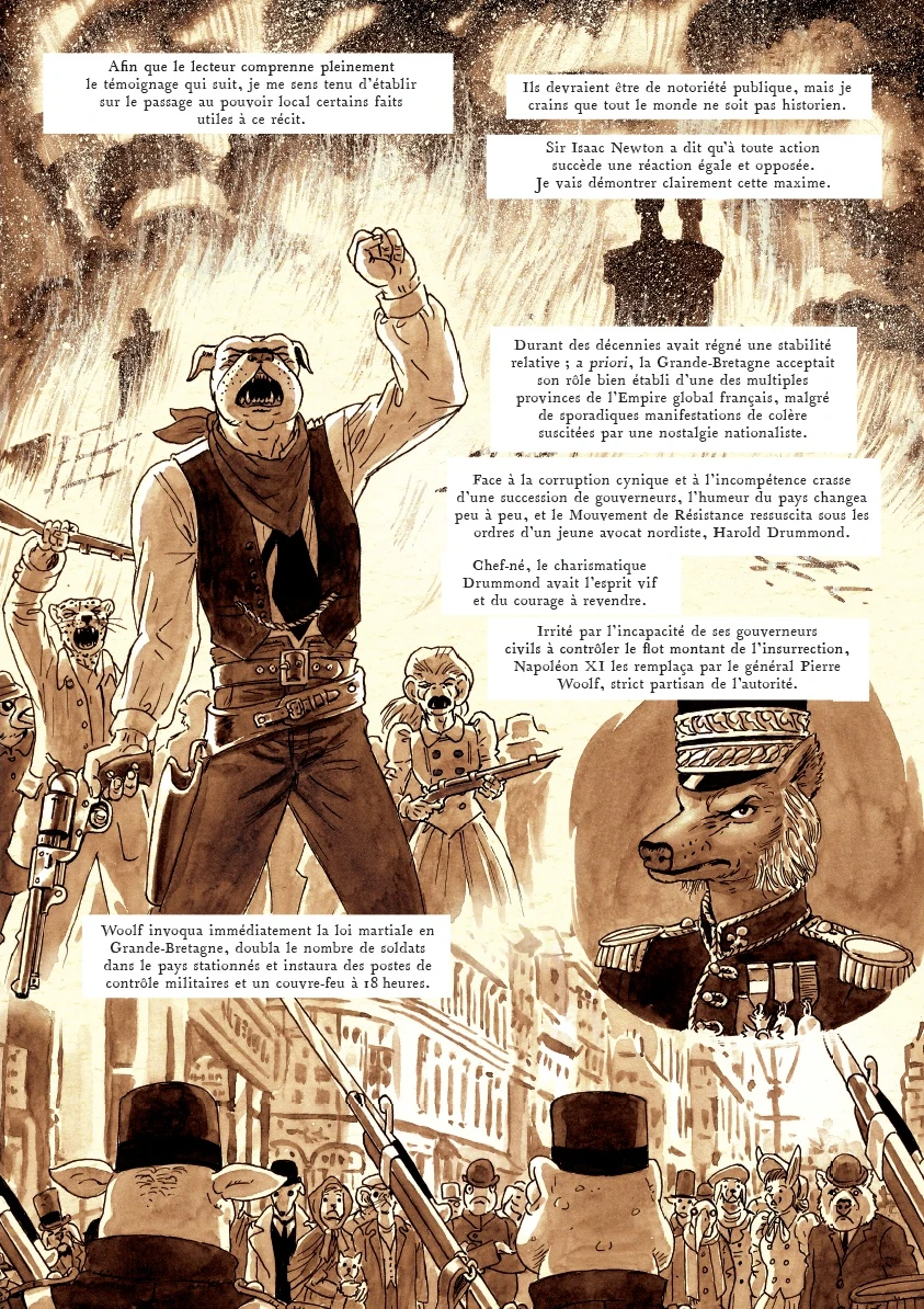 Dire que j’attendais « Les Carnets de Stamford Hawksmoor » avec impatience est un doux euphémisme. J’adore la série mère Grandville, et de manière générale toutes les œuvres de Bryan Talbot. J’avais d’ailleurs longuement interviewé l’auteur à Angoulême en janvier 2024, et découvert la centaine de planches alors réalisées, sur sa tablette… presque 2 ans plus tard, je mets enfin les mains sur l’album, fébrilement, ayant peur d’être déçu, de trop en attendre. Et bien non, ouf. Je précise tout d’abord une chose importante : il n’est absolument pas nécessaire d’avoir lu Grandville pour lire et apprécier cette préquelle. L’histoire est complètement indépendante, et propose une enquête « à la Sherlock » absolument passionnante… les références au personnage de Conan Doyle abondent, à commencer par le nom du protagoniste (Stamford apparait dans le premier roman, « Une étude en rouge »). L’enquête est bien construite et parfaitement narrée, même si sa complexité nécessite une lecture attentive. Comme c’est souvent le cas, Bryan Talbot parsème son récit de parallèles et réflexions sur notre société… les allusions à la catastrophe « Brexit » sont évidentes, mais l’auteur en profite également pour nous donner son avis sur les déboulonnages de statues liées à l'esclavage, par exemple. La mise en image est magnifique. La représentation brumeuse du Londres victorien est des plus réussies, notamment grâce aux superbes couleurs aquarelles sépia, pour un rendu vintage. Les personnages animaliers sont toujours aussi réussis, ainsi que les fiacres Hansom et les costumes d’époque. Voilà, une enquête classique, certes, et parfois difficile à suivre, mais je me suis régalé, et je me prends à rêver d’une suite (même ce n’est pas du tout d’actualité). Un coup de cœur !