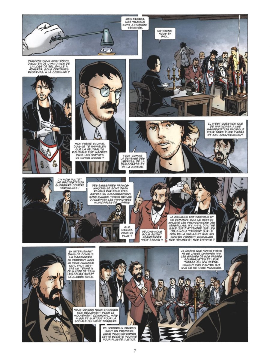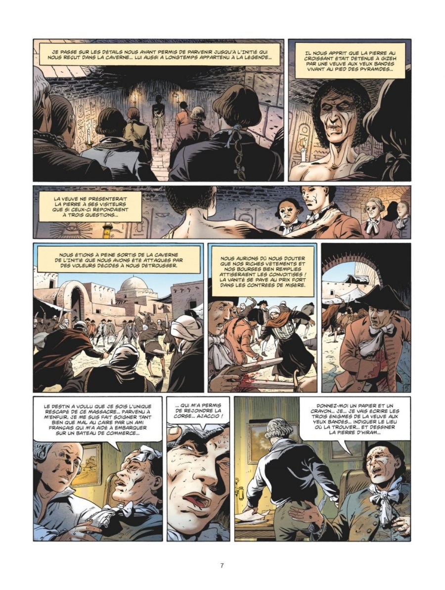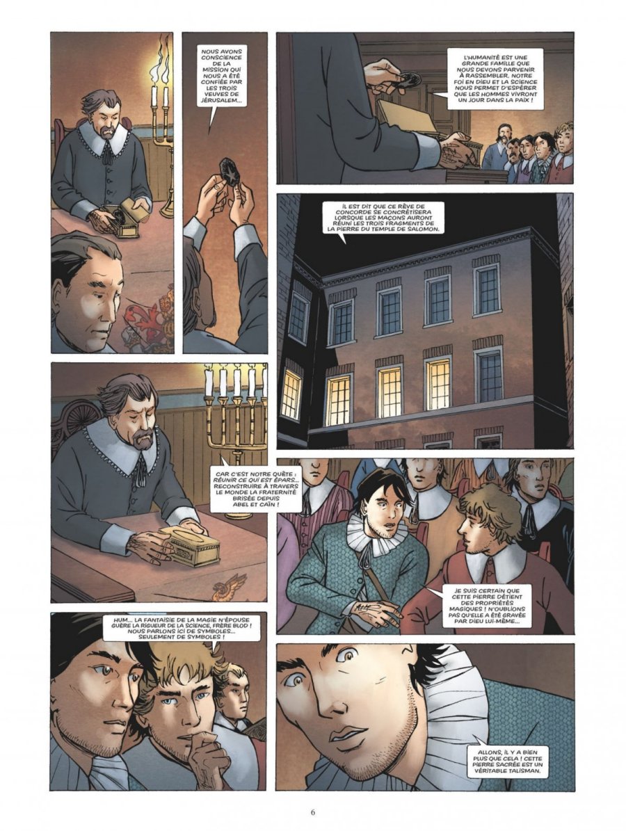 Cette longue saga retrace l'histoire de la Franc-Maçonnerie tout en explorant certaines de ses légendes. Le premier tome se déroule dans le royaume du roi Salomon et pose les bases du mythe. Dès le deuxième, le récit nous transporte au XIIIe siècle avant de progresser de quelques décennies à chaque volume, avec à chaque fois de nouveaux protagonistes et des moments marquants de l'histoire maçonnique. Seul fil conducteur : une pierre sacrée divisée en trois fragments, transmise d'initié en initié à travers les siècles avant d'être enfin réunie en Israël. Didier Convard reste le maître d'œuvre de la série, mais il délègue le scénario de plusieurs albums à d'autres auteurs, tandis que le dessin est confié à différents illustrateurs, chacun réalisant un ou plusieurs tomes. Les douze premières couvertures, signées Julien Delval (relayé par Paolo Grella au treizième volume), sont superbes : de grandes fresques peintes, détaillées et évocatrices, qui captent immédiatement le regard. Malheureusement, les planches intérieures, réalisées par d'autres artistes, s'avèrent inégales et décevantes en comparaison. Les décors et architectures sont généralement réussis, mais les visages manquent trop souvent de justesse. Le résultat est frustrant, même si la narration visuelle demeure fluide. Chaque tome propose une intrigue autonome centrée sur une époque et un lieu précis. L'ensemble est assez instructif d'un point de vue historique, montrant comment la Franc-Maçonnerie s'est formée, s'est développée et a été menacée. Cette chronique secrète se mêle à la grande Histoire, mais le mélange de mythe et de réalité brouille parfois les repères. Certaines envolées mystiques ou éléments fantastiques s'intègrent mal aux passages plus réalistes, ce qui nuit à la crédibilité du récit. C'est particulièrement vrai pour l'intrigue des pierres sacrées, pure invention scénaristique qui n'apporte qu'une touche d'idolâtrie et de spectaculaire, comme pour flatter un ésotérisme de façade. Plusieurs tomes reposent en outre sur des intrigues secondaires à base de complots, enquêtes ou mystères, qui peinent à convaincre et donnent souvent l'impression d'un suspense artificiel destiné à masquer l'aspect documentaire. Enfin, comme lors de ma lecture de La Franc-maçonnerie dévoilée, je n'ai pas trouvé de réponse satisfaisante à une question essentielle : quel est le véritable sens de ces loges ? Quelles motivations poussent leurs membres à se regrouper dans une confrérie empreinte de rituels et de secrets convenus ? Mes déceptions sont multiples, qu'il s'agisse du contraste entre les couvertures somptueuses et les planches inégales, ou de cet ésotérisme naïf et artificiel qui affaiblit le propos. Mais la série conserve un intérêt documentaire certain, offrant un éclairage original sur l'histoire et l'évolution de la Franc-Maçonnerie à travers les siècles et les grands événements du monde. Note : 2,5/5