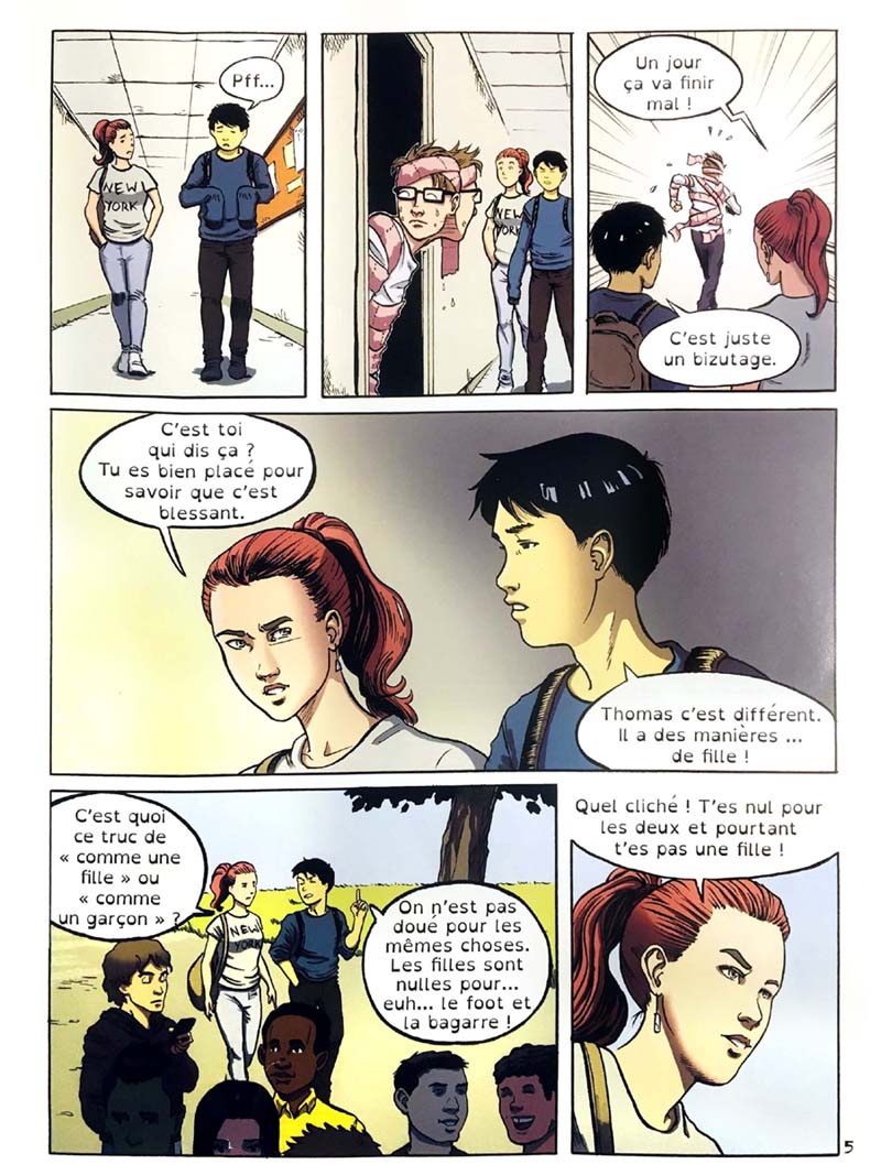 Je suis embêté pour noter cette BD ... C'est typiquement le genre de BD que je m'attends à voir dans un CDI à côté de celle expliquant la JAPD et une autre sur l'engagement citoyen. C'est très plat, très fade et très bienveillant. Ce qui est dommage, avec une sympathique idée de faire une BD également facile à lire aux dyslexiques. Pour expliquer brièvement, la BD part d'un bon sentiment : expliquer les soucis que posent le genre, avec cette idée de "pour fille" et "pour garçon" qui est démonté en expliquant que ce sont des idées bêtes qu'il faut dépasser. La BD lie ça aussi à l'exclusion sociale et au harcèlement, ce qui est sympathique. Mais soyons honnête, la BD ne va pas bien loin. En 48 pages pas grand chose ne se développe, les personnages sont à peine esquissés et les situations sont stéréotypés, le message est à peine développé et on reste dans du consensuel qui se finit sur une phrase qui fait franchement un peu bête ... En fait la BD a deux soucis : elle veut poser un propos développé et complexe, mais elle n'a pas le temps. Et deuxièmement, elle veut trop être consensuelle pour arriver à bien traiter son sujet. Le harcèlement scolaire, les préjugés de genre, la question des violences scolaires, tout ça ne peut pas être traité facilement ou légèrement. Et la BD ne peut pas réussir à concilier tout ça en un seul tome (qui aurait du avoir une suite, si j'ai bien compris). Donc voila, une BD imparfaite, légère et un peu trop pétri de bons sentiments sur un sujet difficile. C'est mignon, trop peut-être, mais oubliable aussi. Je ne recommanderais pas.