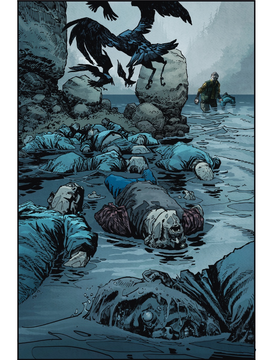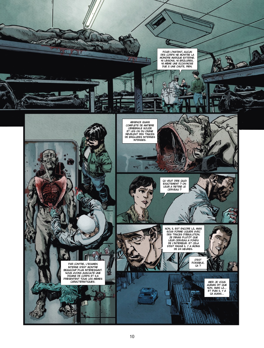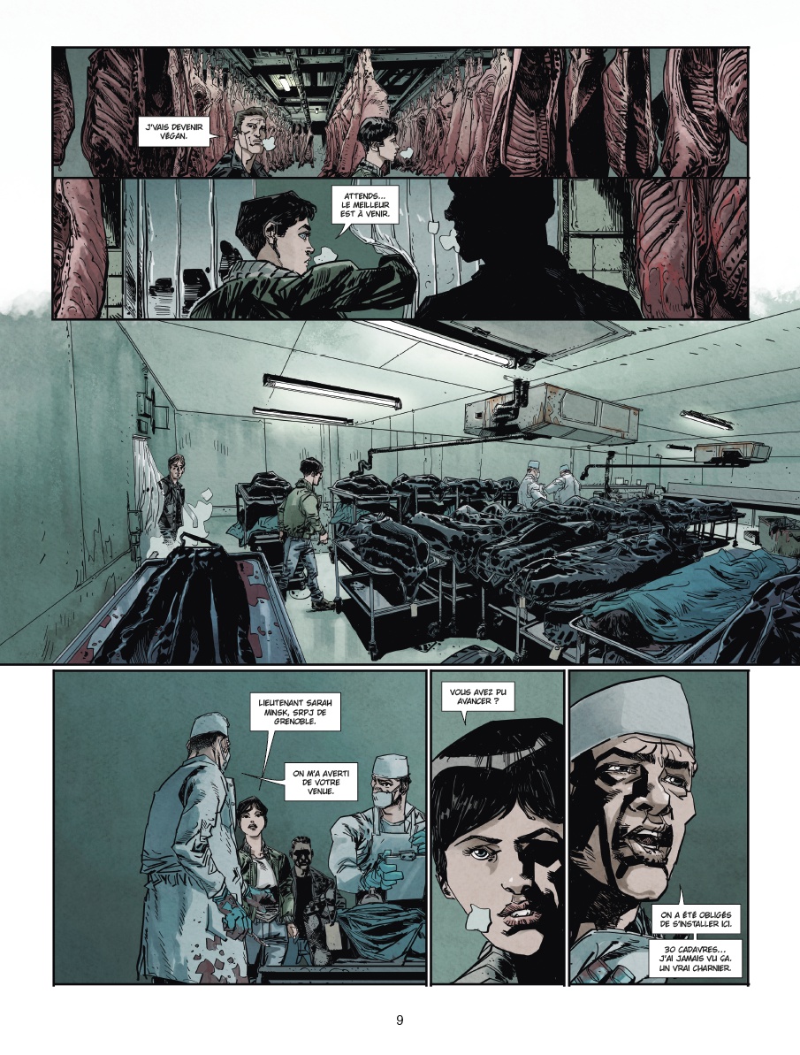 Nul besoin de présenter Franck Thilliez qui co signe ce scénario inédit avec Niko Tackian. Son simple nom sur la couverture, c'est la promesse d'un thriller haletant, tant les romans du scénariste sont généralement des pages-turner. Cette histoire commence comme un polar, avec la découverte de nombreux cadavres dépourvus de cerveaux et l'arrivée d'une enquêtrice pour démêler l'affaire. Mais le récit va vite prendre une tournure fantastique autour d'un mystérieux village qui semble apparaitre subitement, puis disparaitre tout aussi brutalement qu'il est arrivé. Quel est le lien entre cet étrange village et ces cadavres ? C'est là le sel de notre histoire. Cette enquête va conduire à pas mal de découvertes : des évènements de plus en plus mystérieux, des secrets passés, des explications ésotériques, une version scientifique pour donner du sens à tout ça. L'intrigue oscille entre ces différents pans en gardant en fil rouge l'enquête sur ces morts mystérieuses. Cela donne un tout cohérent où le niveau de suspens se tient bien et suscite la curiosité et l'envie de connaitre le dénouement. Sans spoiler il y aura quelques éléments un peu gros, qui dépassent le cadre de notre récit fantastique et qui tirent presque vers la science-fiction. Cette sensation de presque too much disparait à l'arrivée de la conclusion. Sombre et pessimiste, elle brille par la raisonnance qu'elle trouve avec des problématiques bien contemporaines. J'ai trouvé cette fin percutante. Dure mais marquante. Graphiquement, on a une ambiance assez sombre, nécessaire pour coller à ce récit très noir. Malheureusement certains visages souffrent un peu d'imprécision dans le trait, et combiné à la noirceur des couleurs on a parfois du mal à reconnaitre certains personnages. Et c'est le seul petit bémol. Car même si le niveau de tension est variable, et qu'on n'a pas toujours le page turner attendu, au final ce village propose une histoire qui reste dans la tête une fois l'album refermé. Une lecture qui ne m'a pas laissé indifférent, et qui appellera sans aucun doute une relecture prochaine.