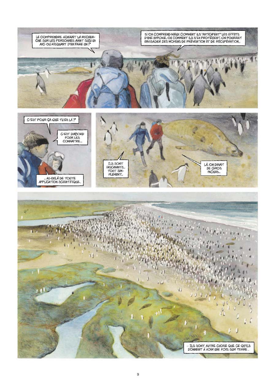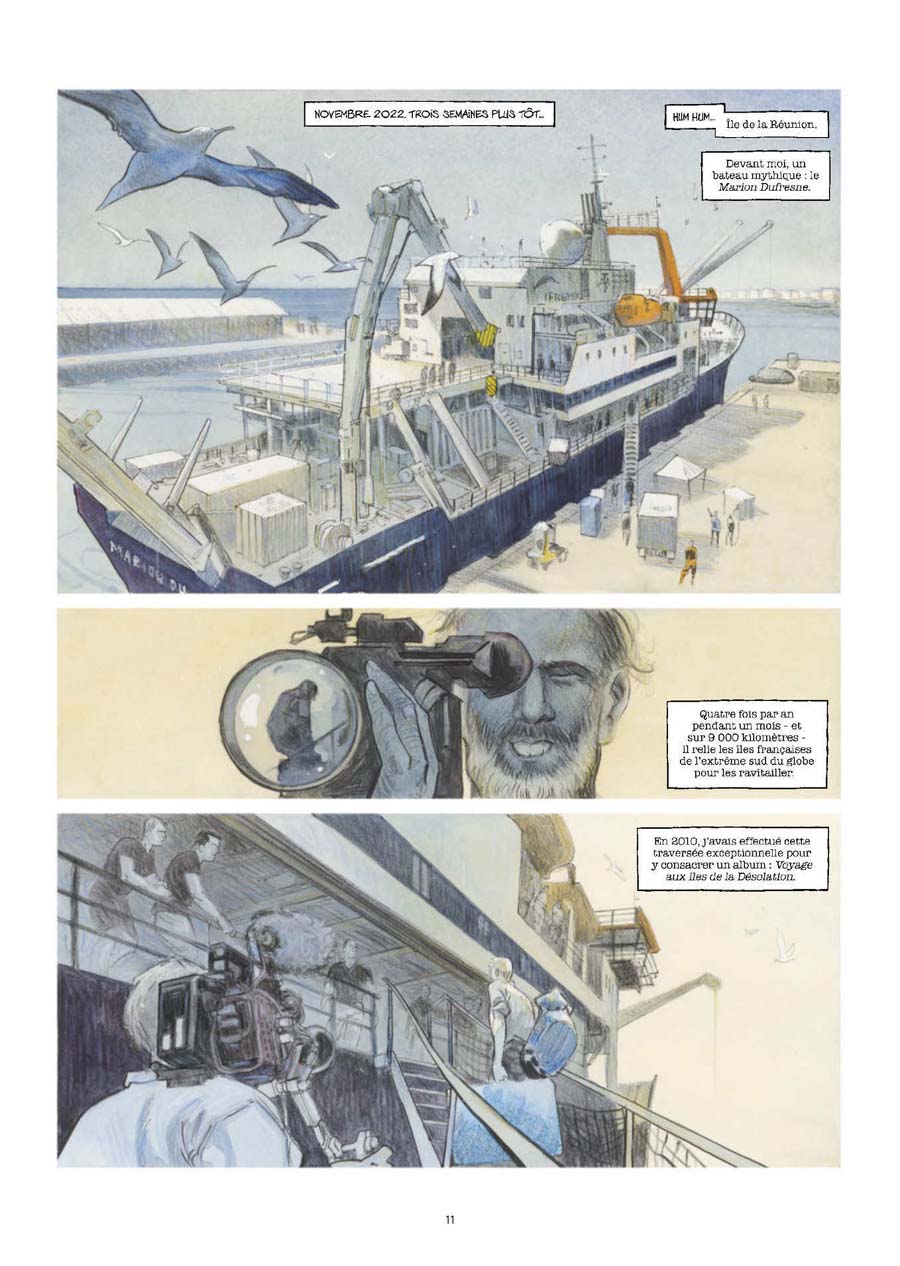 Pour lui c'est aussi l'envie de vivre le quotidien de ces reclus volontaires, soudés par la rudesse du climat, qui inventent d'autres façons de vivre ensemble. Mais Emmanuel n'est plus ce jeune dessinateur inconnu qui est monté à bord du Marion Dufresne en 2010. Son livre, Voyages aux îles de la désolation, est un "best-seller" qui est connu de tous là-bas. Il a même suscité des vocations ! Ensuite, il est accompagné pour ce voyage par une équipe de télévision d'Arte qui réalise un reportage sur Kerguelen dont il est le personnage central. Sur le bateau, Emmanuel se demande s'il arrivera à profiter pleinement de ce deuxième voyage qu'il attendait depuis longtemps... Emmanuel Lepage revient au récit de voyage avec l'envie de montrer les changements déjà à l'oeuvre sur ces terres éloignées en raison du réchauffement climatique. Et pour témoigner aussi de l'évolution de la société qui imprègne ces communautés des terres australes, de la manière dont les scientifiques travaillent sur place et vivent ensemble dans un climat extrême. Pour raconter ce long voyage effectué en 2022-2023, Lepage livre des planches d'une immense beauté, en grand format, pour représenter la nature en majesté.