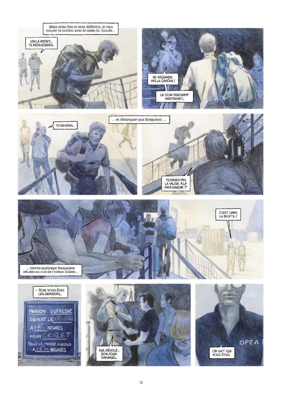 Après le très réussi Voyage aux îles de la Désolation (que je relis souvent), Lepage revient douze plus tard, avec ce nouvel album, qui retrace son nouveau voyage aux îles Kerguelen; Le dessin est toujours aussi somptueux avec des pleines planches ou demi-planches d'une beauté à tomber par terre. J'ai pris mon temps pour lire cette bande dessinée, mais j'avoue vers la fin avoir tourné les pages rapidement. Là où "les îles de la Désolation" m'avait enchanté avec ses paysages, , l'histoire des premiers aventuriers, cet album a fini par me lasser. En fin de compte, j'ai du mal à me faire opinion sur cet album. Peut-être que le livre tourne autour de trop de personnages, que cela en donne le tournis ! On ne sait plus qui est qui et j'ai du mal avoir une empathie avec tous ces protagonistes, seul le personnage d'Alexis m'a touché. En voulant donner la parole aux nombreux acteurs de terrain, Lepage rate un peu le but d'un tel ouvrage , celui de nous faire rêver... Graphiquement superbe, je suis assez réservé sur le fond