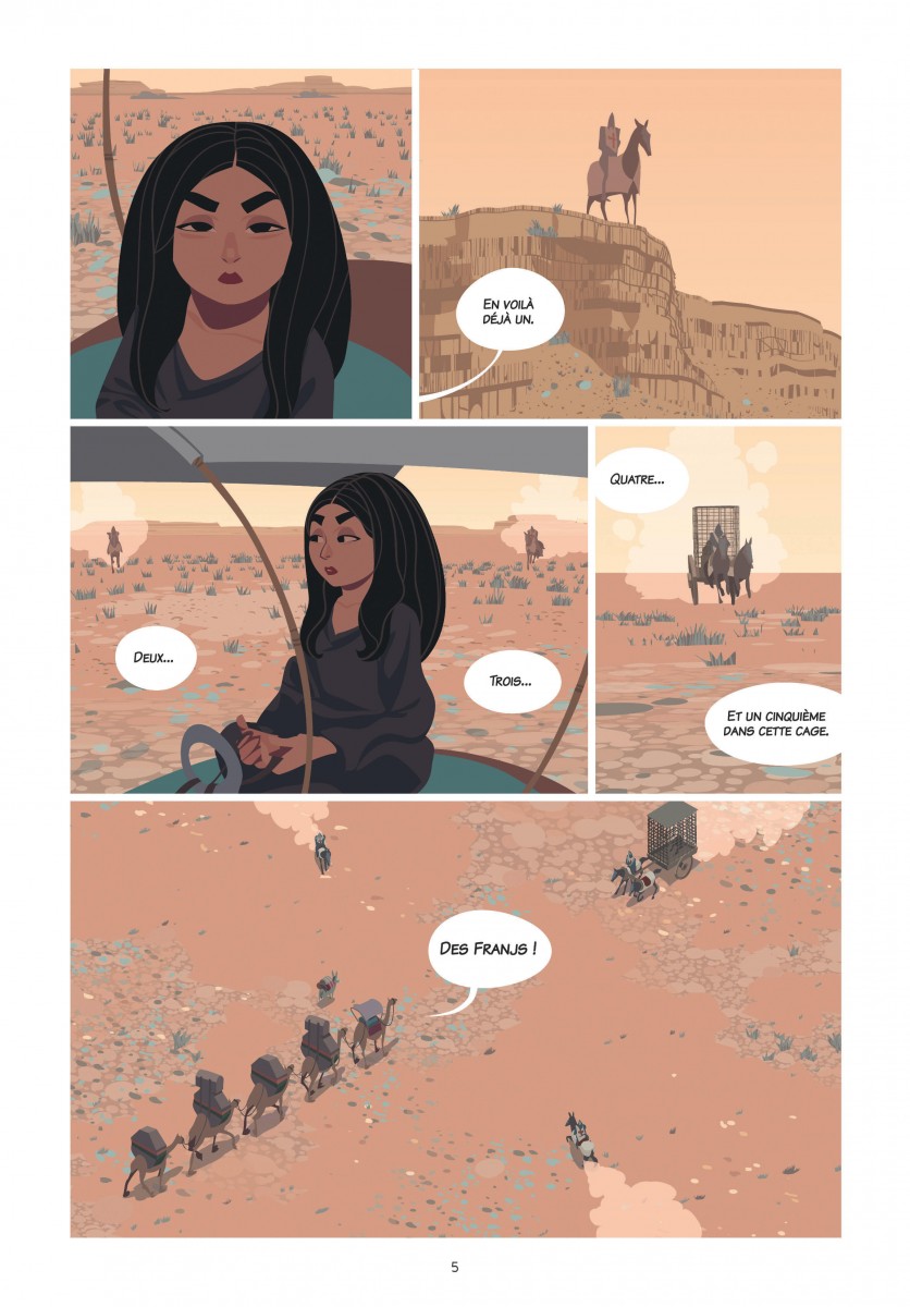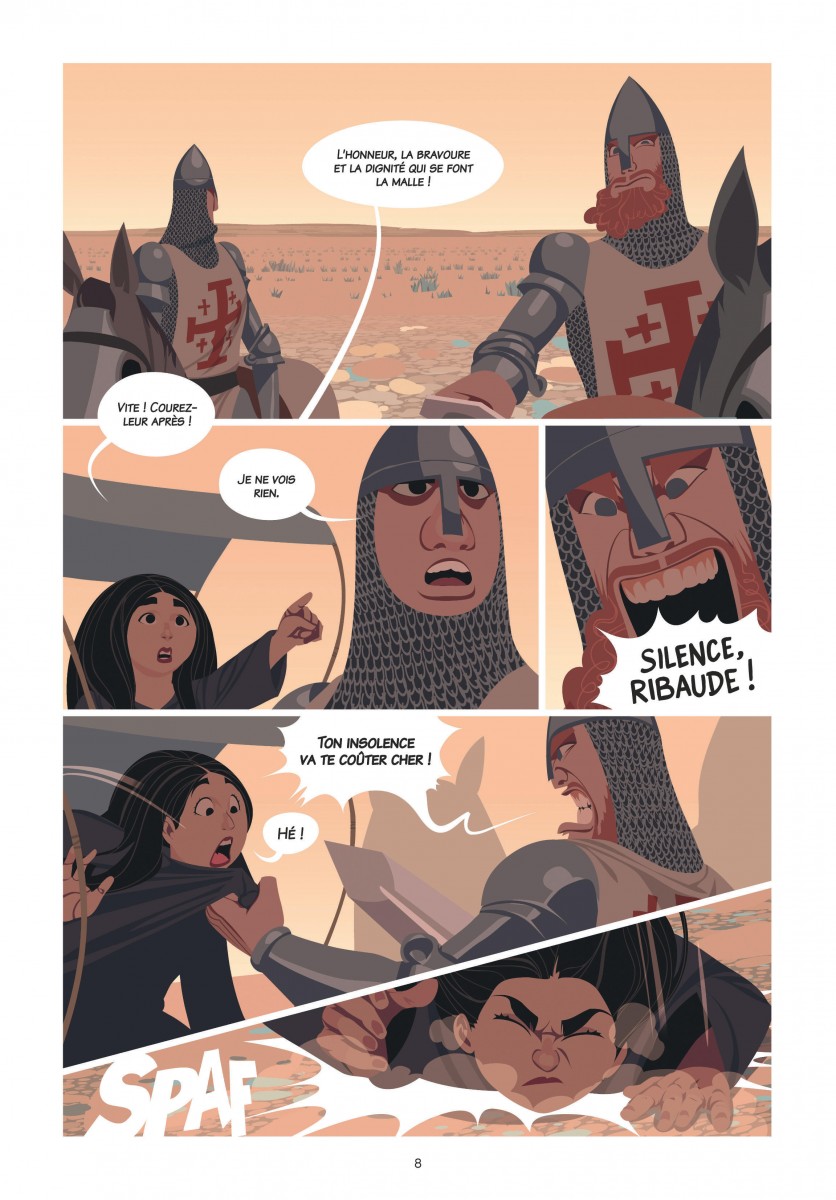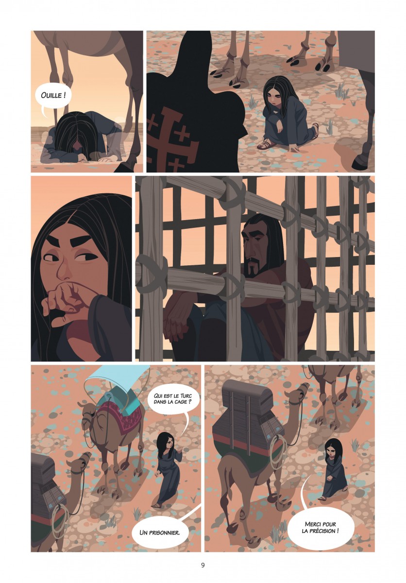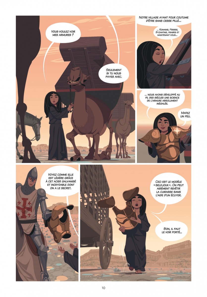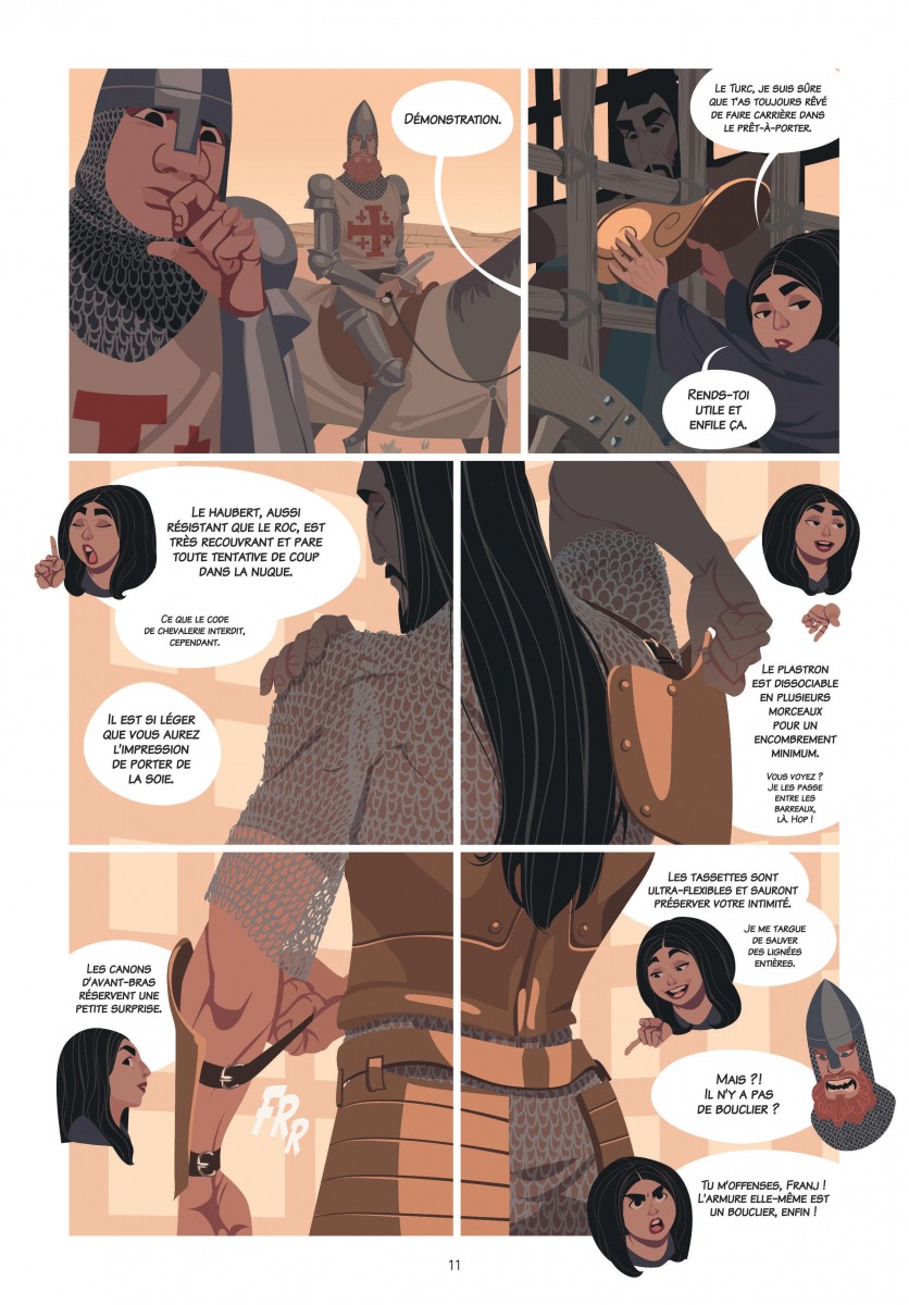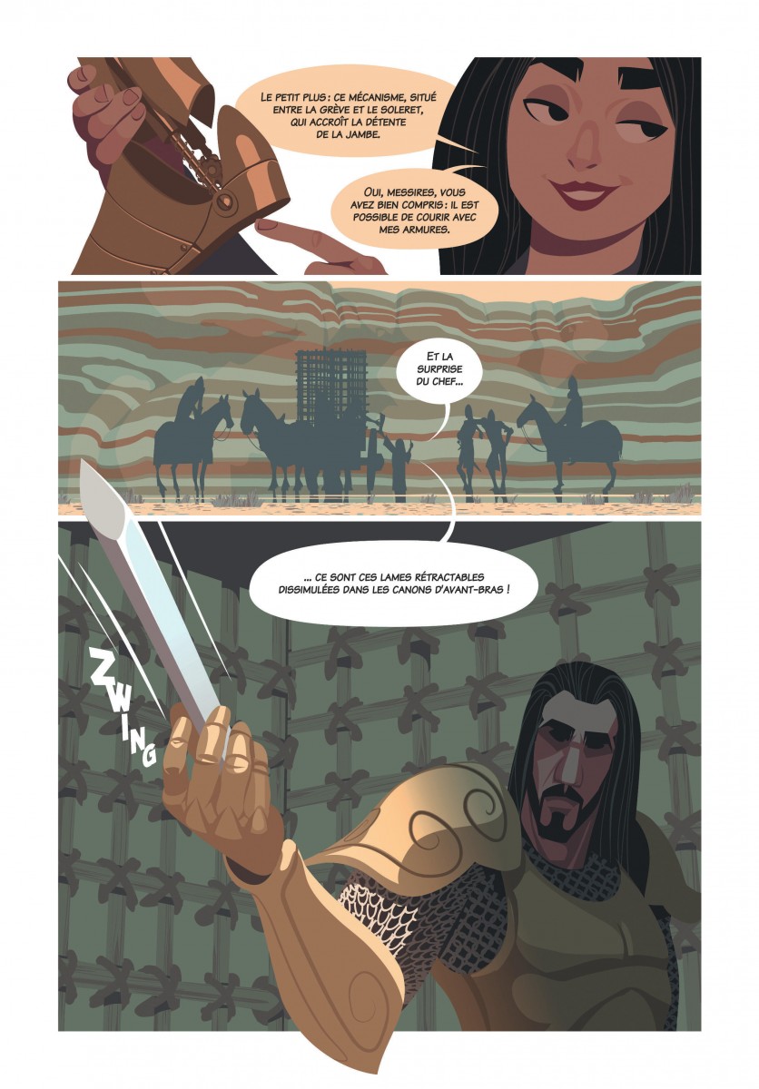 Les 7 mercenaires au temps des Croisades ! À la fin du XIIe siècle, une jeune forgeronne se rend à Jérusalem pour recruter des chevaliers capables de défendre son village contre des croisés sans scrupules. Sa seule monnaie d'échange : des armures d'une qualité exceptionnelle qu'elle est la seule à savoir forger. En chemin, elle réunit une équipe hétéroclite de combattants venus d'horizons très divers, qui acceptent de la suivre et de se battre à ses côtés. Voilà une publication des plus réjouissantes. Certes, le schéma des 7 mercenaires a été exploité maintes fois, mais le transposer dans le royaume de Jérusalem, véritable carrefour où se côtoyaient Européens, Africains, Nizârites, Mongols ou Tatars, offre un terrain culturel riche et propice à un récit haut en couleurs. Et confié à Arthur de Pins, le concept fonctionne d'autant mieux. Son graphisme fait toujours mouche. Il s'éloigne ici un peu de l'esthétique très numérique de Zombillénium : pas de dégradés, et la 3D n'apparaît que dans certains décors, tandis que les personnages et l'essentiel des planches adoptent un rendu en aplats, plus sobre visuellement mais tout aussi efficace. L'auteur s'autorise en prime plusieurs compositions d'une grande élégance, proches d'illustrations d'artistes conceptuels. La narration, elle aussi, apporte une vraie fraîcheur. Malgré un cadre historique soigné et quasiment dépourvu d'anachronismes, les dialogues adoptent une vivacité très contemporaine, presque cinématographique. Le rythme est excellent, soutenu par une galerie de personnages réussie, par la personnalité forte de la forgeronne qui les rassemble et par un zeste d'humour bienvenu dans la mise en scène. L'intrigue principale reste simple et rappelle les exactions commises par certains croisés en Terre sainte, mais elle s'enrichit de sous-intrigues bien dosées qui maintiennent l'intérêt et donnent envie d'avancer. C'est une BD très aboutie et particulièrement plaisante.