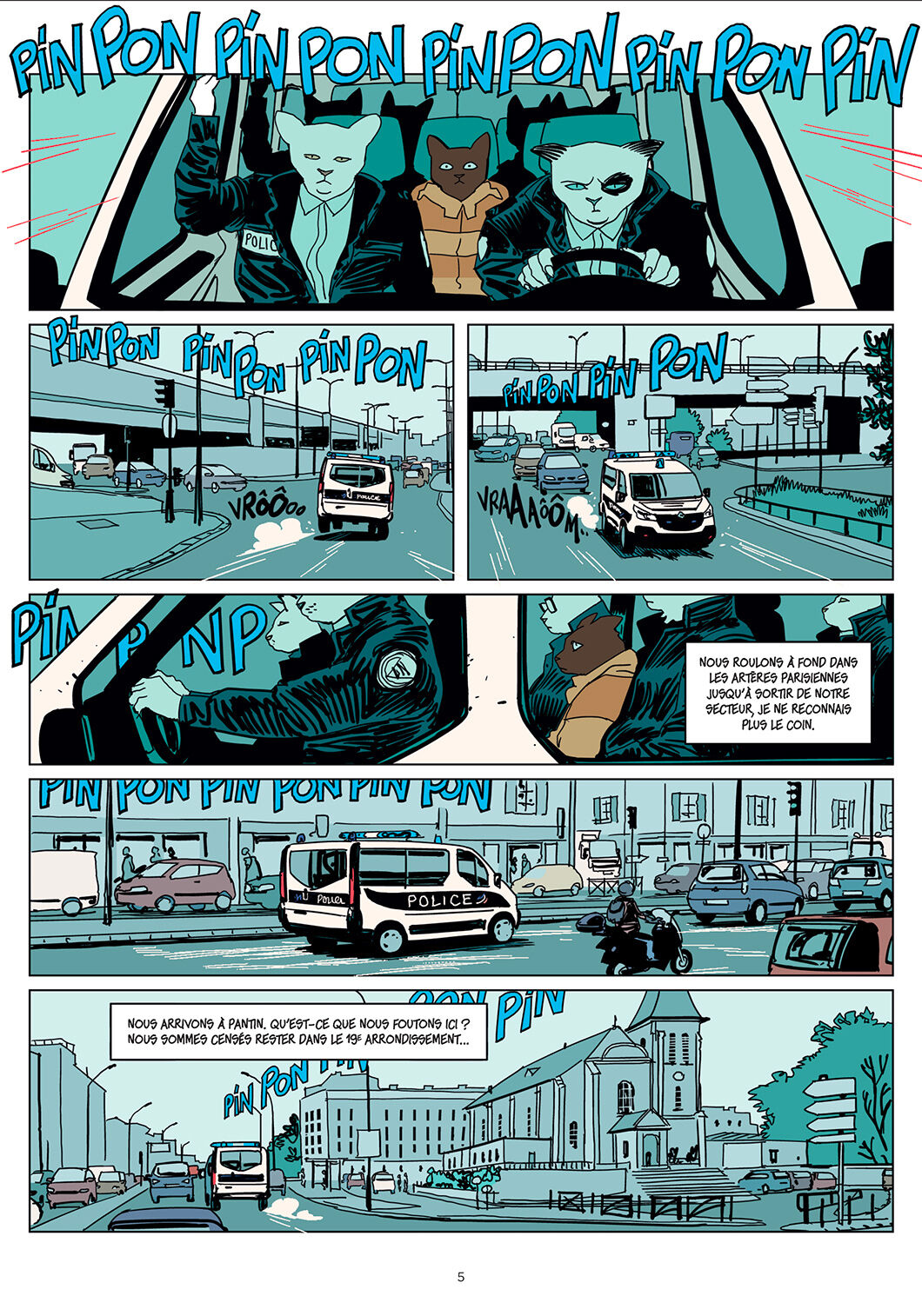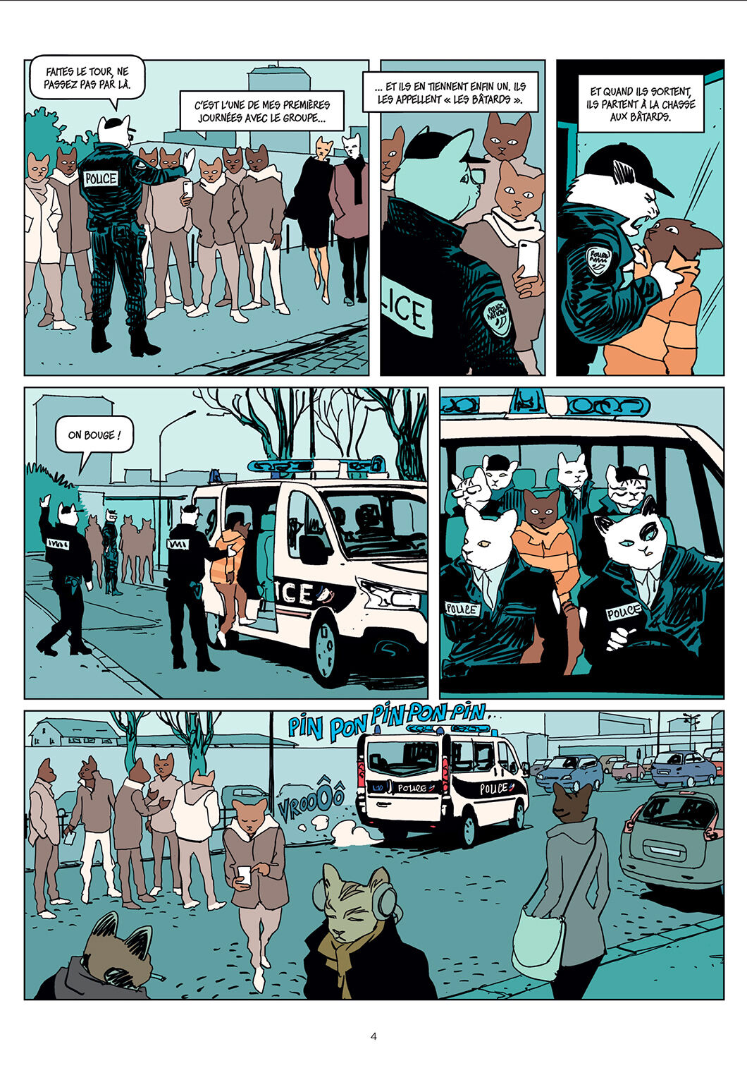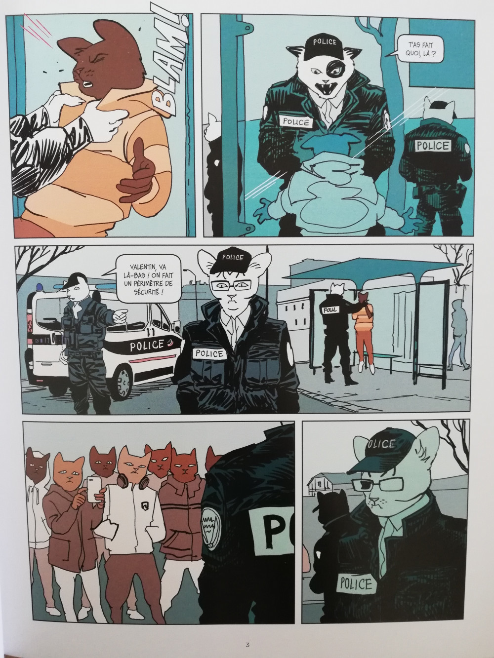 J’avais un peu suivi le buzz médiatique qui avait suivi la parution du bouquin – buzz tout relatif, tant les scandales évoqués dans cette enquête n’ont finalement pas donné grand-chose en matière de suites judiciaires et de réforme en profondeur. Cet album adapte la longue enquête en immersion de Valentin Gendrot dans un commissariat parisien. Et ce qu’il nous montre est édifiant. La formation minuscule de beaucoup de policiers (j’ai ainsi appris qu’il a divers statuts – et donc temps de formation (et rémunération…) – différents. Mais aussi et surtout (et cela est une des conséquences du point précédent) une banalisation de certains comportements : racisme, violence, politique du chiffre, etc. Et ce dans une totale impunité, au point qu’on peut parler de problème systémique, et non de « brebis galeuses » ou de « bavures ». C’est un documentaire à charges, mais circonstancié, rien n’a été inventé. Hélas. Cette violence, soutenue par la hiérarchie – tant qu’elle est tournée essentiellement contre certaines catégories (immigrés, jeunes des cités, contestataires, etc.), et par les pouvoirs politiques (Darmanin, ou Macron), pose des questions concernant l’intégrité de la démocratie. L’enquête est intéressante, la narration factuelle. Pas emballante, mais fluide. Le dessin de Chavant est lisible, même s’il n’est pas obligatoirement ma tasse de thé. J’ai été surpris qu’il utilise des personnages animaliers (tous des félins). Je ne suis pas sûr que ce soit ici une bonne idée. Si sur Blacksad ça fonctionne (avec le dessin de Guarnido en plus, il faut dire), sur un documentaire, et non un récit imaginaire, ça peut avoir tendance à diminuer la charge du documentaire, alors que les faits sont tout ce qu’il y a de réels.
