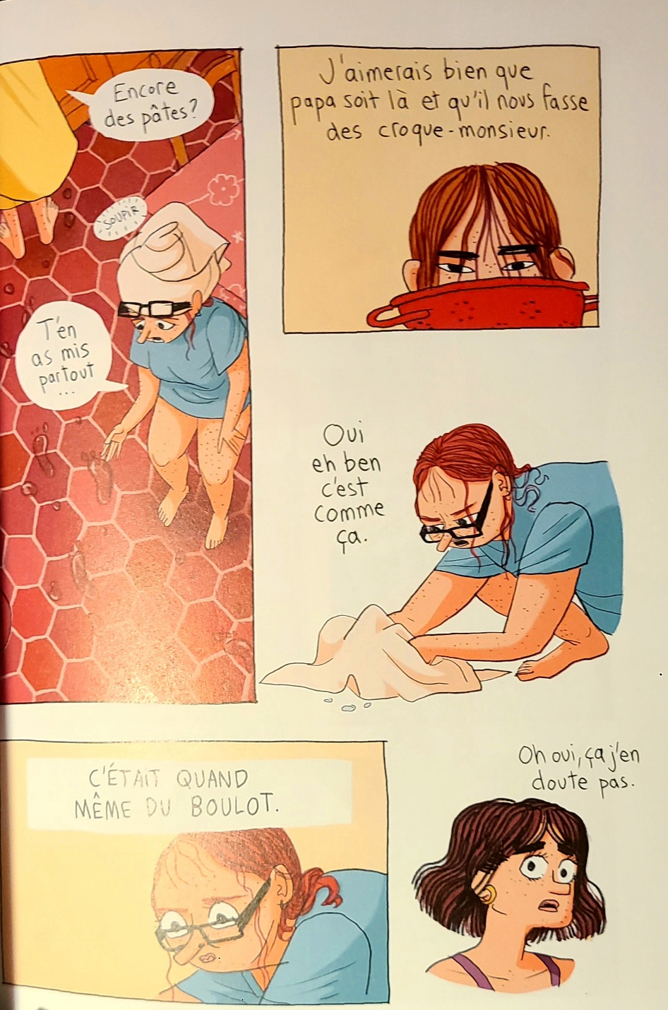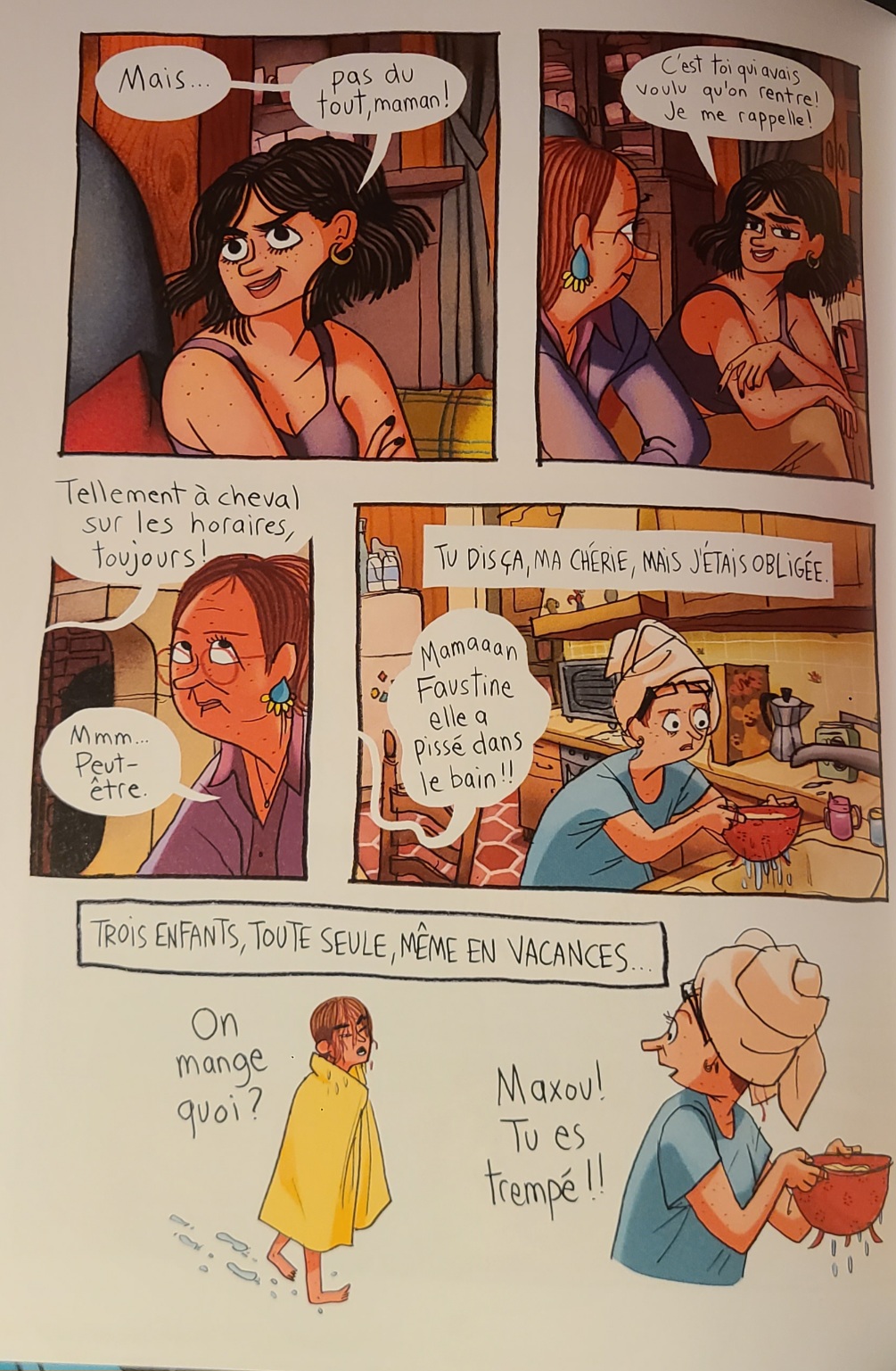 Une histoire courte, sans rebondissement, bien observée, bien racontée . Une mère revèle à sa fille un moment de sa vie audacieux qu'elle avait presque occulté parce qu'il ne correspondait pas à l'image qu'elle donne habituellement. Cela m'a touché parce que cela met en lumière notre tendance à perseverer dans une apparence qui rassure autant les autres que nous-même. Ce qui ne cadre pas, on ne veut pas le voir. Nous sommes hétéroclite et nous essayons de créer un personnage vraisemblable, racontable. Ici les autrices mettent au jour une petite partie de ce qui est caché sous le voile de notre belle construction raisonnable. Le dessin et la couleur très vive sont un peu surprenants au départ mais se revèlent très adaptées finalement, en montrant les détails touchants qui revèlent des gestes et des choix et donnent des clefs pour situer les personnages. La maison landaise sous les immenses pins, les fauteuils en plastic blanc sur la terrasses en grosses pierres irrégulières, les vélos appuyés à l'intérieur du garage, les hortensias contre le mur de l'entrée. Je ressors touchée mais effectivement il ne faut pas attendre un récit halletant et complexe, c'est juste le battant d'un volet qui s'ouvrirait après des années resté fermé. Ça donne de l'air.