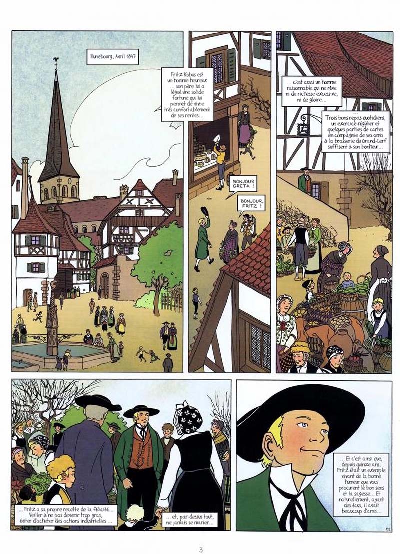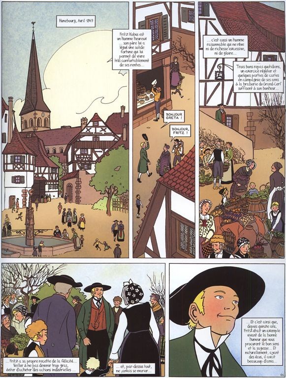 Ah, l'ami Fritz, tout une légende en Alsace celui-là ! Inspiré d'un roman célèbre au XIXè siècle qui connu une grande heure de gloire après l'annexion de 1870 comme personnage typique alsacien. C'est devenu suffisamment légendaire pour être ensuite repris en réel, puisque tout les ans à Marlenheim, depuis les années 70, se tient son mariage en chair et en os, incarné par des acteurs en costume. Une petite fête locale célèbre qui vaut le détour. Ce personnage et cette histoire sont donc alsaciens dans l'âme, et si le sujet vous intéresse les deux auteurs d'origine ont fait de nombreux écrits autour de l'Alsace du XIXè. Quant à la BD en elle-même, que vaut-elle ? Eh bien, c'est une adaptation d'histoire du XIXè, quoi. Le dessin est sympathique et tente de retranscrire l'ambiance de village de l'époque, avec les costumes bien évidemment. C'est plutôt bien fait, même si j'ai noté des erreurs dans les proportions et les perspectives plusieurs fois, tout comme le traitement des couleurs en aplat fait parfois assez fade. C'est du dessin qui fait assez basique mais convient, en somme. Pour l'histoire, on suit assez fidèlement le roman d'origine. C'est une histoire de célibataire qui tombe amoureux, lui qui prêchait le bonheur dans la solitude. C'est une histoire qui va dans le sens qu'on imagine, tout comme le déroulé reste sans grande surprise. Ça vaut surtout pour les détails annexes, très typés alsaciens et qui font folklorique. On notera aussi la volonté de faire de l'Alsace le plus bel endroit du monde, tout comme il y a une volonté de faire de l'Alsace une terre d'accueil de toutes les confessions, qui s'entendent à merveille. On est dans une histoire classique, assez datée dans le style et le déroulé. En somme, une BD qui raconte l'histoire de ce jeune homme devenu référence locale pour l'Alsace. Si vous vous intéressez à la région et à son histoire notamment folklorique, la BD est intéressante à découvrir. Sinon, vous pouvez passer votre chemin, c'est loin d'être indispensable.