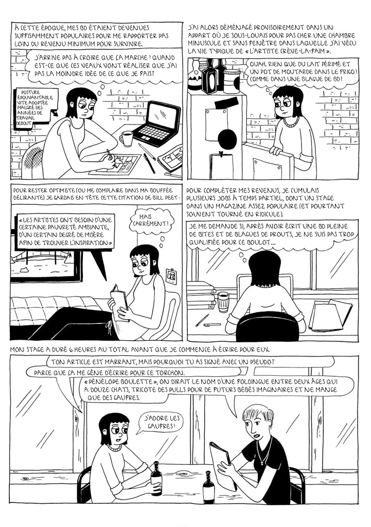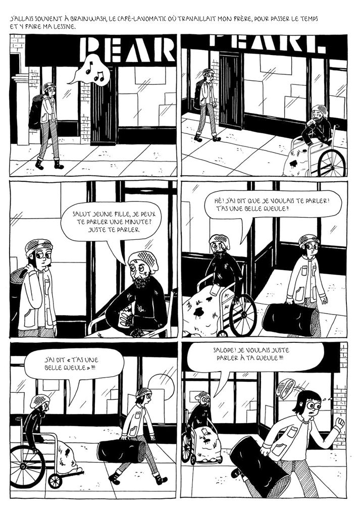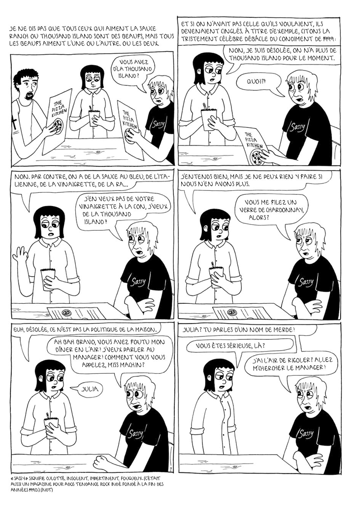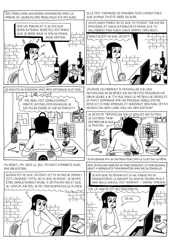 Bon, je suis partagé sur ma note, entre la bonne impression finale laissée par les deux dernières histoires qui sont plus courtes et denses, mais sans oublier que la première histoire de ce recueil (la plus longue) m'a semblé ne jamais finir, ce qui est aussi un frein à un éventuel conseil de lecture. Cette BD est du pur roman graphique à l'américaine. On est sur un format de tranche de vie, explication de son quotidien et dessin répétitif sans recherche esthétique mais pas non plus désagréable. Julia Wertz capte vite l'attention, son trait est vivant, très facile à comprendre et détaille les environnements lorsque nécessaire, tout en restant proche de son personnage dont les expressions passent surtout par une palette de visuels des paupières, les positions générales et la bouche. Ce n'est pas subtil, pas même intéressant à décortiquer, c'est du direct et du lisible. La clarté avant tout, en somme. Maintenant, la BD est aussi bavarde. Rien qu'en galerie vous voyez trois pages où ça semble causer NON STOP, au point de donner l'impression parfois de lire un roman illustré, tempéré par quelques cases de pure BD où la narration est portée par le médium. Et cette façon de narrer l'histoire est vite lourde, surtout encore une fois dans une histoire aussi longue que la première qui raconte les petits boulots de l'autrice tout au long de sa jeunesse, tempéré par les déboires avec sa maladie auto-immune et son alcoolisme. C'est franchement trop long à mon gout et même si je reconnais que la fin de la BD m'a laissée une impression plus positive, je reste quand même dans une sensation d'un peu trop. Sans doute un choix éditorial de laisser tout, sans couper, mais je trouve que la lecture doit être fragmentée pour être intéressante. Par contre, elle est aussi assez lente, puisqu'on va de situations en situations avec l'humour caustique de Julia et son caractère de cochon. C'est rigolo, parfois lourd, et sur plusieurs lectures ça finit par peser. Donc une BD qui est intéressante, notamment la dernière histoire qui m'a rappelée bien des souvenirs, tout en étant lourde et longue, pas forcément recommandable. Les personnes qui aiment le style de l'autrice devraient aimer mais je ne recommande pas comme lecture du soir, c'est assez vite indigeste. Comme dit plus haut, c'est du pur roman graphique américain, avec son bon et son mauvais côté.