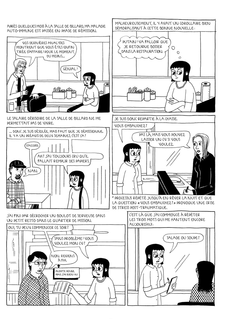 Entre 1982 et 2012, elle a fait beaucoup de choses : elle a fait différents boulots, elle a déménagé dans différentes villes, elle est tombée malade, elle s'en est tirée, elle a été embauchée, elle a été virée, elle a lu beaucoup de livres, elle a fait beaucoup de blagues, elle a fait de la BD, écrit des histoires, elle s'est faite larguer, elle a bu, elle a déprimé, elle a arrêté de boire, elle a grandi, elle a régressé, elle a pensé et elle s'est exprimée. C'est ce que ces trois histoires racontent de manière drôle et profonde, brute et incisive : Les Boulots : « 25 ans de boulots à la con et/ou géniaux, de la vente de balles de golf perdues, à la BD en passant par de longues années de service. ». La Maladie et la BD : « En 2003, je déménage à San Francisco, où je tombe malade, on me diagnostique un lupus, maladie incurable auto-immune, et ça fait chier. Mais c'est grâce à ça que je découvre la BD et ça va mieux. ». Ma première bibliothèque : « Une lettre d'amour à la bibliothèque de ma ville natale pour tout ce qu'elle m'a apprise. »