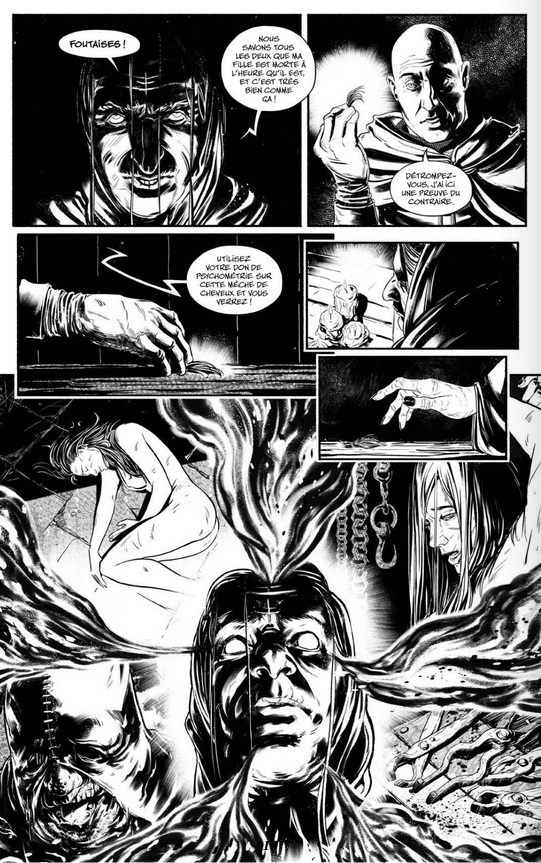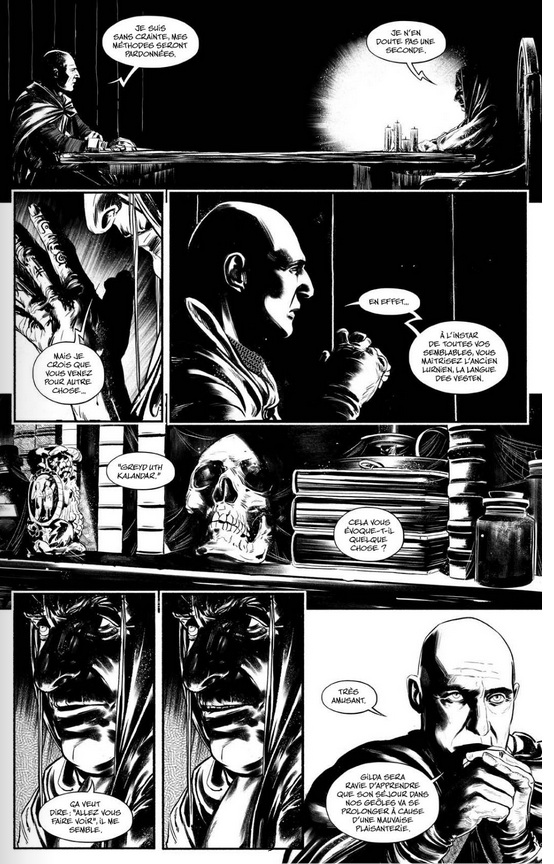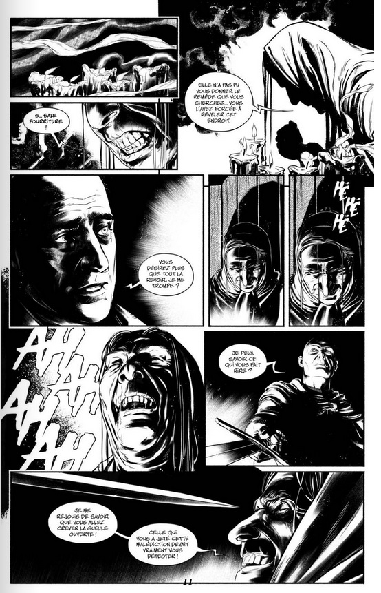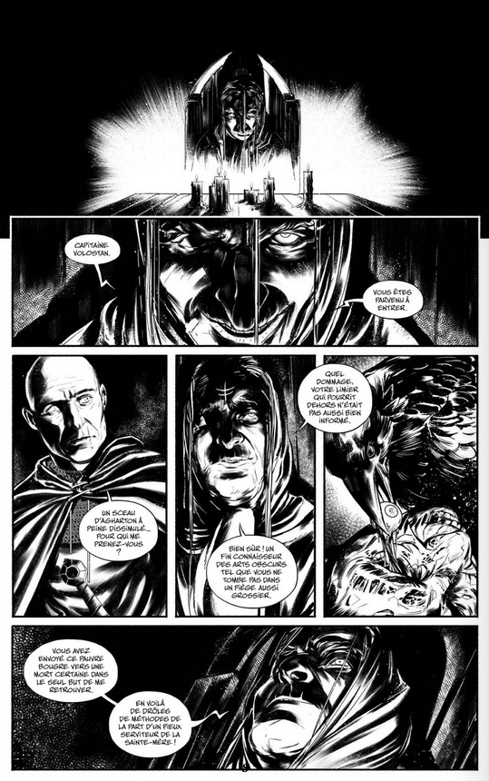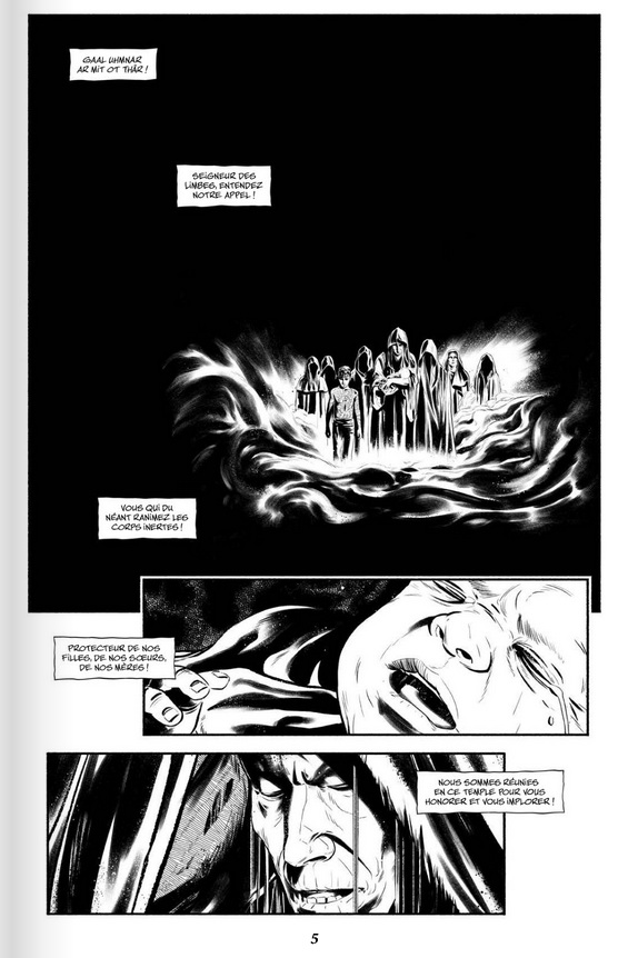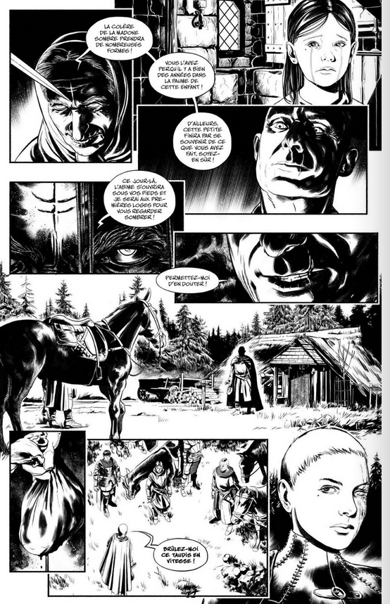 Wow ! C'te claque graphique ! Premier album d'Ismaël Legrand, qui signe aussi bien le scénario que le dessin, et on en prend plein les mirettes ! Les amateurs de Dark Fantasy (dont je fais parti) devraient se régaler ! Remarquons déjà la magnifique maquette de cet album de 200 pages, tout en noir et blanc rehaussé de dorure pour le titre et l'anneau qui entoure notre personnage principal. Ajoutez à cela un petit dos toilé noir, vous avez là un magnifique objet à offrir qui fera sa petite impression d'emblée ! C'est ensuite le graphisme d'Ismaël Legrand qui retient toute notre attention. Je n'ai pas souvenir d'avoir déjà lu un album de Dark Fantasy au style réaliste réalisé en noir et blanc. C'est somptueux, les noirs sont d'une rare profondeur, tout comme le scénario : Dark à souhait ! Le petit bémol que je pourrais poser revient au scénario parfois un peu compliqué à suivre. Il faut être attentif et concentré pour coller au récit. Mais pour autant, tout retombe sur ses pattes, réussissant à mélanger sorcellerie, inquisition, et occultisme (qui va même chercher du côté de Lovecraft je trouve) de façon efficace. Un bon moment de lecture, bien noir comme il se doit !