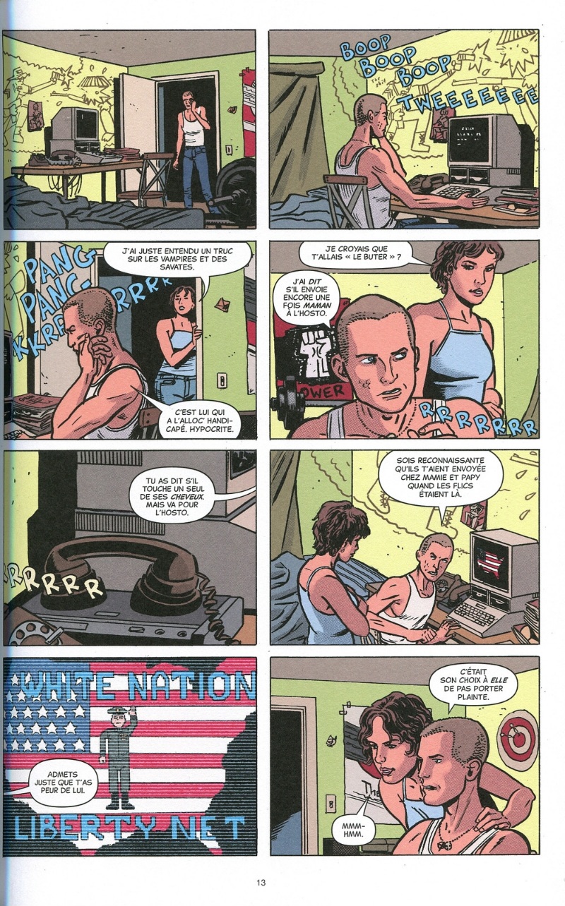 Se tenir la main... Bliss édition nous gratifie d'un roman graphique qui se démarque dans sa collection Bad Idea. Ici, nous sommes dans le monde réel, tristement réel, hélas. Nous sommes en 1985, la jeune Jen End vit dans une petite bourgade de Californie, elle fait partie d'une bande de skinheads dont son frère est le chef. Son père, soldat pendant la seconde guerre mondiale, est alcoolique et sa mère est régulièrement battue par ce dernier. On est loin de la famille idyllique. Elle est amoureuse d'Angelo, un jeune portoricain, il vit à Oceanside. Elle va le rejoindre cet été pour s'occuper de son grand-père malade. Leur relation amoureuse va prendre l'eau lorsque Angelo va découvrir la face cachée de Jen. Le pire est à venir lorsque le frère de Jen va découvrir l'existence de son petit copain, il organise un rassemblement de skinheads à Oceanside pour laver cet affront et déclencher une guerre civile. D'anciens soldats vont reprendre les armes pour faire régner l'ordre. Un récit sombre avec le racisme, l'éducation et les séquelles post-traumatiques de la guerre comme files conducteurs. Un narration bien équilibrée entre le présent et les flash-back de la seconde guerre mondiale, elle prend aussi le temps d'éclairer nos lanternes sur la psychologie des nombreux personnages. Rien de manichéen. Une tragédie bien construite et bien réalisée, elle est le miroir d'une société qui crée des monstres. Et aussi une triste histoire d'amour. Graphiquement, David Lapham va à l'essentiel, pas d'esbroufes, avec son coup de crayon précis et expressif. Un rendu vintage qui est bien mis valeur par les couleurs de Bill Crabtree. La couverture est un superbe condensé du récit. L'album se termine par de petits récits en noir et blanc. Ils permettent d'en apprendre un peu plus sur les différents personnages. Lecture conseillée. Se tenir la main...