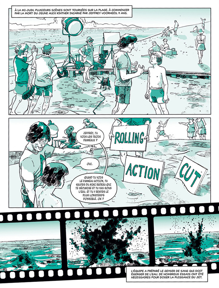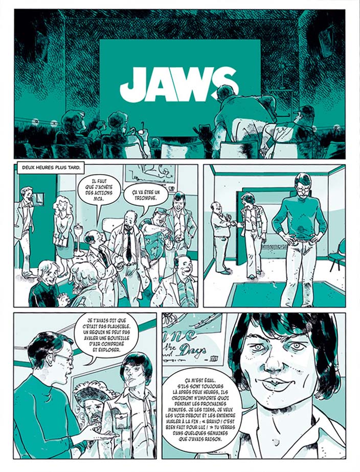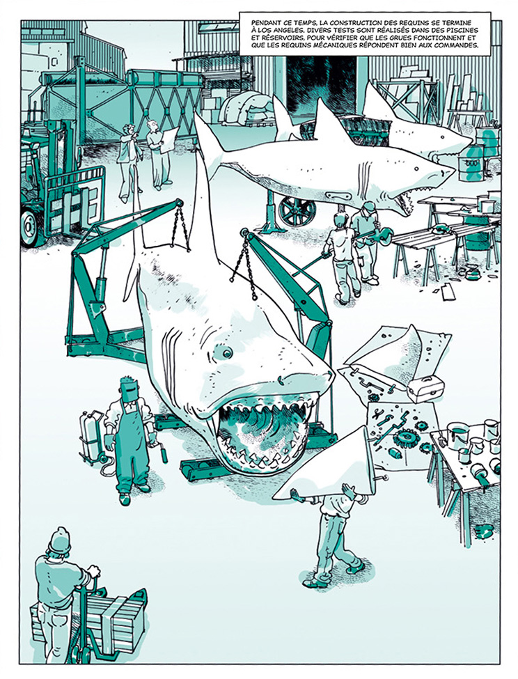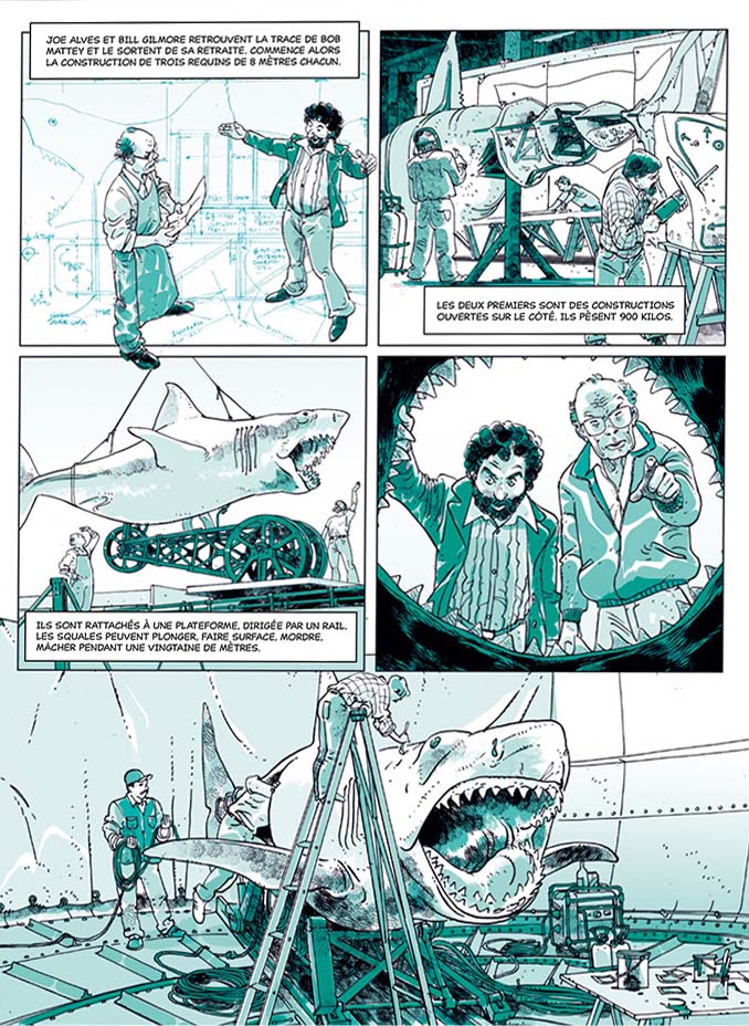 Les Dents de la Mer, sorti il y a cinquante ans, est l'un des films les plus connus, et celui qui a définitivement lancé la carrière d'une figure majeure d'Hollywood, à savoir Steven Spielberg. Au-delà de ses qualités artistiques et du phénomène de société qu'il a amplifié, à savoir la peur des requins, c'est aussi son statut de tournage cauchemar qui a contribué à sa légende. Fort de nombreuses lectures sur le sujet, le scénariste Jérôme Wybon s'est donc attaché à reconstituer ce processus, qui s'est au final étalé sur plus de deux ans entre le moment où Spielberg, aiguillé par deux producteurs, a décidé de s'attaquer à l'adaptation sur grand écran d'un roman de Peter Benchley, jusqu'à sa sortie, triomphale, à l'été 1975. Le scénariste est même allé plus loin en évoquant rapidement le tournage de sa suite, qui se fit sans le réalisateur, trois ans plus tard. C'est une enquête minutieuse, où l'on comprend le rôle des producteurs, du réalisateur, de la monteuse, qui communiquait en permanence et en direct (vivent les téléphones et les talkie-walkies) alors que le film était encore en tournage. L'ajout des scénaristes, nombreux, si bien que la paternité de certaines scènes est quasiment impossible à attribuer, sans oublier que le trio d'acteurs principaux a également participé aux ajustements des dialogues ou des situations. Les difficultés ont été très nombreuses : les requins mécaniques dont les rouages réagissaient mal à l'eau de mer, le taux d'alcoolémie de Robert Shaw a perturbé certaines scènes... Spielberg lui-même, extrêmement motivé, a un moment failli céder au désespoir et tout lâcher en plein tournage. Mais la présence d'amis tels que Brian de Palma, George Lucas, John Milius ou Carl Gottlieb l'ont aidé à maintenir le cap, à trouver des astuces techniques pour combattre les difficultés d'un tournage quia duré au final 155 jours au lieu d'une quarantaine. Je ne suis pas très fan du dessin de Toni Cittadini : s'il se montre précis et appliqué sur les scènes reproduisant des images du film ou dans la gestion des décors, sa représentation des personnages, surtout leurs visages, me laisse plus circonspect. Ainsi son Spielbarg du début des années 1970 ressemble-t-il plutôt à Blueberry qu'à Spielberg lui-même. Pas de grosse influence sur le plaisir de lecture, heureusement, mais je tenais à le signaler. En bref cet album documentaire plaira sans doute à celles et ceux qui s'intéressent au cinéma du réalisateur, à l'industrie hollywoodienne d'une époque où les effets spéciaux étaient encore un peu rudimentaires. Très agréable.