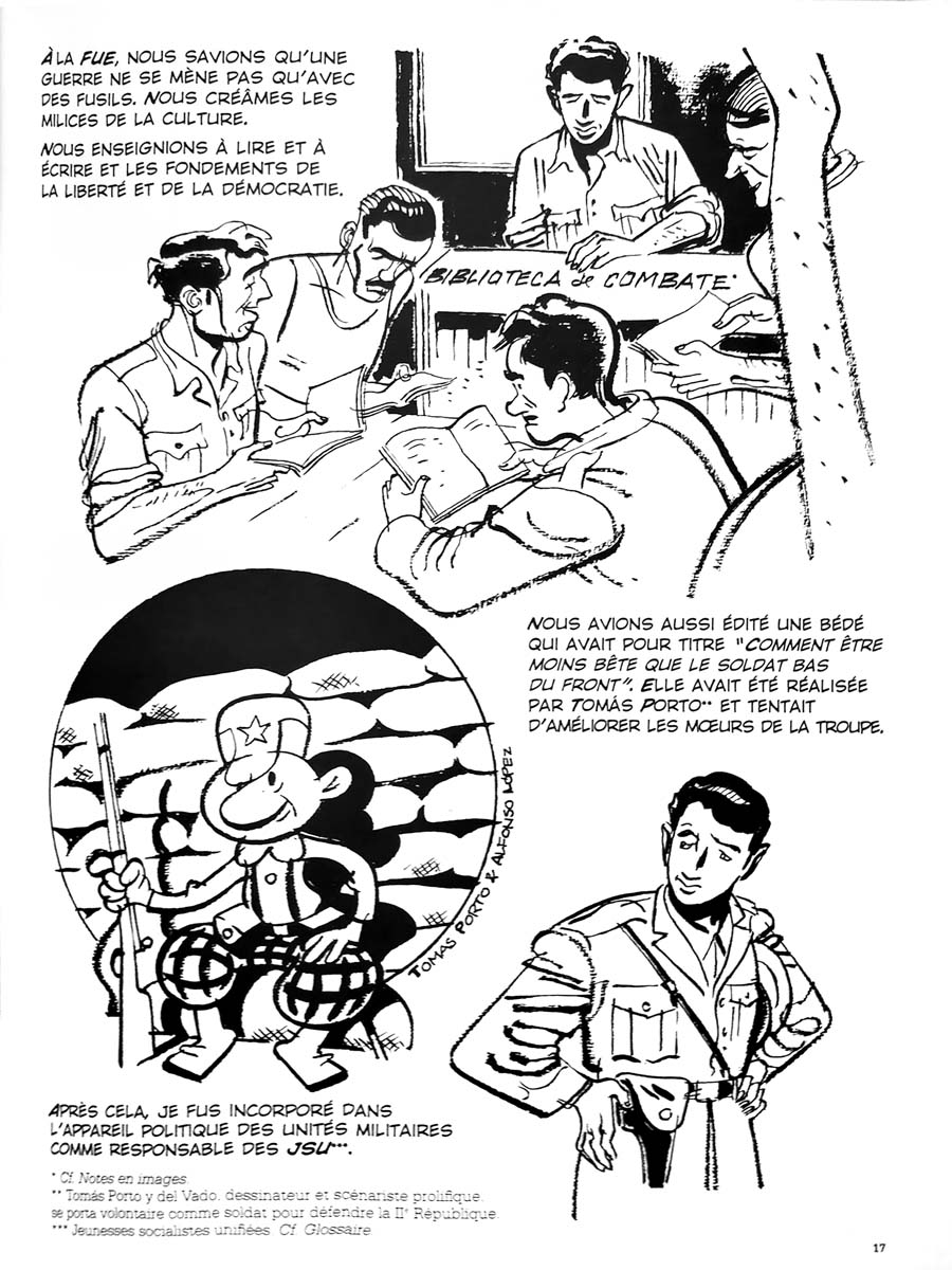 Je ne connaissais pas Miguel Nunez, dont la vie et les combats sont au centre de cette biographie/autobiographie (en effet l’album s’inspire de l’autobiographie de Nunez, les auteurs ayant décidé d’ajouter pas mal de choses/planches biographiques pour compléter le tout). Mais c’est un personnage hautement estimable, qui a fait preuve d’une grande force de caractère, d’une obstination, et d’un courage à toute épreuve, échappant plusieurs fois miraculeusement à la mort, mais endurant torture et longues périodes d’emprisonnement, fuyant les policiers franquistes dès qu’il était en liberté. Au travers de son témoignage, c’est un pan de la guerre d’Espagne qui est éclairé, mais aussi de la longue période qui va suivre sous le joug de Franco. Rien de nouveau du point de vue général, mais un nouveau témoignage à charge contre les dérives fascistes. Et surtout la mise en lumière d’un héros « ordinaire », oublié de l’Histoire, mais qui n’a jamais trahi ses idéaux de jeunesse. La narration est assez dépassionnée, et le dessin en Noir et Blanc – inégal, mais intéressant – accompagne bien le récit. Un glossaire/dossier final complète très bien la lecture. On sent que les auteurs – par ailleurs amis de Nunez – partagent les idées de celui-ci. On sent aussi que les éditions Otium sont elles aussi engagées – très à gauche et pour la défense des idées et de l’image de ceux qui se sont battus et se battent contre les divers avatars du fascisme. Si elle n’est pas forcément captivante, la lecture est en tout cas intéressante – et recommandable pour ceux que le sujet intéresse.