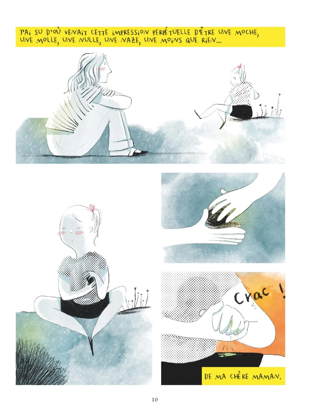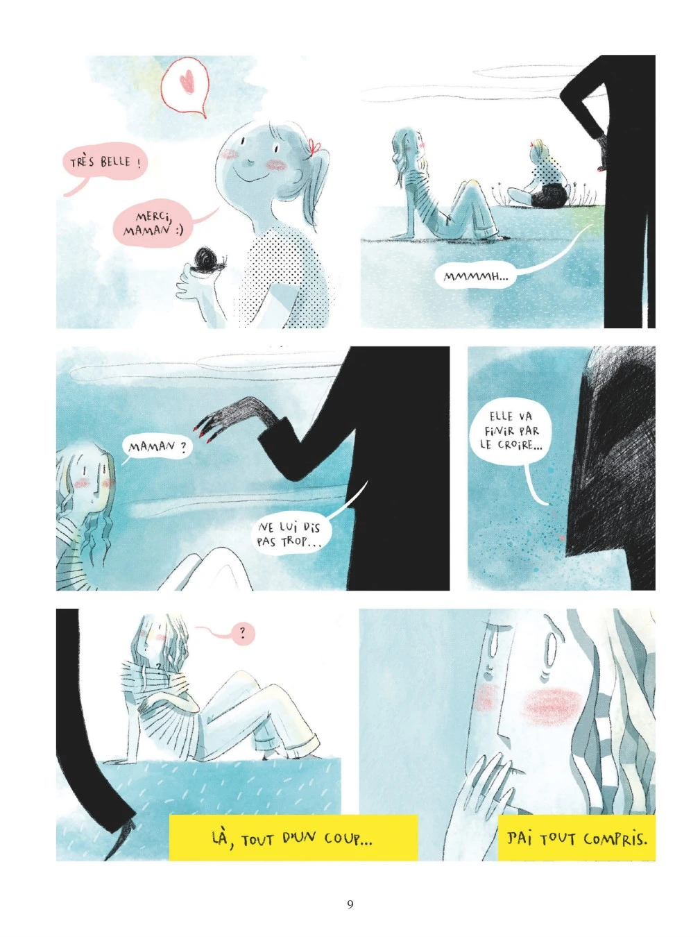 Une grosse BD qui prend le temps de développer son sujet, assez difficile mais franchement bien amené : les parents toxiques. Ici, la mère, pas forcément la plus présente dans les œuvres de ce type, j'ai l'impression. La BD est longue à se mettre en place, faisant le choix de montrer la mère comme une créature de ténèbres qui vient dans la vie colorée de la protagoniste avec ses remarques assassines et toute la violence qu'elle apporte. Cette mère toxique est présentée dès les premières pages (visibles en galerie) et il est très vite clair que le récit veut nous orienter envers elle. On est dans le point de vue de Alix et son rapport à sa mère. Celle-ci aura droit à quelques pages en analepse sur les origines de sa violence verbale, mais le récit n'explore que très peu cette piste. Le récit est la lente prise de conscience de Alix envers sa mère, la considération finale que sa mère n'est pas bonne pour elle. Qu'elle doit s'en éloigner et vivre sans elle, loin de son aigreur et son amertume. Maintenant, la BD semble présenter dès le début la prise de conscience mais en vraie il faudra pratiquement toute la BD pour qu'elle arrive de manière consciente, jusqu'à des solutions. Et je dois dire que le déséquilibre se fait sentir. La BD n'est pas tant sur la libération qu'une longue exposition de cette toxicité permanente. De même il n'y aura pas réellement de détails sur la façon dont elle s'en sort (notamment le travail avec la thérapeute pour s'extraire de cette relation) ce que je regrette un peu. Après tant de préparations, la fin parait quelque peu rapide de fait, j'aurais aimé un peu plus de développement avant la fin. La BD est très bien illustrée, avec un jeu sur les couleurs et le noir de la mère qui s'infiltre dans les pages. D'ailleurs j'avais déjà repéré son trait dans La Différence invisible, et je trouve que ça colle très bien au récit. Une autrice que j'apprécie ! Une BD au sujet intéressant donc, pas tout à fait mon style avec les défauts soulignés préalablement, tout en notant que l'idée directrice est à développer. Les parents toxiques deviennent un vrai sujet et je suis content de voir apparaitre le sujet des parents toxiques. J'ai vu nombre d'amis dont les parents étaient un fardeau pour vivre leurs vies, et voir des personnes exposer publiquement la façon dont ces problématiques se joue me fait plaisir !