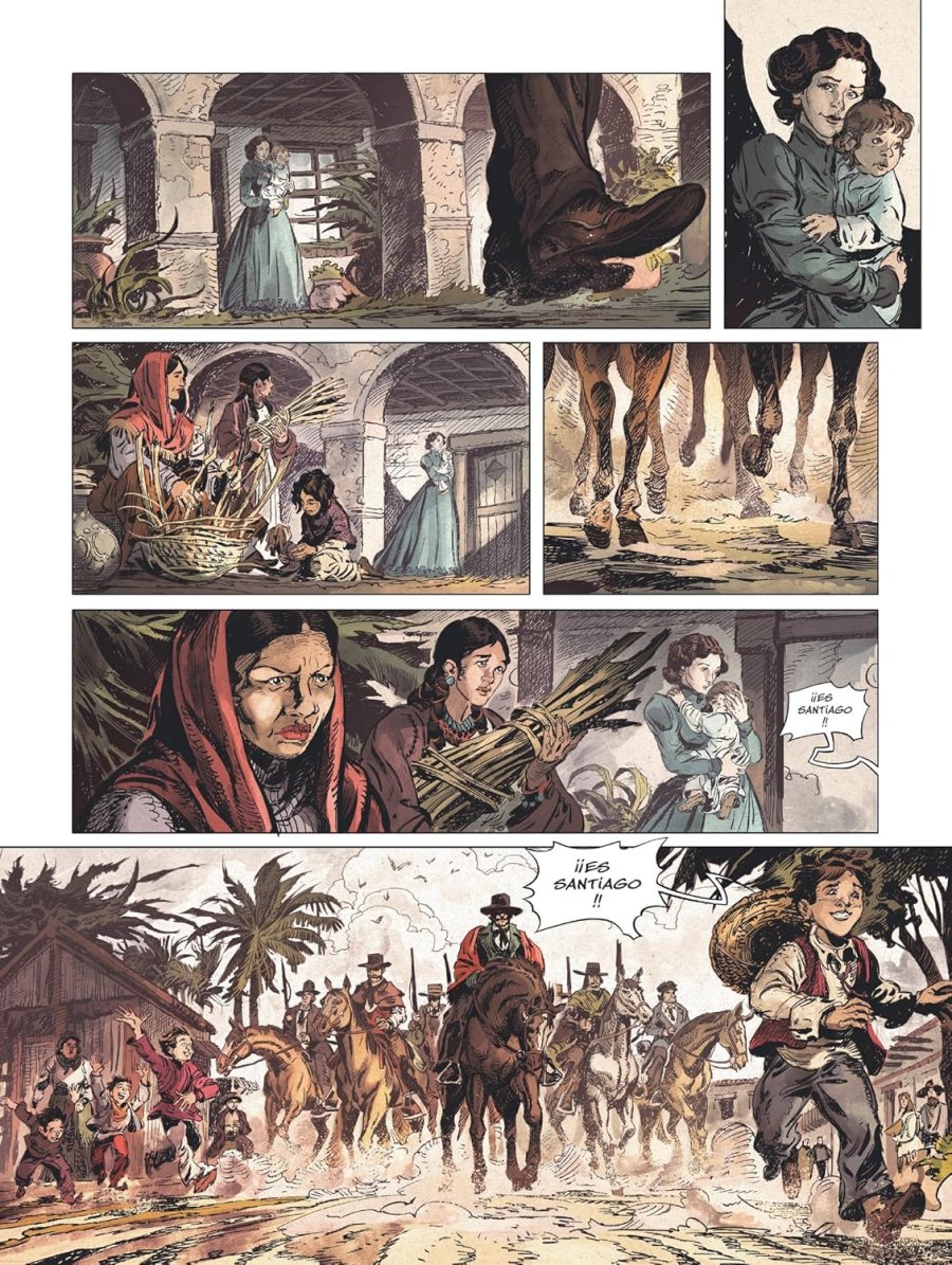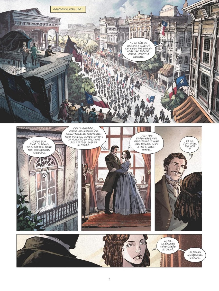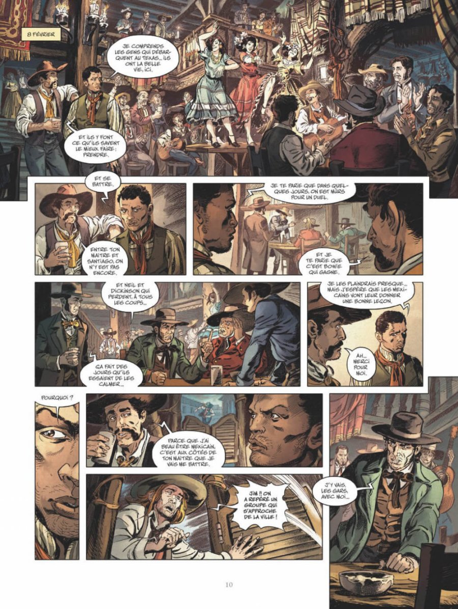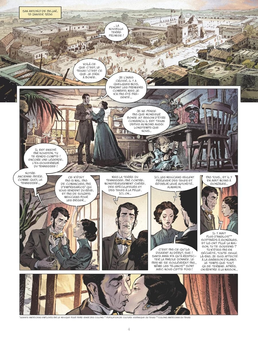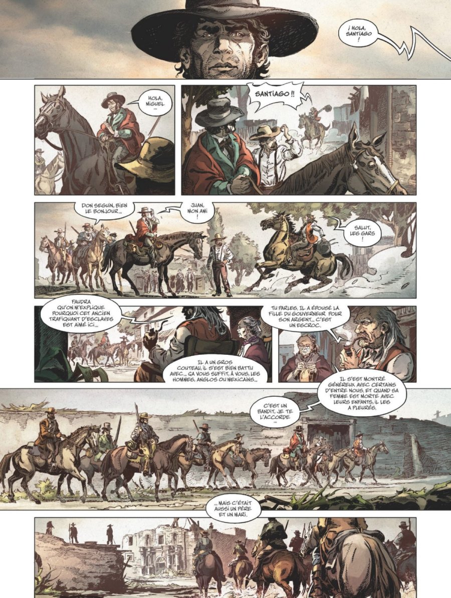Après avoir entamé la collection avec des biographies de quelques « légendes » de l’Ouest, voilà qu’elle se développe de plus en plus autour de « moments », de batailles ou d’événements qui sont restés dans les mémoires et/ou qui ont été magnifiés (et quelque peu embellis ou travestis) par le cinéma. C’est d’ailleurs via le cinéma, et avec le film lyrique et « patriotique » de John Wayne que j’avais découvert cet événement, me documentant un peu plus par la suite. Ici, j’ai trouvé la lecture plutôt agréable, mais sans plus. Gabella se spécialise depuis quelques temps dans les biographies historiques chez Glénat, il commence à être rodé pour boucler son sujet en une cinquantaine de pages. Mais je pense qu’il aurait peut-être fallu le développer davantage. Je suis en effet sorti frustré par le manque de détails sur les protagonistes, leur personnalité, leurs rivalités (et leurs intérêts) souvent très divergents. C’est le cas pour les « défenseurs » d’Alamo, comme pour Santa Anna. Cela aurait aussi permis d’être moins manichéen entre les deux camps (un peu moins, mais quand même dans la lignée du film de Wayne). Plusieurs visions de cette bataille ont déjà été données en BD, mais celui qui a le plus développé le sujet est sans doute l’auteur américain Jack Jackson, dans Une autre histoire de l'Amérique et dans « Fort Alamo » (encore non référencé sur le site). Avec cet album de Glénat, on reste un peu à la surface des choses. Le contexte et les divergences d’intérêt sont un peu trop escamotés à mon goût – faute de place entre autres, de documentation peut-être aussi. Un petit dossier historique, avec bibliographie, accompagne et complète l’album. Note réelle 2,5/5.