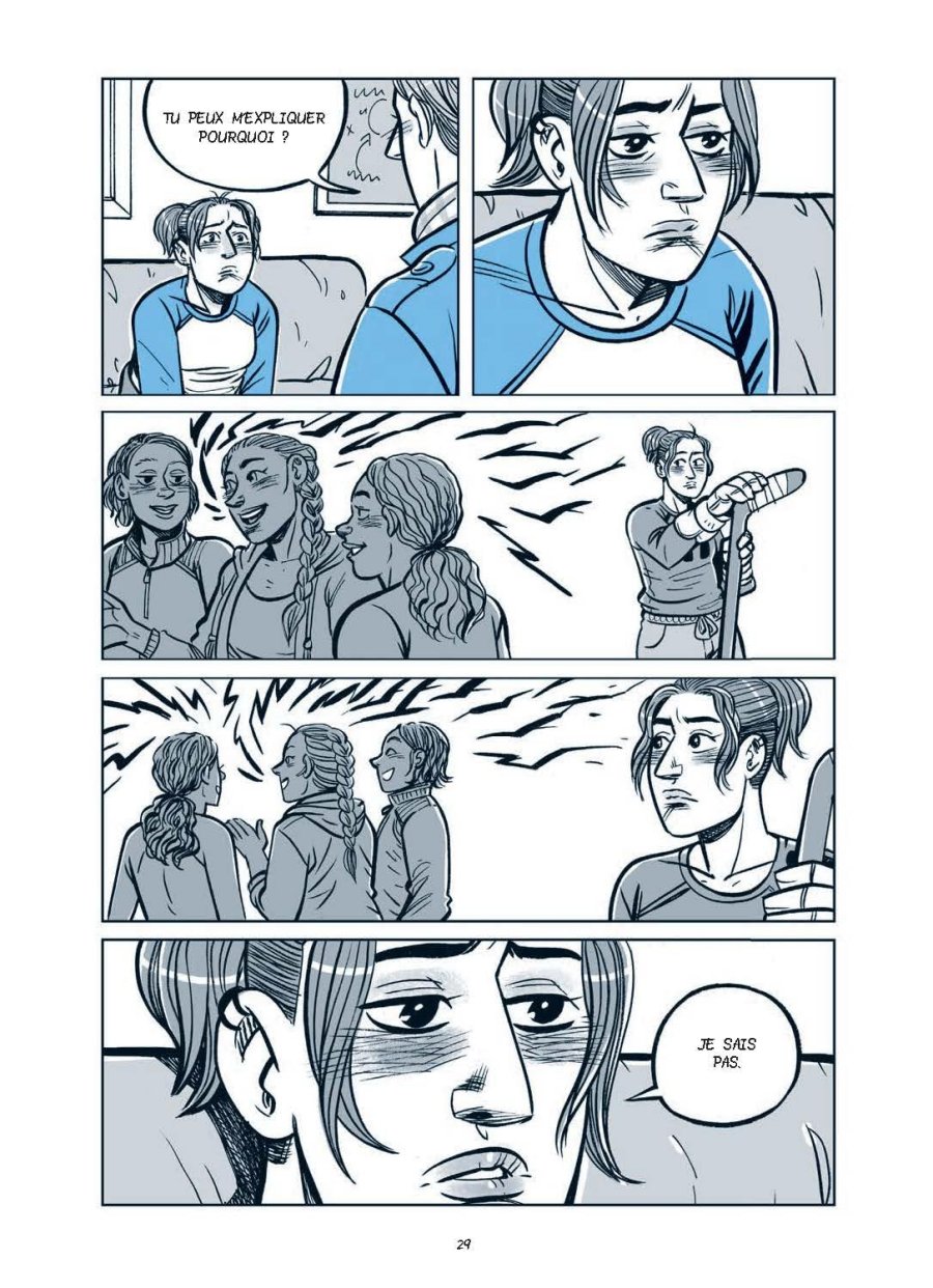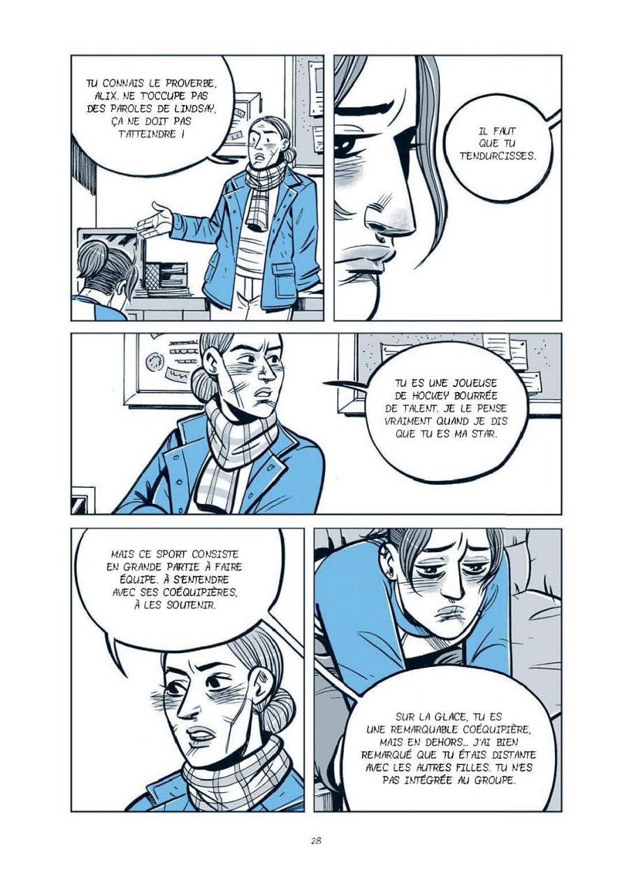 Une bonne petite BD de romance adolescente. En feuilletant la BD je savais directement que c'était un comics, tant le dessin m'a paru typé nord-américain. Il fait très bien le travail en accentuant clairement les gros plans, tout en jouant sur les visages, les émotions et les regards. Le seul défaut que j'y vois c'est le tic d'ombrer le dessous des yeux en permanence, qui donne souvent l'impression que Alix a le rouge qui monte aux joues. La BD en elle-même est une comédie romantique adolescente, avec une jeune femme hockeyeuse et un jeune homme bisexuel -mais qui ne définit pas sa sexualité-, qui se rencontrent et qui vont entamer une relation. La BD passe par différentes étapes, avec notamment la représentation de la violence des lycées envers les personnes un peu différentes, en faisant démonstration que l'entraide et l'amitié aident à passer ces étapes difficiles. De même, chacun des deux protagonistes a un rapport spécifique avec sa mère, seul parent à la maison dans les deux cas. La BD aborde ainsi plusieurs thématiques et se permet de traiter de façon large l'histoire d'amour qui est ainsi pas la seule traitée dans cette histoire. C'est plutôt bien fait et la BD se termine sur une conclusion qui en vaut une autre, arrêtant l'histoire après un développement conséquent et sans final en grande pompe. C'est simple, efficace, bien menée. Une BD qui plaira sans doute bien aux plus jeunes, elle a de belles qualités en terme d'histoire d'amour !