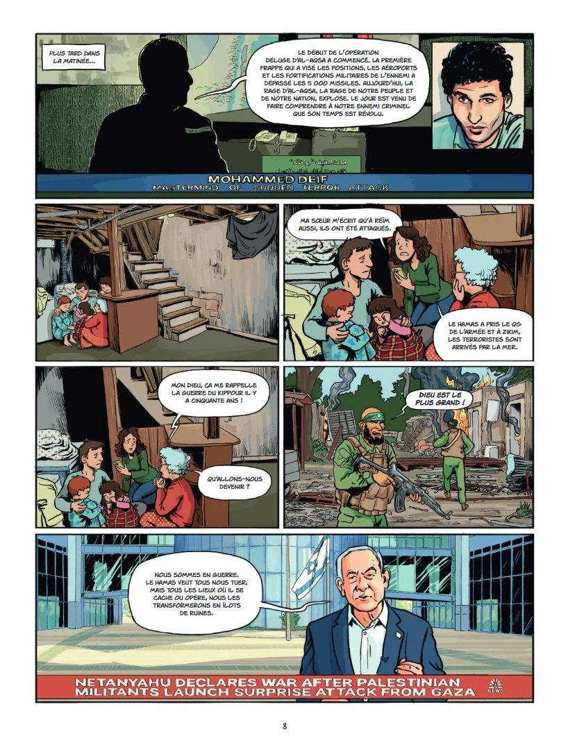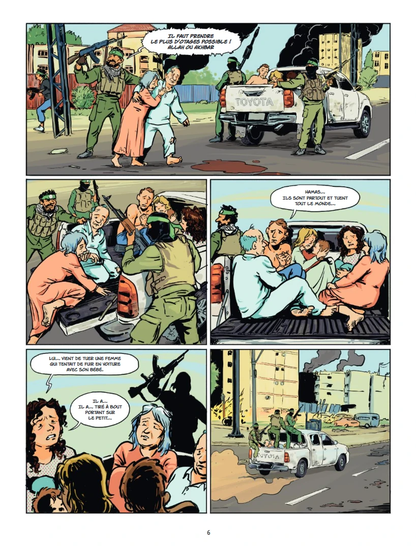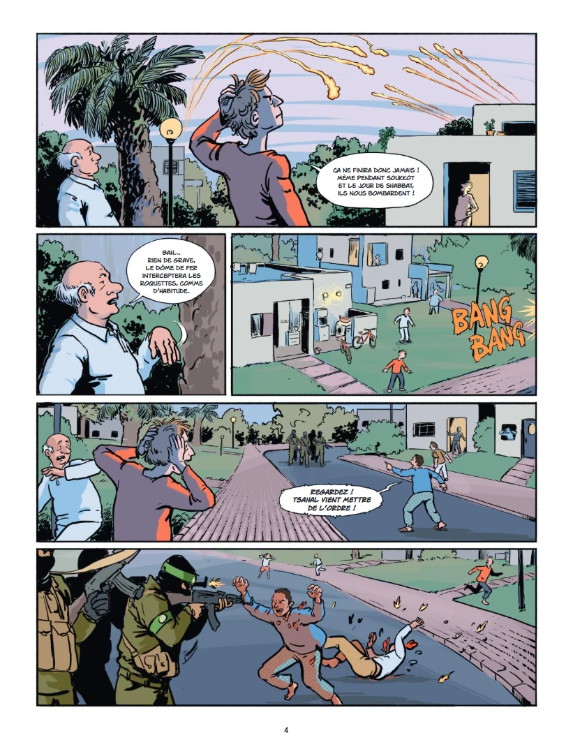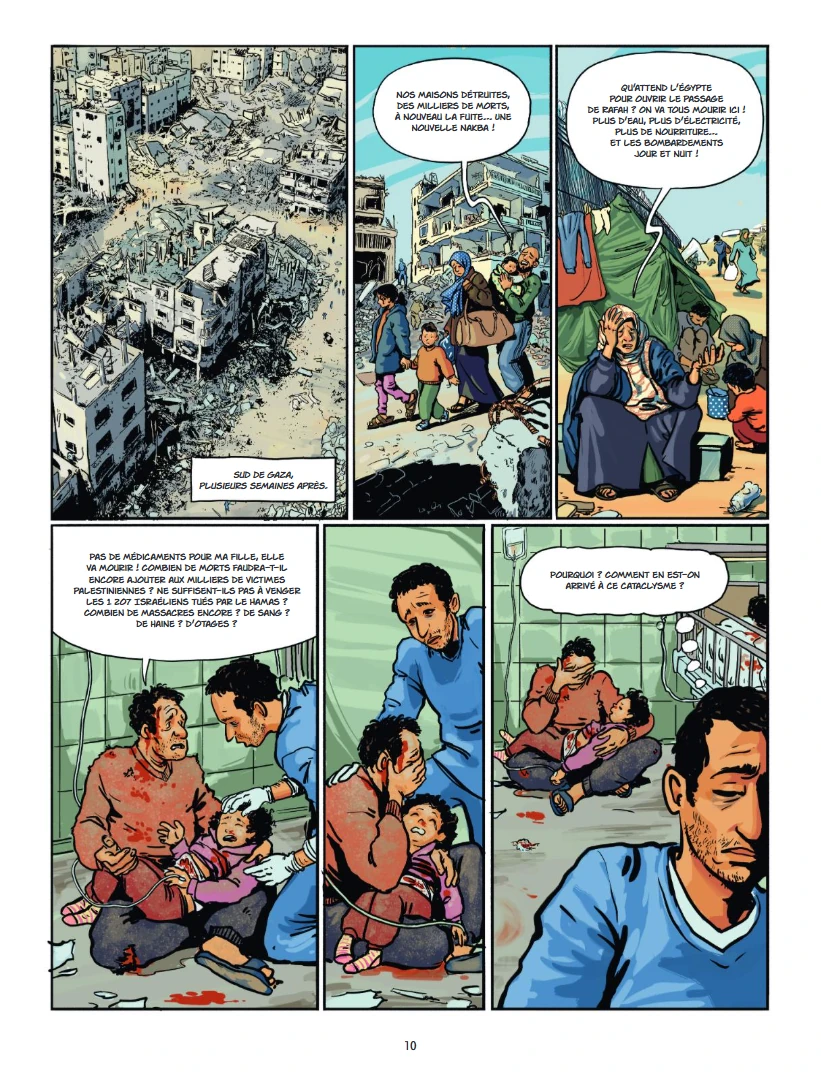 Voici une BD malheureusement de circonstance, qui permet de prendre du recul sur les origines de ce conflit qui nous parait insoluble et sans fin. Pour ce faire, c'est Georges Bensoussan, historien français spécialiste d'histoire culturelle de l'Europe des XIXe et XXe siècles et, en particulier, des communautés juives, également ancien directeur éditorial du Mémorial de la Shoah à Paris qui co-scénarise cet album avec Danièle Masse, également spécialiste de l'Orient et du Moyen-Orient. On part donc avec une base solide pour remonter le temps et le fil d'une tragédie inscrite dans l'Histoire. L'album s'ouvre sur les terribles attentats du Hamas du 7 octobre 2023 en Israël et ses prises d'otages, pour remonter le fil du temps jusqu'au début du XXe siècle. De la position des juifs dans le monde à leur arrivée en Palestine et comment ils ont petit à petit racheté les terres palestinienne et favorisé l'immigration des juifs du monde, c'est tout ce cheminement qu'on nous explique. L'Angleterre et les autres pays occidentaux, France comprise, ont leur responsabilité dans ce marasme, poursuivant leur politique coloniale tant que ce fut possible ou calculant au mieux pour leurs intérêts économiques. C'est toute cette mise en perspective qui nous permet de mieux comprendre l'inéluctabilité du conflit actuel et les responsabilités partagées. C'est ainsi qu'on découvre que le terrorisme est loin d'avoir été l'apanage des palestiniens ; les juifs aussi ont eu leurs factions terroristes (L'Irgoun ou le Lehi) qui semaient la terreur chez les arabes et qui ont même assassiné Lord Moyne, le gouverneur officiel britannique en 1944. Côté dessin, on est dans le classique : Yana Amadovic nous propose un trait réaliste qui cadre parfaitement avec ce qu'on attend d'une BD documentaire.