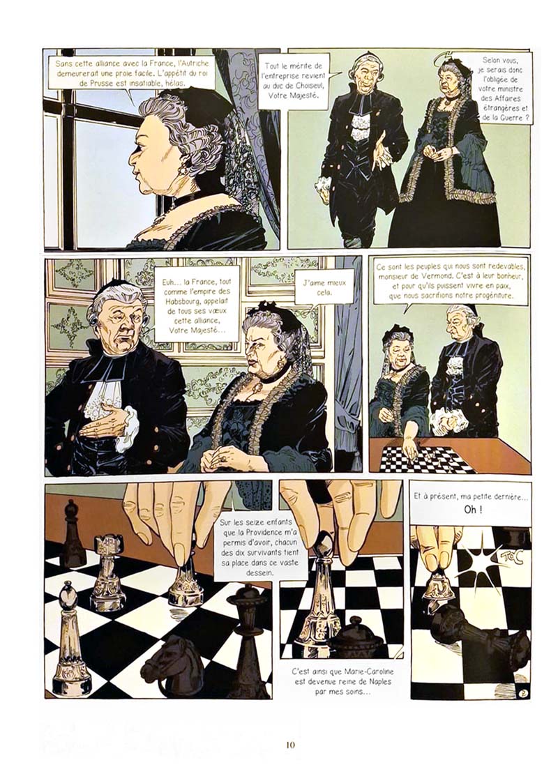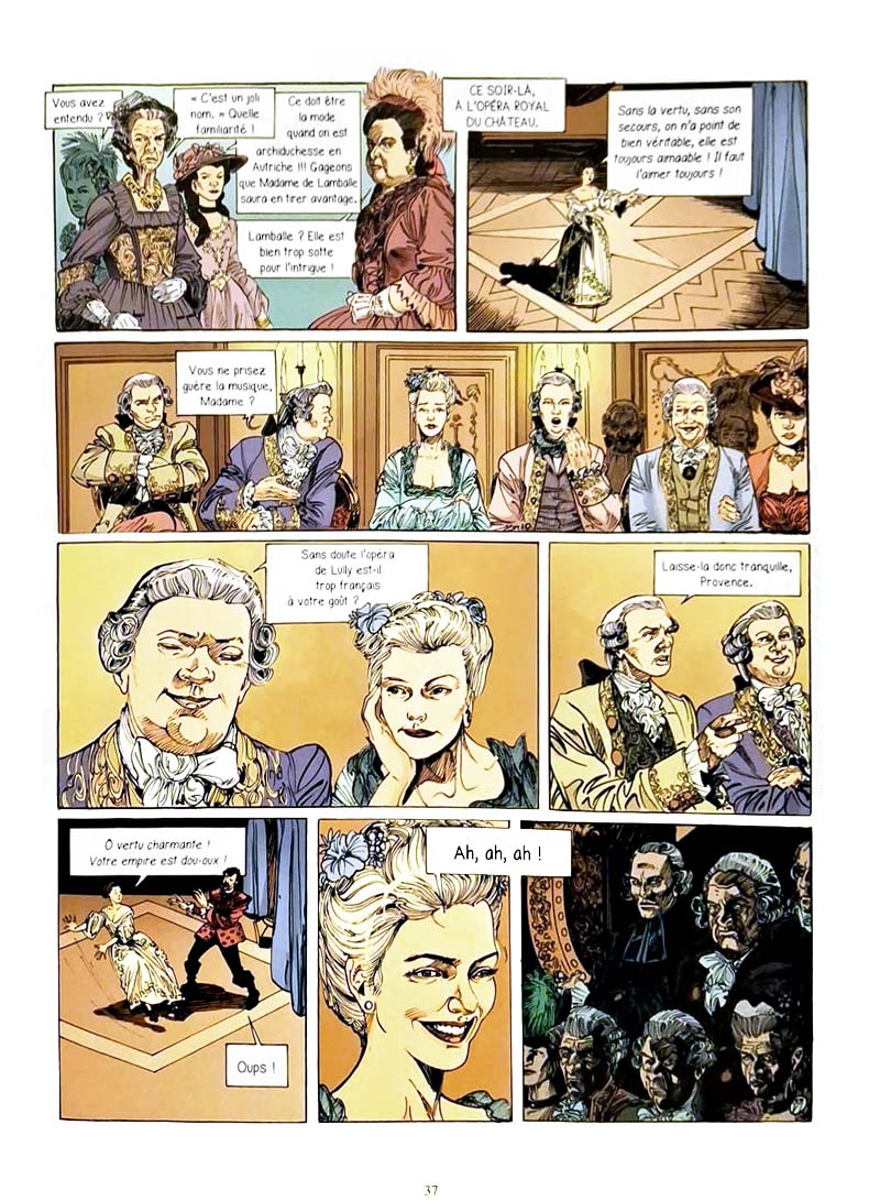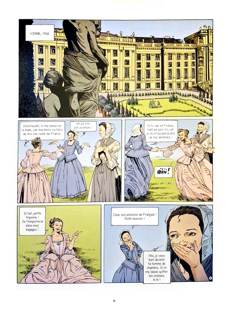 Une biographie en bonne et due forme de Marie-Antoinette qui se concentre sur la période allant de son arrivée en France à ses premiers pas en tant que véritable reine, après la mort de Louis XV. On y suit une adolescente déroutée par son arrivée à la cour de Versailles, loin de son pays natal et perdue au milieu d'intrigants, tandis que son époux ne lui prête aucune attention et paraît surtout trop mollasson face à son énergie et à son envie de faire la fête pour masquer son trouble. L'absence de numérotation laisse penser à un one-shot, mais l'album s'interrompt de façon inattendue avant même les prémices de la Révolution Française. Après plusieurs pages retraçant ses premiers gestes de souveraine, les écarts qui contribueront à la rendre impopulaire et sa rencontre avec le comte Fersen, l'histoire s'arrête brusquement, avec un mot de conclusion dont on ignore s'il annonce une suite ou s'il sert simplement de présage au destin tragique que les lecteurs connaissent déjà. Cette fin laisse perplexe sans être mauvaise. Le dessin est de bonne qualité, même s'il paraît parfois un peu figé. Les costumes et coiffures sont soignés, tandis que les visages manquent d'uniformité, oscillant entre charmants et moins réussis. La mise en scène rapproche le lecteur de cette future reine, la rendant à la fois humaine par son malaise et ses doutes, et distante par sa déconnexion totale de la réalité du peuple. Un exemple parlant apparaît lorsqu'elle apprend que les Français manquent de pain et meurent de faim, et qu'elle choisit pour leur rendre hommage d'orner sa coiffure de petites madeleines décoratives. C'est bien construit, documenté, agréable à lire, mais l'ensemble reste trop académique et légèrement désuet pour vraiment captiver. J'ai même eu la sensation de lire une BD historique des années 1980.