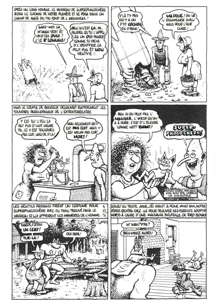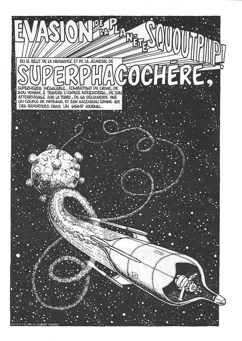 Gilbert Shelton est un des principaux tenants de l’underground américain des années 1960-80 (même s’il a publié après cette période). Super-Phacochère a sans doute été l’une de ses premières publications, à l’origine dans un journal étudiant. Et on sent bien en lisant cet album que l’auteur en était à ses débuts, et qu’on était dans une publication proche du fanzinat. En effet, je pense que l’auteur naviguait à vue, improvisant pas mal les intrigues, c’est clairement foutraque. L’album est présenté comme un tome 1, il y a sans doute eu d’autres histoires publiées aux États-Unis, mais il est resté orphelin. En l’état, il ne m’a pas forcément convaincu. Certes, il y a le côté n’importe quoi jouissif de ce type d’underground. Il y a aussi des critiques de la société de consommation américaine. On a aussi une quasi parodie de Superman (comme lui Super Phacochère déambule sous une fausse identité, celle d’un journaliste, Philbert Desanex – qui a aussi donné lieu à un petit album, que j’avais trouvé sympathique – Le 100.000e Rêve de Philbert Desanex). Mais, globalement, ces aventures, qui mélangent une SF du pauvre, à un underground années 60/70, m’ont laissé sur ma faim. Shelton a fait mieux ensuite et ailleurs, et dans la même veine, d’autres auteurs (comme Rand Holmes par exemple) ont produit des choses qui passent mieux la barrière des années. Un album probablement à réserver aux amateurs de l’auteur, et à ceux que l’underground américain de cette époque intéresse.