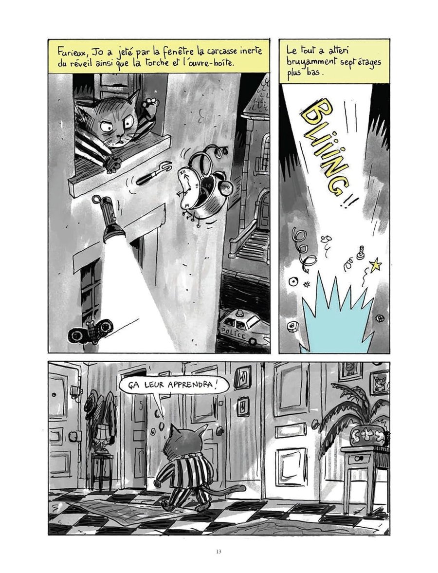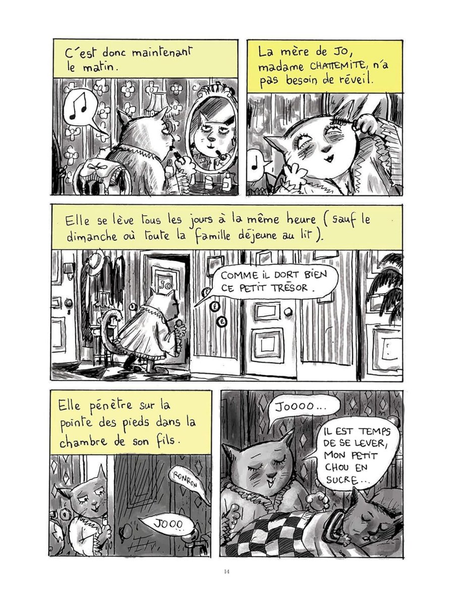 Cette BD est l'adaptation d'un livre pour enfants de Tomi Ungerer. Elle raconte l'histoire d'un petit garçon ronchon qui en a assez que sa mère le couve et le traite comme un bébé. Il se considère désormais comme grand et estime avoir le droit d'être désagréable avec elle pour qu'elle le laisse tranquille. Cette colère, il l'emmène aussi à l'ecole, où elle l'entraine dans une bagarre avec le caïd de sa classe, qui se moquait de lui sur ce sujet. C'est une histoire mignonne, à la morale juste. Les personnages sont des chats anthropomorphes, ce qui apporte une dose bienvenue de légèreté et d'humour, évitant le piège d'un conte moralisateur trop réaliste ou appuyé pour de jeunes lecteurs. On s'amuse notamment des pâtés de souris et autres spécialités très félines de cet univers. Pour le reste, il s'agit bien de la transposition d'un monde très humain. Le dessin de Mathieu Sapin évoque celui de certains livres illustrés pour la jeunesse, comme les ouvrages de Roald Dahl illustrés par Quentin Blake, et fonctionne bien avec le genre et le public visé. Le petit héros n'est pas très attachant au départ, tant sa colère et son mépris envers sa mère le rendent antipathique, mais c'est précisément le cœur du propos. L'intrigue apporte une réponse appropriée à ce comportement et se conclut de manière apaisante, ramenant le sourire. C'est donc un album plutôt réussi et bien adapté aux jeunes lecteurs, auquel il peut offrir une piste de réflexion sur un sujet qui peut les concerner : vouloir grandir sans pour autant faire de peine a son entourage.