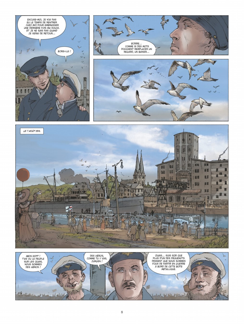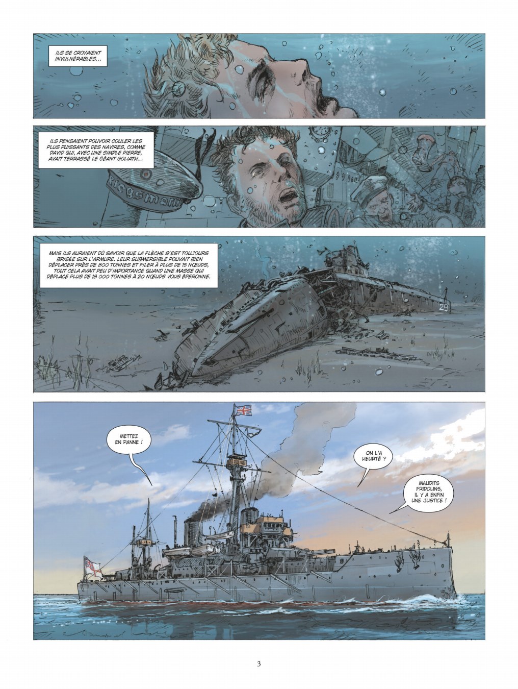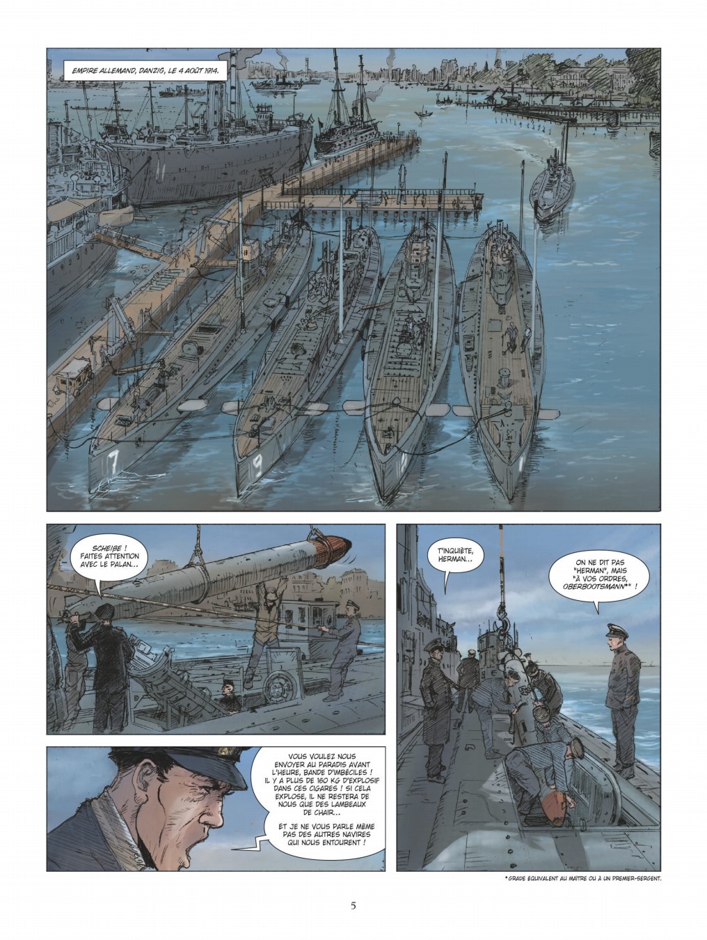 Septembre 1914. La Première Guerre mondiale a embrasé le monde dans un triste jeu de domino. Sur mer, la marine impériale allemande tente de s’opposer à la marine anglaise, première puissance mondiale incontestée sur toutes les mers et les océans. Dans cette guerre maritime qui voit s’affronter de titanesques cuirassés, croiseurs de bataille ou encore croiseurs cuirassés, une arme dénote quelque peu : le torpilleur submersible que l’on nomme plus généralement "sous-marin". L’arme n’est pas nouvelle, on en trouve la trace déjà dans des récits antiques, mais dans les premières heures du conflit mondial, le sous-marin - qu’il soit allemand, français ou anglais - demeure encore une machine imparfaite, malodorante, lente et faiblement armés. Que pourrait bien faire un submersible déplaçant quelques centaines de tonne contre un vaisseau de surface armé de puissants canons et dont le tonnage se compte en dizaine de milliers de tonnes ? Aux premières lueurs du 22 septembre 1914, l’improbable va ébranler les certitudes. Dans les eaux grises de la mer du Nord, le SM U9 de la Kaiserliche Marine allemande avec 26 hommes d’équipage et commandé par Otto Eduard Wediggen va envoyer par le fond trois croiseurs cuirassés anglais en moins d’une heure, infligeant à la Royal Navy l’un des plus sévères camouflets de la guerre. Pour son dernier album, Philippe Adamov (Les Eaux de Mortelune et L’Impératrice rouge) revient sur un exploit historique en compagnie de Jean-Yves Delitte.