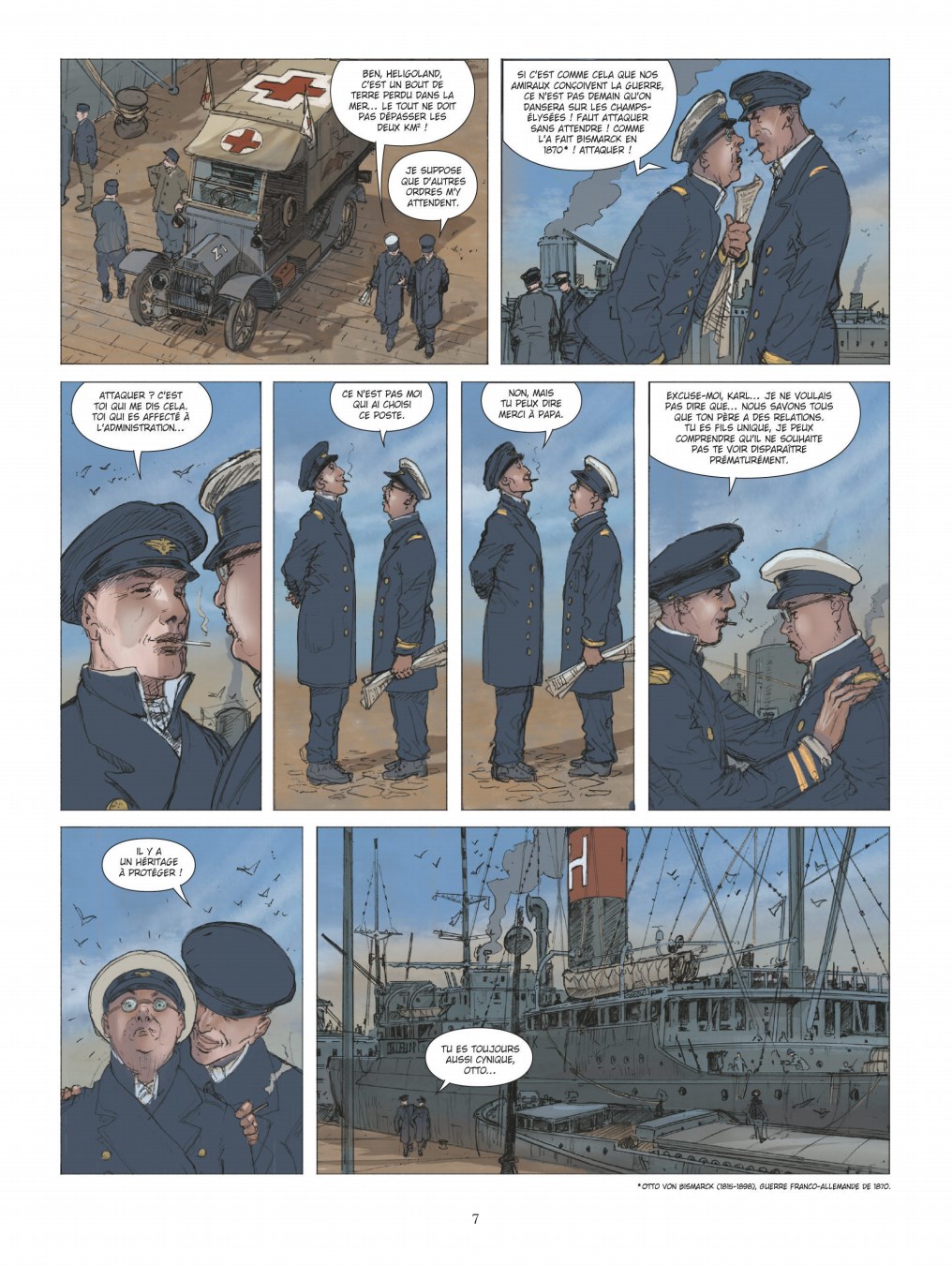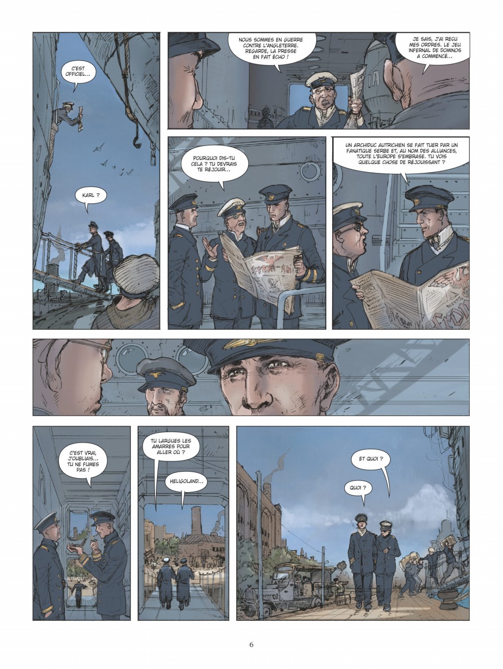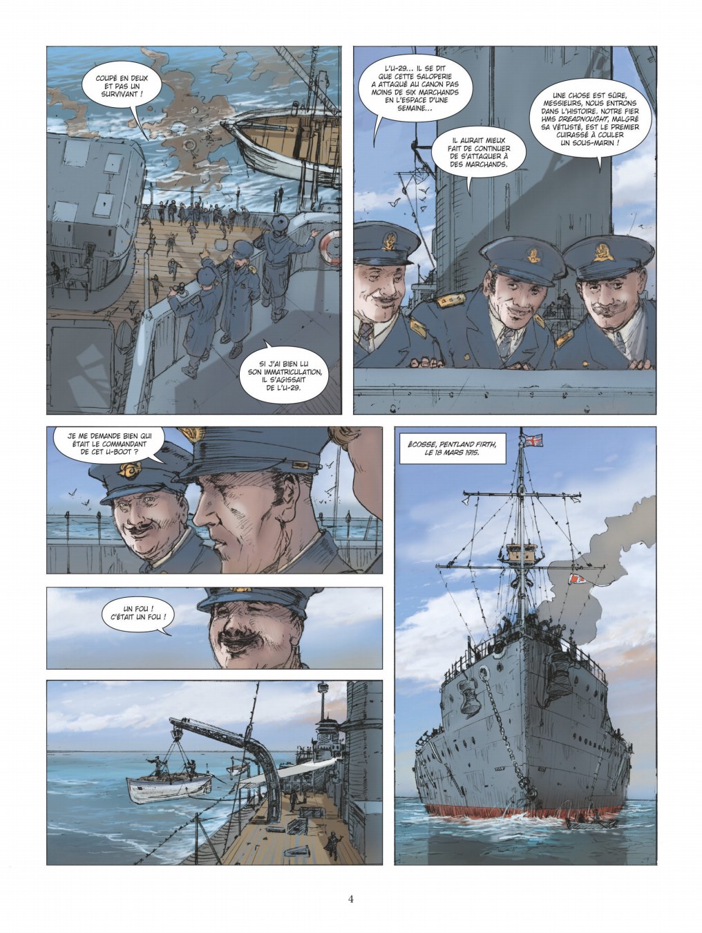 Un véritable camouflet pour la Royal Navy. - Ce tome contient une histoire complète indépendante de toute autre, qui ne nécessite pas de connaissances préalables. Son édition originale date de 2025. Ila été réalisé par Jean-Yves Delitte pour le scénario, par Philippe Adamov (1956-2020) pour les dessins, ceux-ci ayant repris par Fabio Pezzi après le décès de l’artiste initial, avec une mise en couleurs réalisée par Douchka Delitte. Il comporte quarante-six pages de bande dessinée. Il se termine par un dossier de huit pages, rédigé par le scénariste, généreusement illustré par des documents d’archives, avec des parties portant les titres suivants : Il y a d’abord l’histoire, Touché, coulé !, U-Boot une arme allemande, Un engin sale et malodorant, … qui deviendra une arme terrifiante !, Le canon ou la torpille ?, De l’arme méprisée à l’exploit !, Et après ? Ils se croyaient invulnérables… Ils pensaient pouvoir couler les plus puissants des navires, comme David, qui avec une simple pierre, avait terrassé le géant Goliath. Mais ils auraient dû savoir que la flèche s’est toujours brisée sur l’armure. Leur submersible pouvait bien déplacer près de 800 tonnes et filer à plus de 15 nœuds, tout cela avait peu d’importance quand une masse qui déplace plus de 18.000 tonnes à 20 nœuds vous éperonne. Un sous-marin éventré gît par le fond, les cadavres des marins flottant entre deux eaux. En surface, les officiers commandant un énorme croiseur-cuirassé se félicitent : ils viennent d’heurter un sous-marin allemand, il y a enfin une justice ! Coupé en deux et pas un survivant. L’un d’entre d’eux a pu lire son immatriculation : U-29. Un autre renchérit : il paraît que cette saleté a attaqué au canon pas moins de six marchands en l’espace d’une semaine. Le troisième se félicite : une chose est sûre : ils entrent dans l’histoire leur HMS Dreadnought, malgré sa vétusté, est le premier cuirassé à couler un sous-marin. La scène se déroule à Pentland Firth, en Écosse le 18 mars 1915. À Danzig, dans l’empire allemand, le 4 août 1914, des marins sont en train de charger des torpilles dans un sous-marin. L’oberbootsmann les tance : ils doivent faire attention avec le palan, s’ils ne veulent pas les envoyer au Paradis avant l’heure ! Il y a plus de cent-soixante kilogrammes d’explosif dans ces cigares ! Si cela explose, il ne restera d’eux que des lambeaux de chair… sans même parler des autres navires qui les entourent. Otto Eduard Weddigen est rejoint par son frère Karl, ensemble ils grimpent la passerelle pour accéder au pont, où un officier tend un journal devant lui : ils sont en guerre contre l’Angleterre, la presse en fait écho ! Otto le sait déjà : il a reçu ses ordres, le jeu infernal des dominos a commencé. Il explique : un archiduc autrichien se fait tuer par un fanatique serbe et, au nom des alliances, toute l’Europe s’embrase. Y a-t-il vraiment quelque chose de réjouissant ? Les deux frères redescendent à quai : Otto explique à Karl qu’il va larguer les amarres pour aller à Heligoland, un bout de terre perdu dans la mer, le tout ne doit pas dépasser deux kilomètres carrés. D’autres ordres doivent l’y attendre. Karl s’emporte : Si c’est comme ça que leurs amiraux conçoivent la guerre, ce n’est pas demain qu’ils danseront sur les Champs Élysées ! Il faut attaquer sans attendre, comme l’a fait Bismarck en 1870. Attaquer ! Il est possible que le nom d’U-9 soit inconnu du lecteur et que ce dernier soit venu pour découvrir une nouvelle grande bataille navale dans cette collection dont il apprécie les caractéristiques. L’auteur sait inclure des informations de manière organique et bien dosée, c’est-à-dire sans tomber dans des pages d’exposition avec de longues cellules de texte en petits caractères. Progressivement, il distille les faits et les indications permettant de situer cette bataille dans le temps, de comprendre la nouveauté que représentent les sous-marins à l’époque, et de découvrir de quelle bataille il s’agit précisément et les caractéristiques qui la font sortir du lot, et qui l’ont fait passer à la postérité. Arrivé à la fin de cette histoire, le dossier vient apporter des compléments forts bienvenus : sur l’histoire du développement des sous-marins (Lequel peut être considéré comme avoir été le premier à mériter ce nom ?), sur le rapport de force entre un sous-marin et un croiseur-cuirassé, sur le temps qu’il a fallu pour que naisse la lutte anti-sous-marine, sur les circonstances qui ont fait que dans l’imagerie populaire d’aucuns attribueront la paternité de cette arme à l’Allemagne, sur l’évolution des sous-marins qui passent d’un engin sale et malodorant à une arme terrifiante, sur le choix de l’arme entre le canon et la torpille, et sur l’après. Cet ouvrage s’ouvre sur un mot du scénariste en mémoire de l’artiste, à l’époque où celui-ci dessinait les séries Le Vent des Dieux (tomes 1 à 5, 1985-1991), et Les Eaux de Mortelune (tomes 1 à 10, 1986-1998), toutes les deux écrites par le scénariste Patrick Cothias. Il explique que Philippe Adamov avait réalisé une vingtaine de pages crayonnées, avant de larguer les amarres définitivement, et qu’alors s’est posée la question de savoir que faire de ce travail inachevé. En fonction de sa familiarité avec l’œuvre de cet artiste (également la série L’impératrice rouge, avec Jean Dufaux, quatre tomes, 1999-2003), le lecteur peut identifier les pages en question, ou il peut constater qu’il ne ressent pas de différence entre les deux artistes. Comme à son accoutumée, la coloriste choisit une palette de teintes réalistes, un petit peu ternies et assombries, pour être en phase avec le sujet de la guerre, les morts au combat, et les affrontements. Elle sait jouer des nuances d’une même tei