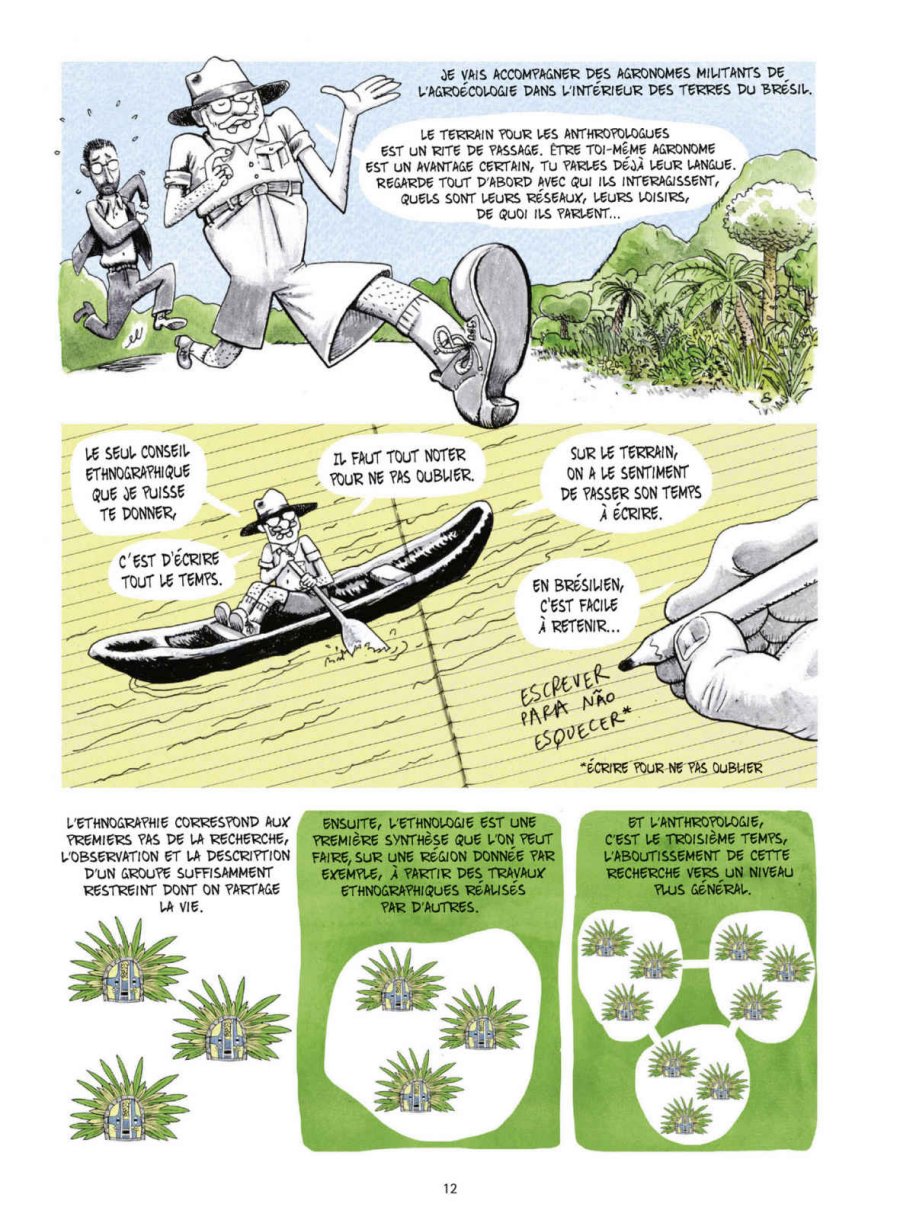 L’album nous propose un documentaire/reportage, sous le couvert d’une sorte de roman graphique. Il reprend l’enquête/étude menée par Sébastien Carcelle, qui adapte lui-même celle-ci. Plusieurs thématiques se croisent dans cet album, qui nous donne à voir le travail d’un chercheur doctorant, qui mêle pour son étude anthropologie, ethnologie et recherche sur l’agroécologie, en observant sur le terrain d’une région déshéritée du Brésil divers personnes ou collectifs, mais aussi en accompagnant des chercheurs et travailleurs sociaux brésiliens. Un autre aspect est très présent – il occupe même le cœur de l’album – c’est la politique : les soubresauts autour de l’accession au pouvoir de Bolsonaro (et les manœuvres pour rendre inéligible Lula da Silva), alors que la quasi-totalité des interlocuteurs du chercheur français sont proches du Parti des Travailleurs (PT) de Lula. Il est vrai que l’agroécologie s’oppose frontalement aux intérêts des tenants de l’agrobusiness et de l’agriculture intensive : certains passages en montrent les effets. L’album se laisse lire facilement, même si je l’ai parfois trouvé un peu trop « léger », comme si on hésitait entre le documentaire solide et aride et l’histoire plus « personnelle » du chercheur. J’avais déjà croisé le dessin de Laurent Houssin, mais dans des séries bien moins sérieuses, en tout cas franchement marquées humour, noir ou con. Ici, avec son style moderne et simple, il nous propose quelque chose de très lisible. J’ai juste été surpris par l’utilisation parcimonieuse de la couleur, qui s’invite de temps en temps, sans que j’aie pu comprendre la logique de ces choix.