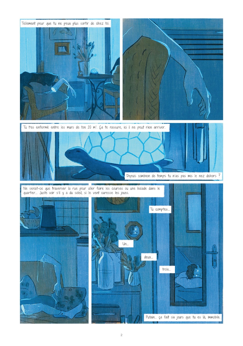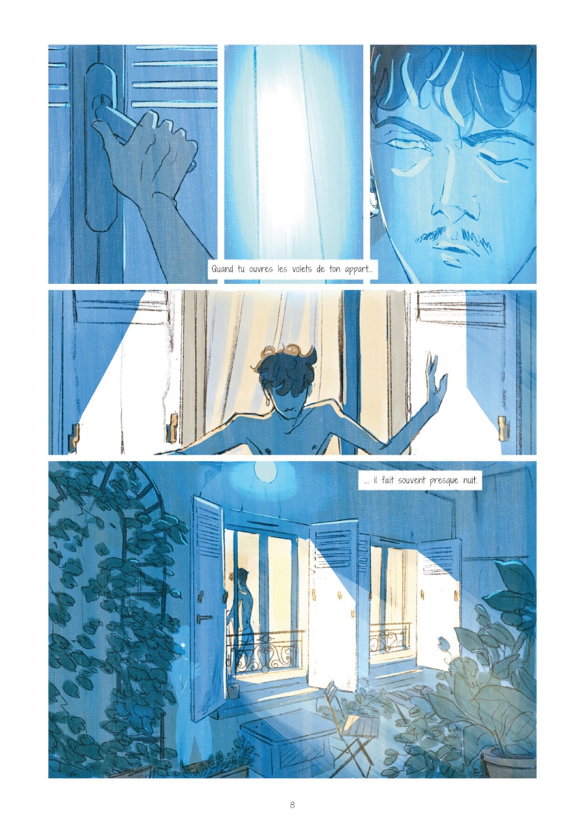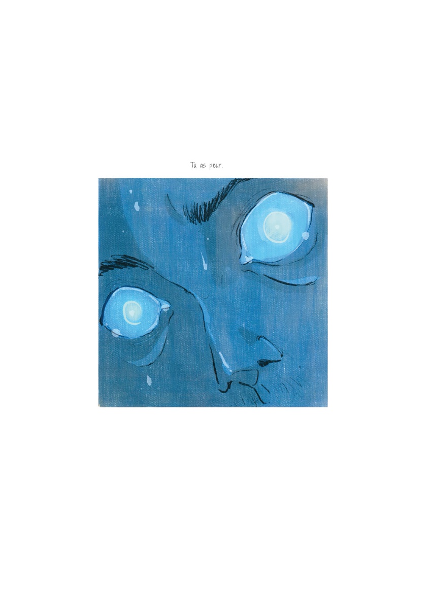 Quentin Zuttion est un auteur appréciant les BD "à thème". Ses dernières productions arrivaient néanmoins à s'évader de leur sujet pour gagner du souffle, de la vie, autrement dit à ne plus se contenter d'illustrer un thème pour mieux l'habiter. Voilà pourquoi je trouvais plus intéressants La Dame blanche et Toutes les princesses meurent après minuit, quand Appelez-moi Nathan et Touchées me laissaient un léger goût d'inachevé. Avec "Sage", il s'essaie à l'autobiographie, proposant de décrire son extrême anxiété, notamment liée à son homosexualité. Les critiques lues ici ou là sont dithyrambiques, aussi je m'attendais au fameux album de la maturité, tout en craignant un égocentrisme forcément exacerbé susceptible de m'agacer aux entournures. Malheureusement, me concernant, la balance penche plutôt vers le nombrilisme quelque peu agaçant. Cela me fait penser à la BD Impénétrable, pour laquelle j'avais également été assez circonspect malgré une sympathie évidente pour le projet. Et cela me fait réévaluer mes critiques à l'égard de Davodeau. Il n'est pas aisé pour un auteur de trouver le bon positionnement quand on aborde frontalement le témoignage. Parvenir à susciter auprès de son lectorat bienveillance et compassion pour ces histoires intimes révélées implique de générer de la curiosité et de ne pas forcer l'adhésion. D'une certaine manière, l'auteur doit obtenir le consentement de son lecteur, sous peine de le placer dans une position de voyeur condamné à se délecter des misères intimes révélées. Zuttion se met à nu, présente ses traumas, sa misère sentimentale, ses peurs et désirs... Visuellement, ses personnages bleus aux yeux de lumière, expressionnistes et quasi arachnéens, sont une indéniable réussite, illustrent fort joliment ses angoisses. Mais le récit intime n’échappe pas au voyeurisme ; et je m'étonne que l'acceptation sociétale de l'homosexualité ne soit pas davantage conviée, que la psychanalyse soit autant écartée. Une demi-réussite donc, ambitieuse et susceptible de déplaire.