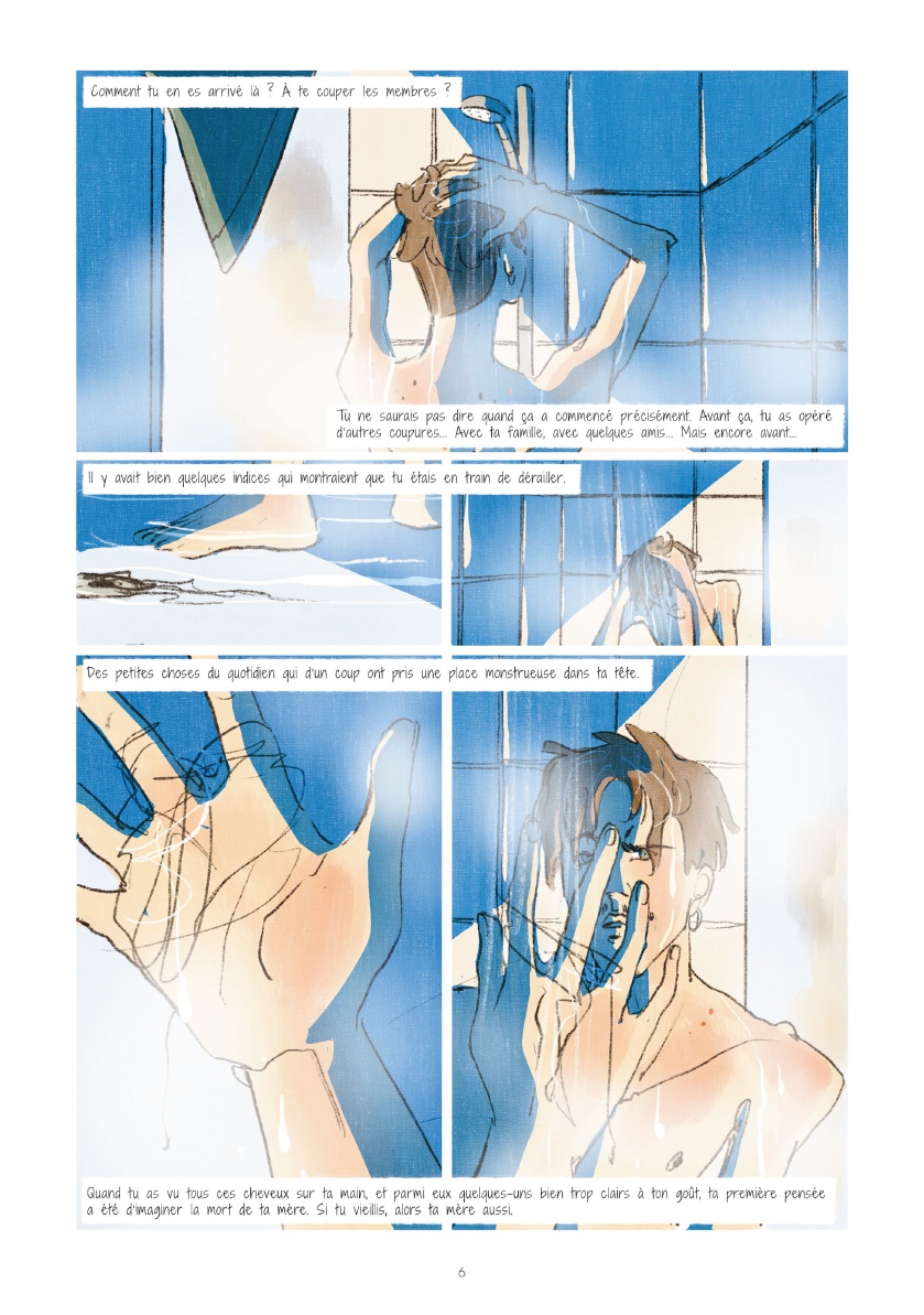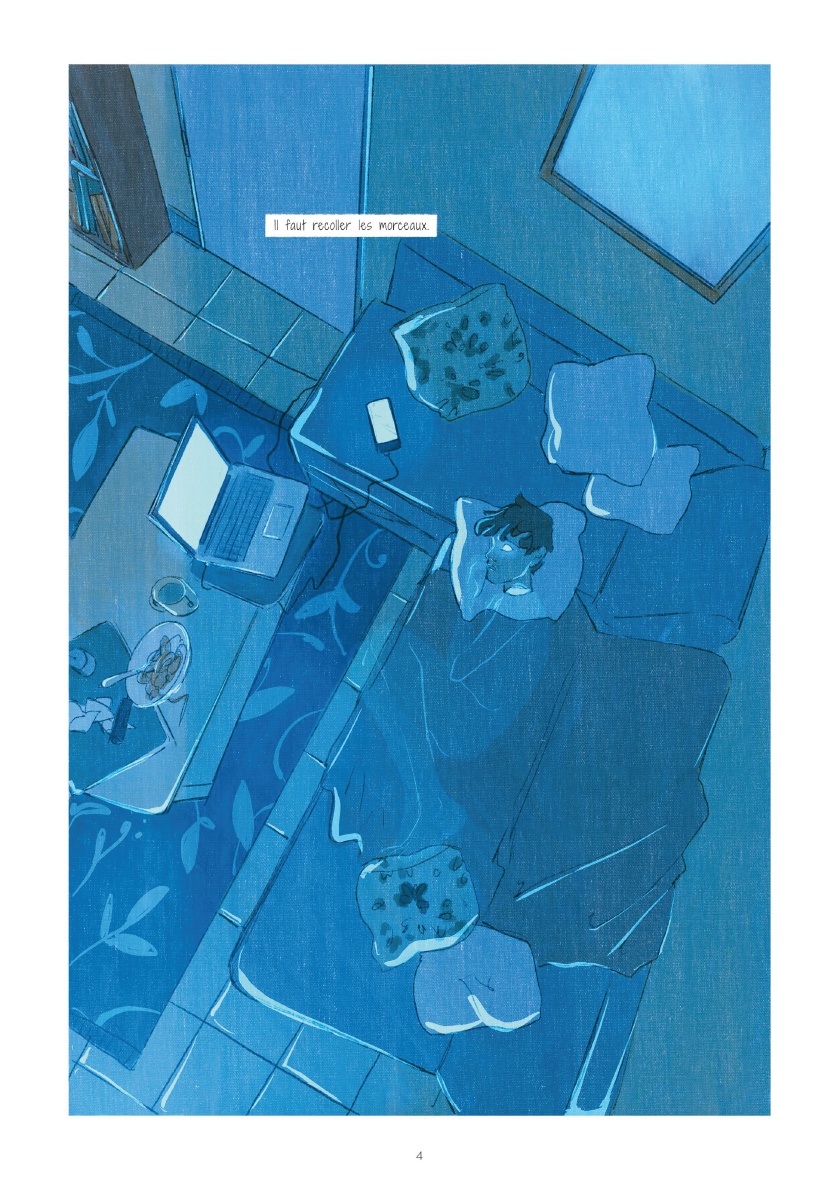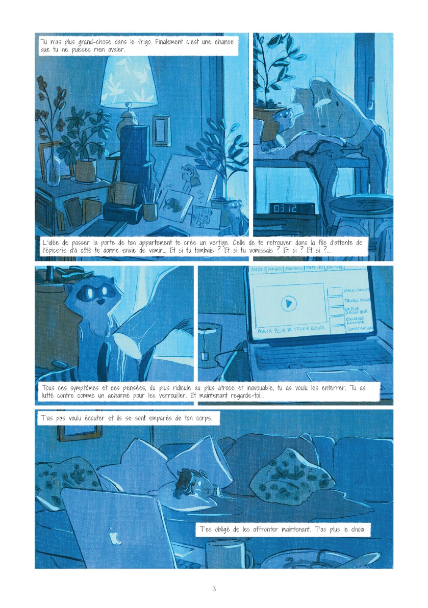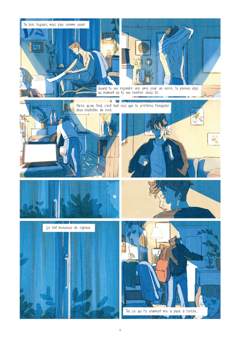 Quentin Zuttion est un auteur appréciant les BD "à thème". Ses dernières productions arrivaient néanmoins à s'évader de leur sujet pour gagner du souffle, de la vie, autrement dit à ne plus se contenter d'illustrer un thème pour mieux l'habiter. Voilà pourquoi je trouvais plus intéressants La Dame blanche et Toutes les princesses meurent après minuit, quand Appelez-moi Nathan et Touchées me laissaient un léger goût d'inachevé. Avec "Sage", il s'essaie à l'autobiographie, proposant de décrire son extrême anxiété, notamment liée à son homosexualité. Les critiques lues ici ou là sont dithyrambiques, aussi je m'attendais au fameux album de la maturité, tout en craignant un égocentrisme forcément exacerbé susceptible de m'agacer aux entournures. Malheureusement, me concernant, la balance penche plutôt vers le nombrilisme quelque peu agaçant. Cela me fait penser à la BD Impénétrable, pour laquelle j'avais également été assez circonspect malgré une sympathie évidente pour le projet. Et cela me fait réévaluer mes critiques à l'égard de Davodeau. Il n'est pas aisé pour un auteur de trouver le bon positionnement quand on aborde frontalement le témoignage. Parvenir à susciter auprès de son lectorat bienveillance et compassion pour ces histoires intimes révélées implique de générer de la curiosité et de ne pas forcer l'adhésion. D'une certaine manière, l'auteur doit obtenir le consentement de son lecteur, sous peine de le placer dans une position de voyeur condamné à se délecter des misères intimes révélées. Zuttion se met à nu, présente ses traumas, sa misère sentimentale, ses peurs et désirs... Visuellement, ses personnages bleus aux yeux de lumière, expressionnistes et quasi arachnéens, sont une indéniable réussite, illustrent fort joliment ses angoisses. Mais le récit intime n’échappe pas au voyeurisme ; et je m'étonne que l'acceptation sociétale de l'homosexualité ne soit pas davantage conviée, que la psychanalyse soit autant écartée. Une demi-réussite donc, ambitieuse et susceptible de déplaire.