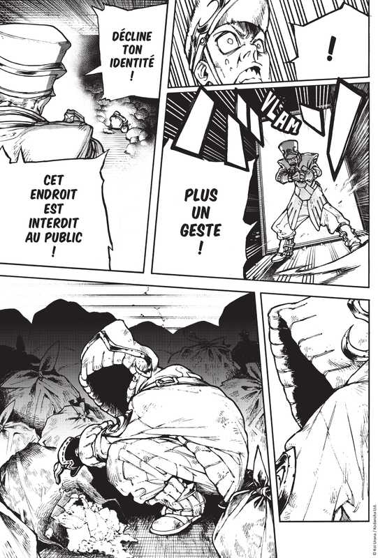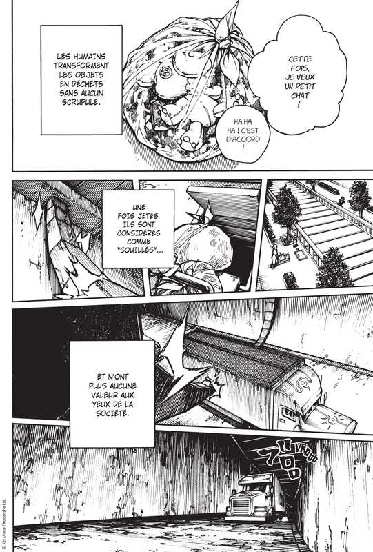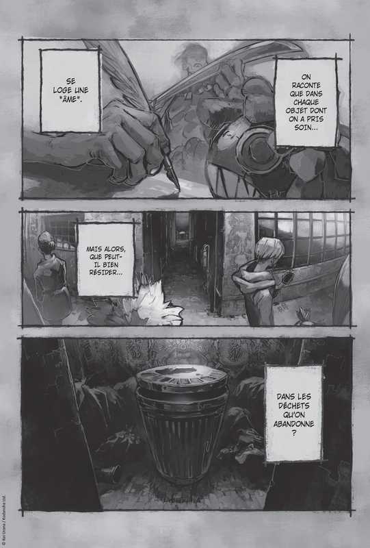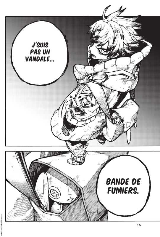 J'avais entendu parler de cette série en bien depuis si longtemps, d'autant plus depuis la sortie de son adaptation animée, que j'avais été surprise en constatant que la série n'avait toujours pas été ajoutée au site. Je profite donc de ma lecture découverte des 14 tomes sortis à présent pour l'ajouter à la banque de données. L'histoire est celle de Rudo, fils d'un meurtrier vivant dans un bidonville où sont parqués les descendant-e-s de criminel-le-s, un passionné de la réparation qui voue un amour inconditionnel à tous les objets jetés parfois sans même de remords par les habitants de sa cité. Au début l'histoire semble toute tracée : un récit sur la différence et la ségrégation entre deux strates de la population, un jeune héros à la vision unique qui va chambouler le monde qui l'entoure et changer les mœurs à sa manière, une destinée toute tracée même, qui sait ? Eh bien oui, c'est exactement ce qui va se passer (ou en tout cas dans les grandes lignes), mais l'histoire cache un dernier atout dans sa manche qui fait son charme : ce n'est pas dans cette cité que se déroulera l'intrigue mais en bas, dans le monde des détritus. La cité de départ est une cité volante, se déplaçant de part et d'autres du monde et jetant ses déchets par dessus bords sans le moindre état d'âme. Et c'est dans ce monde complètement pollué d'en bas que notre héros va se retrouver plongé après avoir été accusé à tort du meurtre de son père adoptif et condamné à mort. Devant faire ses preuves dans un monde différent de celui qu'il avait connu jusque là, un monde rempli d'amas de détritus vivants, de magiciens capables d’insuffler la vie à leurs objets adorés et de conflits de factions en veux-tu en voilà que notre bon Rudo va devoir faire ses preuves et, il l'espère, pouvoir un jour trouver le moyen de remonter au sein de la cité volante pour se venger. L'histoire est on ne peut plus classique, c'est son défaut le plus notable. Je commence par ça parce que j'ai déjà un peu abordé le problème dans mon résumé de l'histoire. Cette série est un shonen de type nekketsu, un type de récit à la construction narrative extrêmement connue et codifiée, ce qui n'est pas un mal en soi mais qui le devient dès lors que la formule ne se renouvelle pas. Ici, malheureusement (et c'est potentiellement personnel, vu comme beaucoup d'amateur-ice-s du genre semblent adorer cette série), je n'ai pas eu l'impression de voir la forme narrative pleinement renouvelée, ou a minima originale. La forme est on ne peut plus agréable - et je compte bien m'étendre là-dessus après - mais le fond, bien trop prévisible par moment, m'a un peu gêné. Le défaut n'est pas énorme, je reproche surtout le côté trop linéaire de certains moments et enchaînements. En revanche, pour ce qui est des reproches plus notables je mentionnerais tout de même rapidement l'exposition on ne peut plus maladroite et tombant bien souvent comme un cheveux sur la soupe (ça manque de naturel, quoi). Le récit fait scripté, en fait, c'est ça le problème. Je sais que ce problème découle du manque de prise de risque narrative susmentionné, mais il n'empêche que ça fait chier quand au milieu de ma lecture je ne peux pas m'empêcher de me dire que tout ceci sonne parfois un peu trop comme un vieux JRPG, où l'on devine dès le premier regard quel personnage sera important ou non et où les ficelles scénaristiques se voient parfois un peu trop. En vrai la comparaison vidéoludique n'est pas tant un défaut à mes yeux, car les ficelles scénaristiques mises à part, ce monde donne envie d'être exploré, et tous ces propos de grandes zones pleines de dangers, de conflits de factions et de quête à la recherche d'une légendaire série d'équipement aux propriétés extraordinaires et fondamentalement liée au lore local sont le terreau propice à un petit jeu-vidéo dont je ne dirais certainement pas non. Bon, allez, le positif maintenant ! Graphiquement c'est charmant. L'artiste a un coup de crayon vraiment sympathique, ses designs sont joliment exagérés (qu'il s'agisse des expressions bariolés des personnages ou bien de leurs vêtements aux proportions chaotiques), ce monde "dépotoir" a une patte, une culture vraiment sympathique, on ressent bien dans les vêtements, les bâtiments, les objets du quotidiens que tout est fait de bric et de broc, que les gens ici ont beau subir les chutes de déchets d'en haut et leurs conséquences iels ont tout de même réussi à maintenir une civilisation stable (enfin aussi stable que possible). L'ambiance garbage punk où l'on rafistole ce que l'on peut, où le moindre déchet peut se révéler être un trésor, les graffitis aux murs traités comme des œuvres d'art légitimes et l'expression sincère d'être conscients, la camaraderie et l’entraide qui régit notre groupe de héros mis en contraste avec le monde froid et cruel (et toxique, surtout), ... Tout ça fait de cette série une formule on ne peut plus charmante, et c'est selon moi par là que la série tire sa force. J'ai déjà brièvement mentionné le travail des expressions mais je vais m'étendre un peu plus ! Le dessin étant déjà ouvertement exagéré, les personnages ne détonnent pas lorsque interviennent les cassures comiques, les déformations de visages pour appuyer les moments drôles, et j'avoue même avoir trouvé certains de ces moments honnêtement amusants. Voilà ! Même si c'est classique dans le fond c'est fun et entraînant dans la forme, et c'est déjà très bien. Je m'en veux sincèrement d'avoir autant insisté sur le côté parfois trop artificiel de la narration, surtout parce qu'il n'est pas si grave que ça (sauf en ce qui concerne l'exposition, je le trouve vraiment maladroit à ce niveau-là), mais c'est bien parce que le dessin et le monde m'ont semblé si intéressants que ce petit défaut a parasité mon appréciation. Pas un chef d’