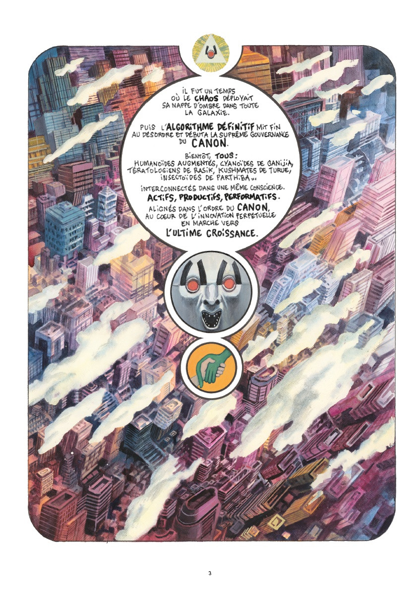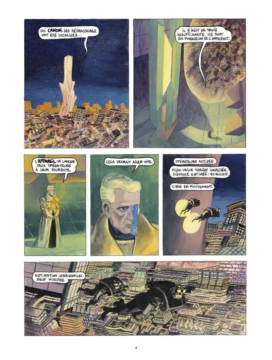 Un groupuscule d’activistes tente de soustraire ces chefs d’œuvres artistiques pour montrer qu’il existe une autre forme de culture… alors qu’ils sont poursuivis par les forces de l’ordre, ils cachent un buste de jeune femme du XVe siècle. Celle-ci est découverte par un robot, simple professeur de sport au collège qui, contre toute attente, troublé par cette œuvre d’art, décide de ne pas la rendre et de la protéger. Il devient alors un fugitif… Hugues Micol nous livre une réflexion très actuelle dans ce récit qui mêle la mainmise de l’IA sur la création, une action débridée et drôle, et mille références à la pop-culture. Dessinateur et illustrateur hors pair, Hugues Micol fait vivre ce monde du futur avec virtuosité dans des pages en couleurs directes spectaculaires !