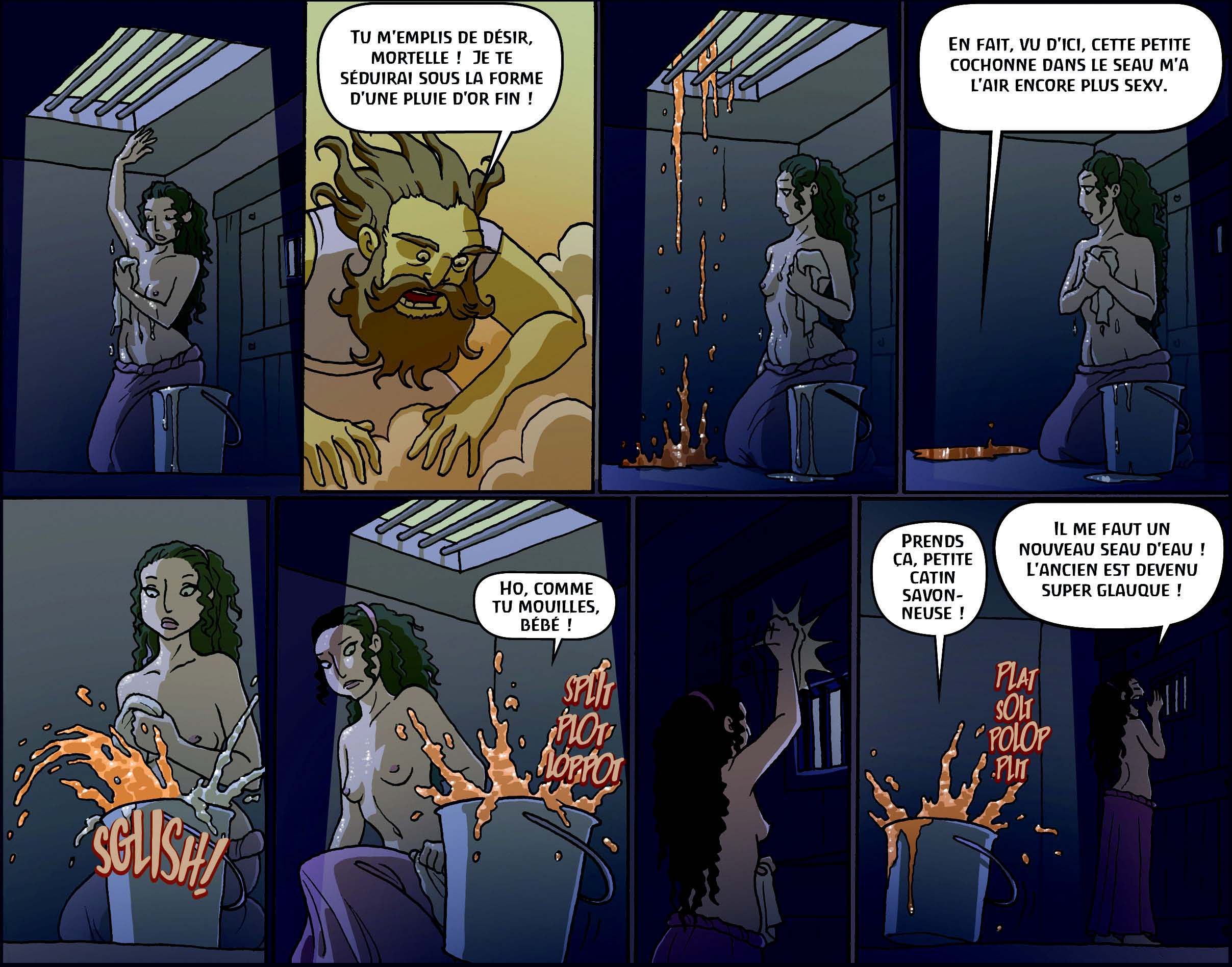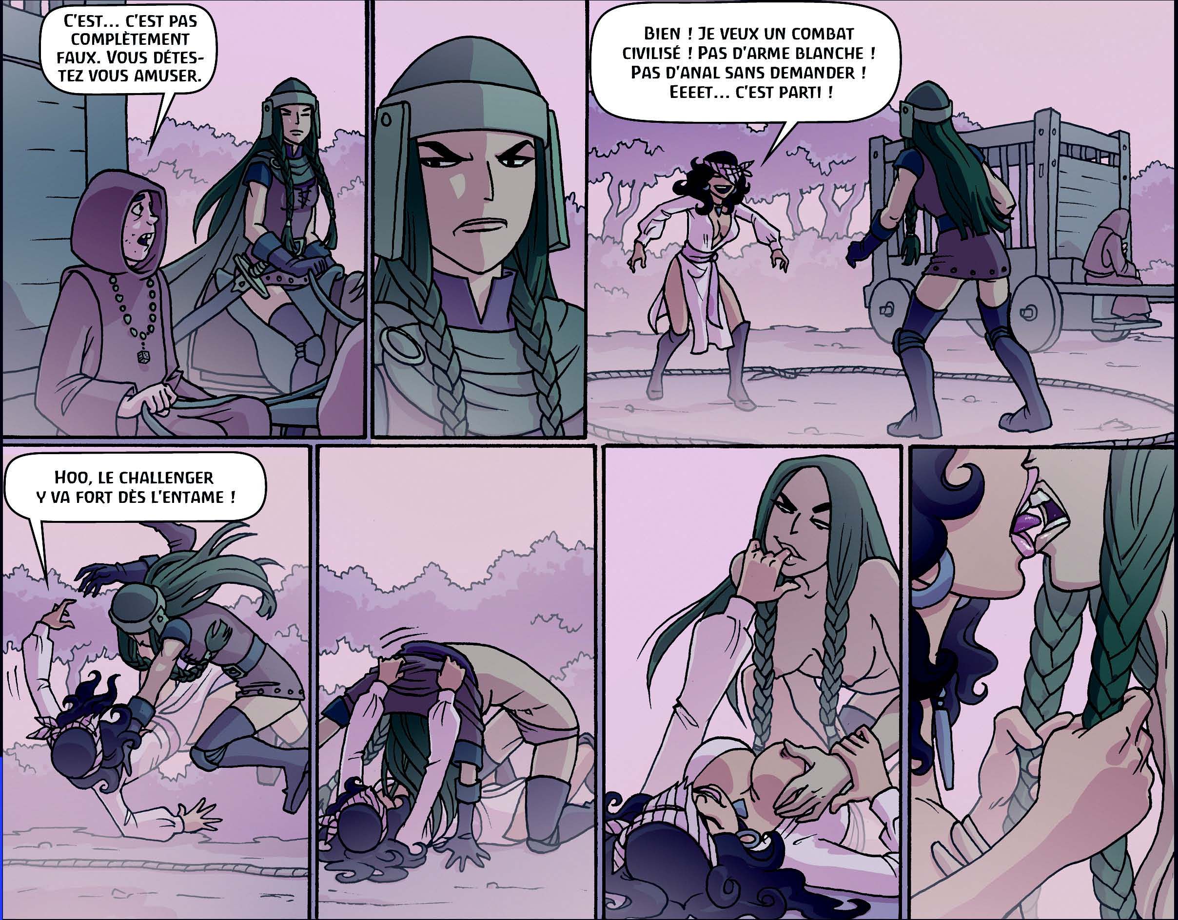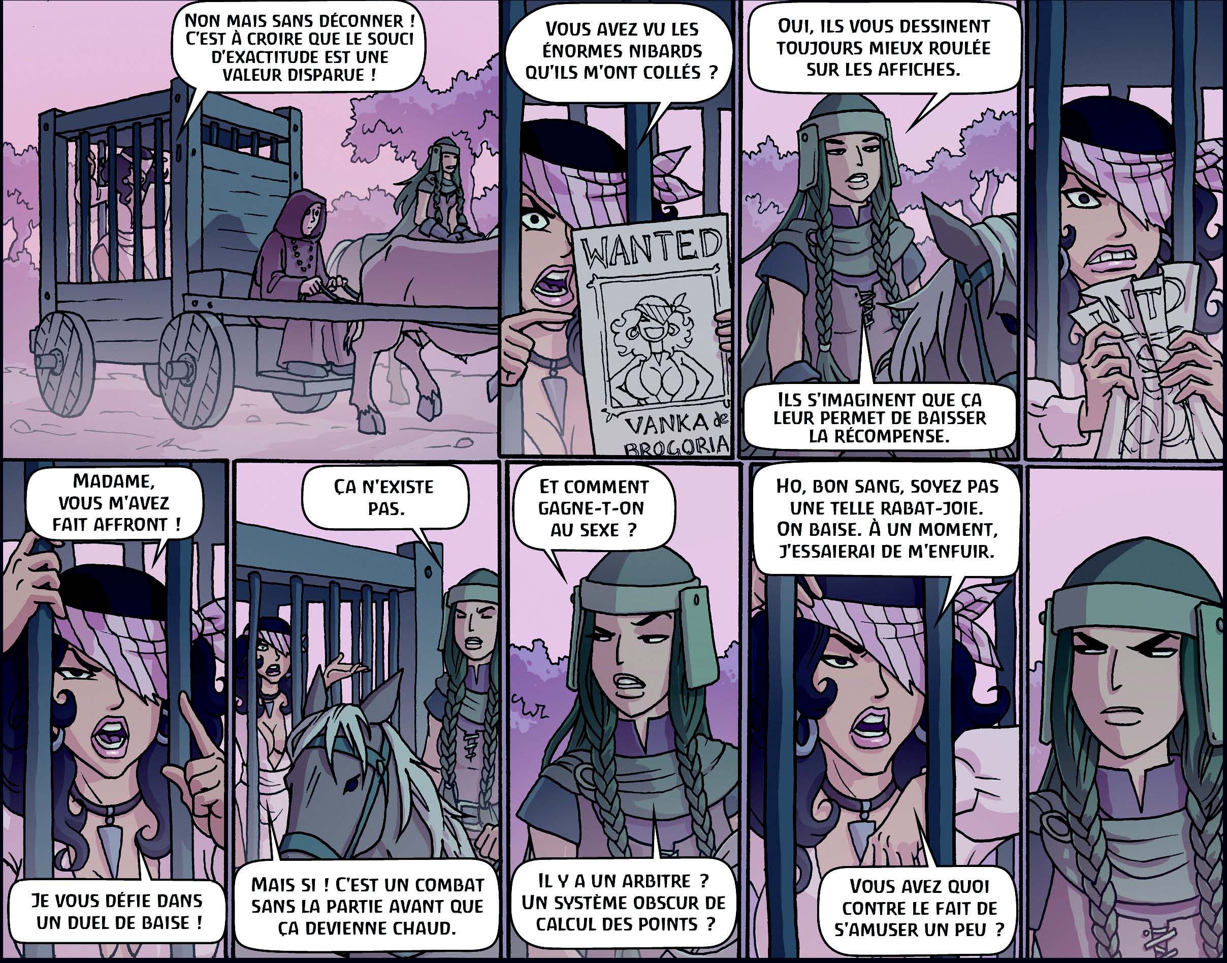 Vous saviez qu'Oglaf avait été traduit en français il y a près de 15 ans ? Vous saviez aussi que deux tomes traduits avaient été publiés ? Bah moi, jusqu'à il y a une semaine, non ! Oglaf c'est une série fourre-tout créée sur internet à la fin des années 2000 par deux artistes australien-ne-s et qui consiste en une succession d'histoires courtes très souvent décousues, autour d'une pelletée de personnages dont certains reviennent régulièrement, mais qui resteront tout du long unies par trois aspects : la comédie, l'univers fantastique et… le cul ! On parodie les archétypes du jeu de rôle, des légendes anciennes, des mythes antiques, des contes, bref tous les poussifs du répertoire fantastique, et au milieu de tout ça les personnages baisent à tout va. Entre deux quêtes et quelques tortures on a bien le temps pour des galipettes et des câlins. Je n'ai jamais su pleinement dire ce qui prévalait le plus entre la nature comique et la forme ouvertement (et bien souvent absurdement) érotique de l'œuvre, les deux font partie intégrante de l'œuvre et pourtant ne sont pas indispensables pour que l'on reconnaisse la patte "Oglaf". Beaucoup de gags ne reposent pas du tout sur la moindre allusion sexuelle, d'autres gags ne sont presque que des excuses pour de l'érotisme facile (surtout au début), et pourtant les deux restes indissociables à ce qui fait d'Oglaf ce récit "absurdo-érotico-fantastico-médiéval". Pas juste du cul à tout va, pas juste de l'aventure parodique, pas juste non plus de la comédie déjantée. Comme dit plus haut les récits sont bien souvent indépendants et presque toujours très courts, pourtant quelques lignes narratives apparaissent quelques fois, on a le droit a de véritables aventures filées (comme les déboires du pauvre Ivan compilées dans le premier tome ou encore l'aventure de "La Chenille de l'Eclate" du second tome) et un casting de personnages réguliers se dessine assez rapidement, avec notamment Ivan l'assistant exploité, Kronar le barbare à la culture absurdement viriliste, Navaan la "docteure" avec quelques neurones en moins, les nains et leur caractère inventif et explosif, ou encore la guerrière blasée bien trop compétente pour le monde dans lequel elle vit (qui n'est jamais nommée d'ailleurs). Les personnages sont cons comme pas permis (sauf pour les rares ayant écopé du rôle d'Auguste et de souffre douleur récurrent), toutes les espèces sentientes ont une sexualité décomplexée, on a le droit à une grande variété dans les types de sexualités représentées (on a même très souvent le droit à des relations homosexuelles), une variété aussi dans les kinks et ressorts humoristiques mis en scène, … Bref, je risque encore de me répéter, c'est à la fois très con, très drôle et très très la baise (pour citer ma mamie). Petit passage sur la forme de ces deux albums. La traduction de Francis est bonne, les runnings gags et les punchlines marchent, honnêtement c'est réussi. Je ne saurais dire si la traduction de la dimension érotique de l’œuvre est tout aussi juste, je lis quasi-exclusivement ma littérature érotique en anglais (la langue des perfides grands-bretons), et puis il faut dire que certains termes francophones comme "foufoune" ont plus tendance à me faire ricaner que vibrer le pantalon. Pour ce qui est de la dimension érotique de l’œuvre, justement, je ne saurais pleinement attester de sa qualité. Comme expliqué dans quelques autres avis l'érotisme marche surtout en pur écrit chez moi et même si je peux juger objectivement la plastique des personnages comme typiques de ce genre de créations émoustillantes, je ne saurais dire si elle est ici particulièrement de bonne facture ou non. Et puis, n'étant pas sensible aux charmes masculins, c'est déjà tout une partie des scènes de jambes en l'air qui me passe au dessus de la tête. Allez, je reconnais tout de même que certains scénarios me parlent quand-même, que certaines prémisses auraient pu me faire rougir... si je n'étais pas déjà occupée à glousser. Bah oui, je lis cette série surtout pour la comédie ! Et puis de toute façon, encore une fois, c'est suffisamment varié pour qu'il y en ait pour tous les goûts. Pour ce qui est du dessin je suis mitigée. Subjectivement je l'affectionne, j'y suis attachée (peut-être parce qu'habituée), mais objectivement je lui reconnais un certain aspect trop "simpliste" dans beaucoup de designs, une colorisation parfois plate et un style webcomic typique de son époque qui ne parlera sans doute pas à tout le monde. Série comique, série fantastique ou série strictement pour adulte ? Je n'ai pas su choisir alors j'ai tranché pour la classer comme une série avant tout humoristique. Gardons juste en tête que la myriade de vulves, de pénis, d'anus, de seins et de brouettes moldaves en gros plans ne prédestinent pas cette lecture à un public jeunesse. Bon, après, rien ne vous empêche de faire lire à des ados les quelques gags sans cul (ou a minima sans rien d'explicite), il y en a des sacrément chiadés ! Même si beaucoup des premiers gags me paraissent un peu faibles, j'avoue trouver la série dans sa globalité assez savoureuse, alors je lui arrondis sa note au supérieur sans le moindre regret. (Note réelle 3,5) PS : Je suis surprise que l'intégralité du webcomic n'ait pas été publié en album, après tout la série continue toujours et la traduction francophone disponible sur le site des éditions Lapin est déjà allée très loin.