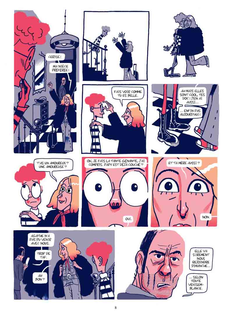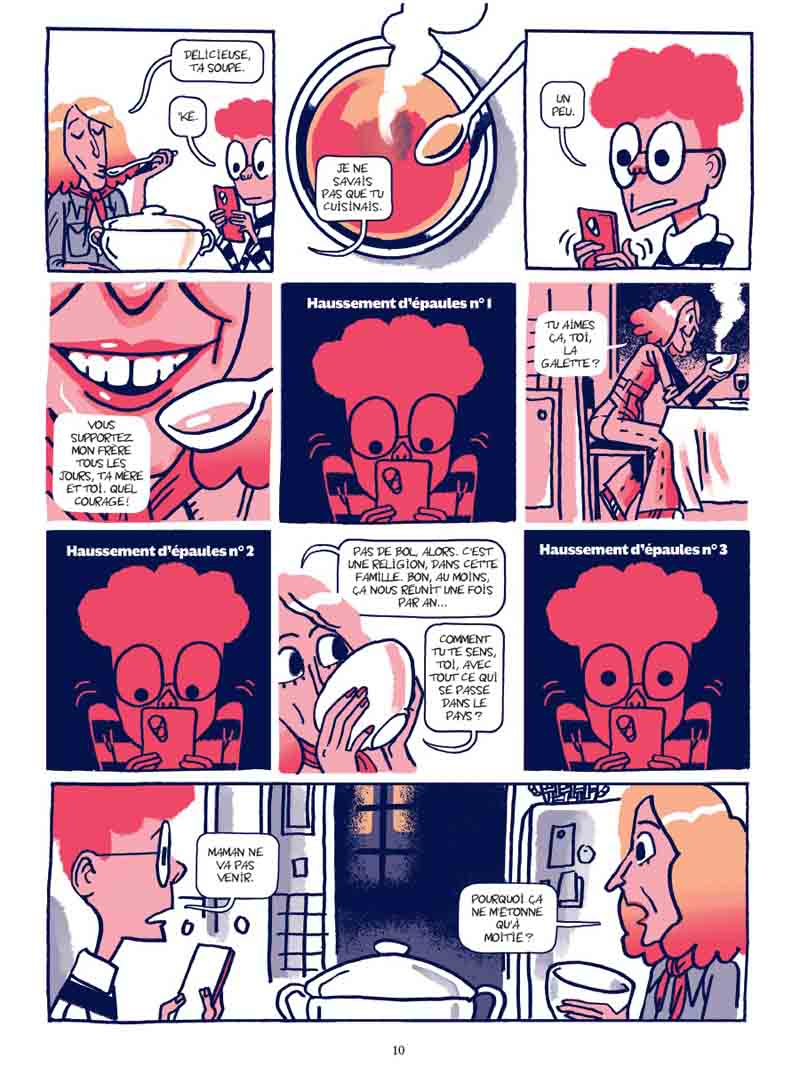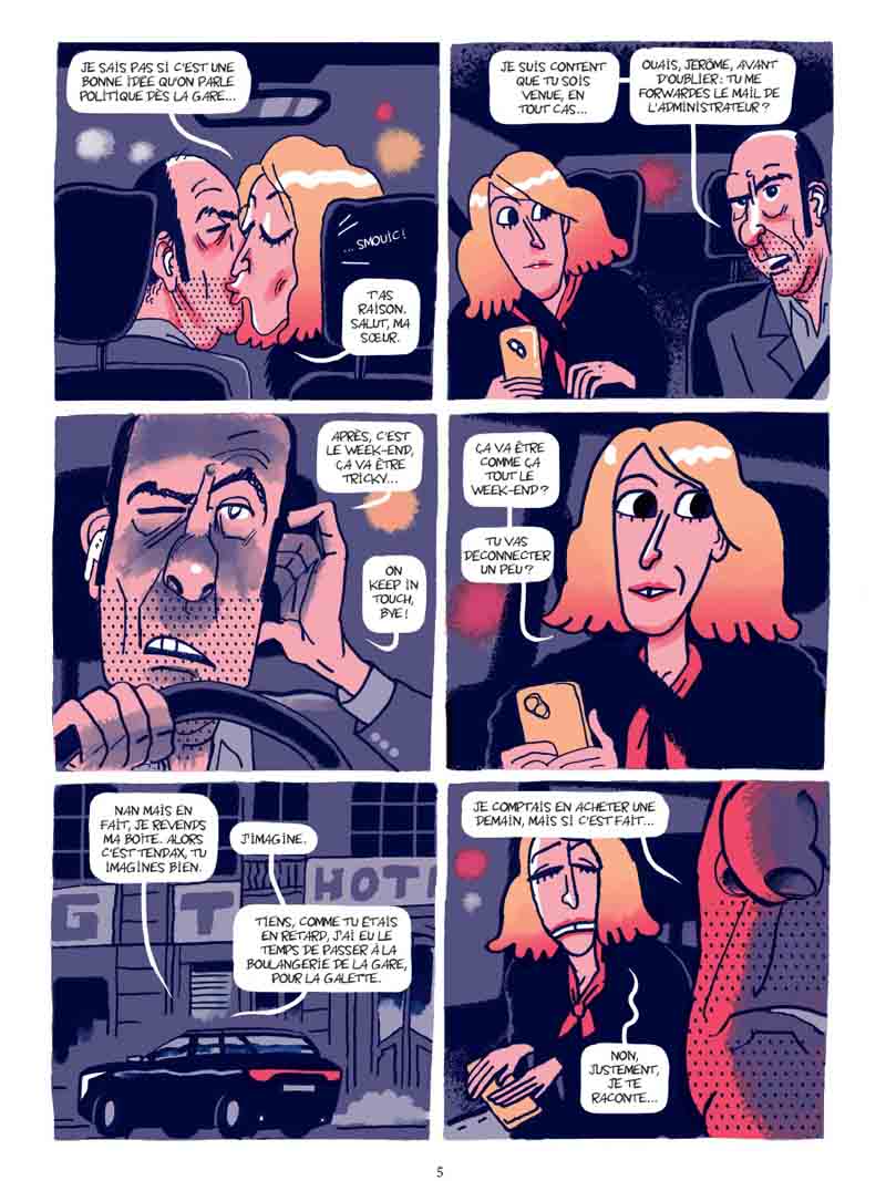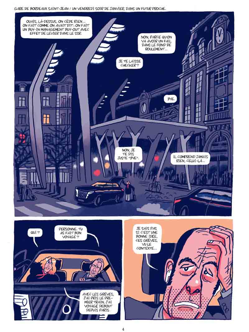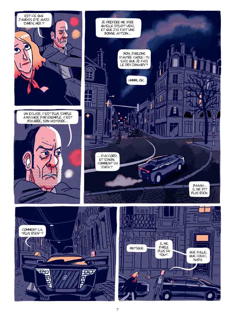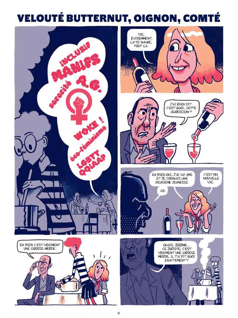 Auteur prolixe, Hervé Bourhis n’a pas perdu de temps depuis ses récentes escapades dans le passé : un biopic sur Paul Mc Cartney (Paul) et un polar, en tant que scénariste, dans les USA des seventies (tome 3 d’ American Parano). Ici, point de nostalgie, tant s’en faut, Bourhis revient dans un présent qui ne nous paraîtra que trop familier, mais un présent au conditionnel qui taquine le futur puisque l’action se déroule dans un avenir proche. Pour ce faire, l’auteur a actionné tous les leviers de la comédie déglinguée. Sur 80 pages sans temps morts, la lecture est très rapide mais elle fait tout de même son petit effet. « Frangipane », « comédie française pâtissière », semble avoir été écrite dans l’urgence, comme si Bourhis avait éprouvé le besoin d’exprimer sa saturation mentale à propos d’une époque, la nôtre donc, cernée par l’incertitude et les menaces, comme jamais dans l’Histoire récente. En jouant sur le décalage entre la préoccupation du protagoniste principal, Etienne — trouver impérativement une galette à la frangipane à l’occasion des retrouvailles familiales annuelles — et un contexte tendu (grèves, manifestations, guerre en Ukraine conjoncture d’événements ayant conduit à la pénurie de frangipane…), Hervé Bourhis a su produire une comédie grinçante à souhait, tel un miroir dans lequel chacun pourra se reconnaître plus ou moins. Et là, oui, ça pique un peu. De même, il a parfaitement synthétisé notre époque, où les valeurs semblent s’inverser, où les opinions se polarisent, où le débat semble parfois impossible dans un climat hystérisé par les discours d’extrême-droite, relayés par une sorte d’internationale mediatico-politico-financière. Et tant pis si le réchauffement climatique s’accélère et les inégalités s’amplifient… Même si les personnages apparaissent un rien caricaturaux, n’oublions pas qu’il s’agit d’une comédie, et l’analyse sociologique est plutôt pertinente. Etienne appartient à une espèce que tout le monde a pu côtoyer : L’ancien étudiant contestataire qui tente à cinquante balais de dissimuler ses échecs sous une panoplie de startuper, le podcast vissé dans les oreilles tout en baragouinant du « globish » dans son smartphone, et à côté de ça beauf râleur et arrogant qui se fantasme en rebelle éternel, prêt à faite un scandale au supermarché si on ne lui donne pas sa galette, peu importe si les stocks sont vides ! Sa sœur, « persona » de quadra gauchiste aux cheveux « jaunes et rouges », lesbienne « libérée » post-coming-out, mais restant au fond d’elle attachée à certaines traditions (c’est elle qui maintient cette réunion familiale annuelle autour de la galette, parce que Noël c’est trop ringard…). Quant au grand-père, qui s’est emmuré dans un silence réprobateur, il donne l’impression de subir la présence de ses enfants… Heureusement il y a Cerise, sa petite-fille pré-ado, avec qui il a une relation plus complice. La frangipane, c’est le cadet de ses soucis. Ce qui l’intéresse, elle, c’est de créer des potages, alors elle passe beaucoup de temps dans le jardin à dorloter ses légumes. Peu prolixe avec son oncle et sa tante, c’est elle qui a l’air d’être la plus saine d’esprit face à ces adultes s’auto-caricaturant jusqu’au ridicule… D’un point de vue graphique, on pourra toujours trouver que Bourhis a fait mieux, mais ce style foutraco-minimaliste et faux-bâclé, ce trait mariant allègrement (sans transition ?) mines dures et mines tendres, c’est sa patte et ça fonctionne assez bien. Dans cette approche comique, il y a une scène presque glaçante soulignant à merveille une certaine désinvolture ambiante, celle de la fête chez les voisins où chaque convive porte le masque d’une personnalité médiatique, type Trump (évidemment…), Xi-Jing Ping, Balkany ou professeur Raoult (je n’ai pas reconnu les autres…). Pour un peu, on se croirait dans Rosemary’s Baby, chaque participant étant tenu de rire avec tout le groupe à la moindre blague pourrie, sous l’emprise du gaz hilarant… Mais surtout, on retiendra de ce livre la forte ressemblance du personnage d’Etienne avec Jean-Pierre Bacri, qu’on aurait en effet très bien vu dans le rôle si « Frangipane » était un film… Et on peut facilement y voir un hommage de la part de l’auteur. Globalement, cette comédie grinçante où les dialogues font mouche constitue une lecture bienvenue au milieu d’une actualité nationale et internationale plus qu’inquiétantes. Preuve qu’on peut traiter un sujet très sérieux sur un mode burlesque et léger, sans pour autant fermer les écoutilles du déni et de l’impuissance, celles qui nous font dire parfois que désolé-mais-le-monde-actuel-est-trop-angoissant-je-préfère-rester-dans-ma-bulle-et-tant-pis-de-toute-façon-tout-va-péter-et-on-va-tous-mourir. A travers les personnages d’Etienne et Adèle, Hervé Bourhis laisse pointer une rage diffuse et souligne — avec humour certes — la part de responsabilité de ceux qui ont renoncé à leurs idéaux de jeunesse pour un confort tout relatif, tout en acquiesçant aux errements d’une classe politique censée les représenter. Des errements qui ont sans doute contribué au contexte actuel quelque peu anxiogène. Pour éviter de sombrer dans le catastrophisme, le parti pris d’une comédie paraissait approprié voire salutaire. Le livre se termine tout de même sur une belle note d’espoir, car, tout burlesque soit-il, « Frangipane » réserve aussi quelques phases plus touchantes. On pense en particulier aux paroles confiées à Cerise par sa grand-mère mourante, vers la fin, soulignant chez l’auteur l’importance de la transmission.