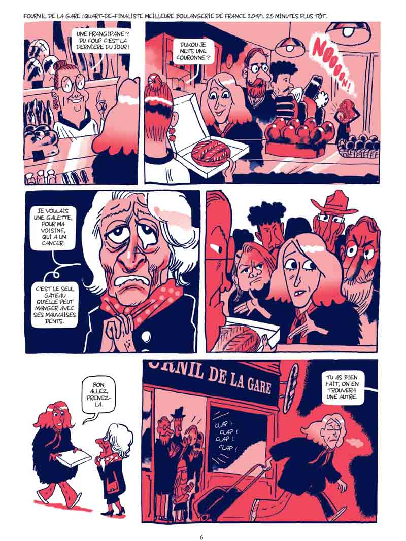 Une fois par an, Jérôme et sa sœur Adèle se retrouvent en famille dans la maison bordelaise de leur vieux père pour manger la galette des Rois. Cette année encore, chacun traîne des pieds pour se fader un repas de fête qui n’a plus rien de festif. Cette fois, l’ambiance est particulièrement tendue : les grèves sociales échauffent les esprits, le patriarche de la maison est frappé de mutisme et la pénurie de frangipane continue de sévir (un manque d’amandes dû à la guerre en Ukraine). Pour Jérôme, on ne déroge pas aux traditions ! Le quinquagénaire, entrepreneur en crise, et sa sœur, militante en herbe, se lancent dans une course effrénée à la galette en plein mouvement social. Mais entre les extrêmes qui tractent au marché le matin et les CRS qui chargent les manifestants l’après-midi, difficile de trouver une boulangerie ouverte. Ce qui commence comme un simple pari se transforme bientôt en odyssée absurde, drôle et poignante. Entre désaccords politiques, révélations familiales et gaps générationnels, la frangipane cristallise les tensions de cette famille au bord de la crise de nerfs. À moins que leur père n’ait quelque chose à dire… Dans une France fracturée, Frangipane se lit comme une fresque sociale interrogeant notre rapport aux traditions et à la famille, une comédie contemporaine douce-amère où se croisent souvenirs, rancunes, rêves brisés et espoirs ténus. Entre satire sociale et tendresse familiale, Hervé Bourhis, connu pour son humour grinçant, dresse le portrait d’une époque où même les amandes manquent, mais où l’humour et l’amour persistent. Sous des airs de comédie légère, l’album, écrit en amont, anticipant la dissolution de l’Assemblée nationale et la montée du RN aux législatives, est une pépite qui se dévore d’une traite.