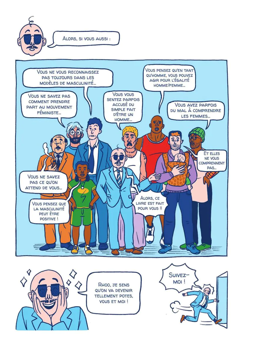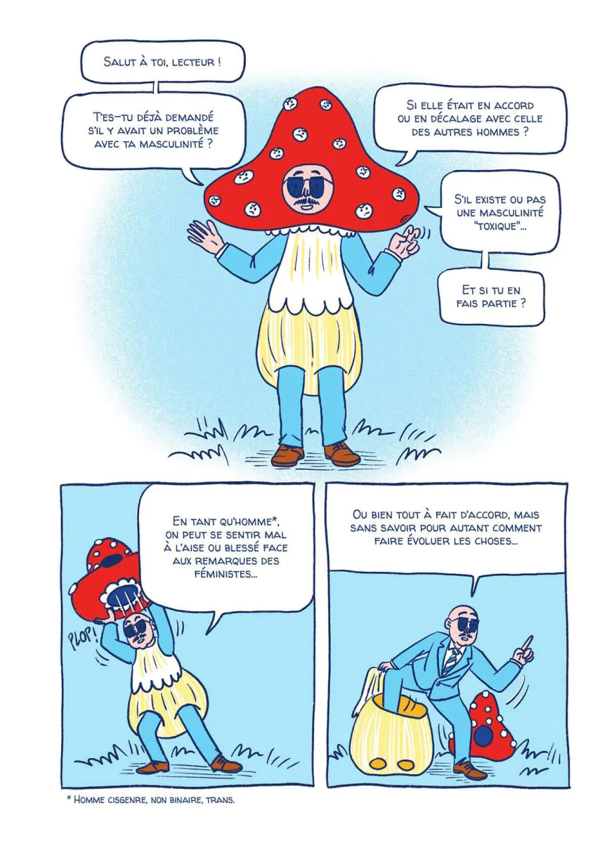 En quoi le féminisme qui traverse la société contemporaine concerne aussi les hommes ? Permettrait-il aux hommes une vie meilleure ? C'est ce que cherchent les personnages de cet ouvrage pratique qui permet à chacun de comprendre ce qui se joue dans la société patriarcale. Aidé de Selma, Jim et Dédé vont partir en quête des nouvelles masculinités pour construire les hommes qu'ils veulent être. Ils vont chercher à analyser les dynamiques sexistes qui se jouent à l'échelle de la société, du couple et de leurs groupes d'amis. Ils creusent et questionnent les réflexes des hommes face à un sentiment d'accusation et prennent le temps d'écouter ce que chacun a à dire sur ce sujet. Que recouvre le réflexe du "not all men" ? C'est quoi la cancel culture ? Peut-on vraiment être un homme féministe ? Avec humour et sincérité, de la déconstruction à la reconstruction, un livre pour les hommes qui veulent comprendre et se prendre en main pour devenir les acteurs du changement. Texte : l'éditeur