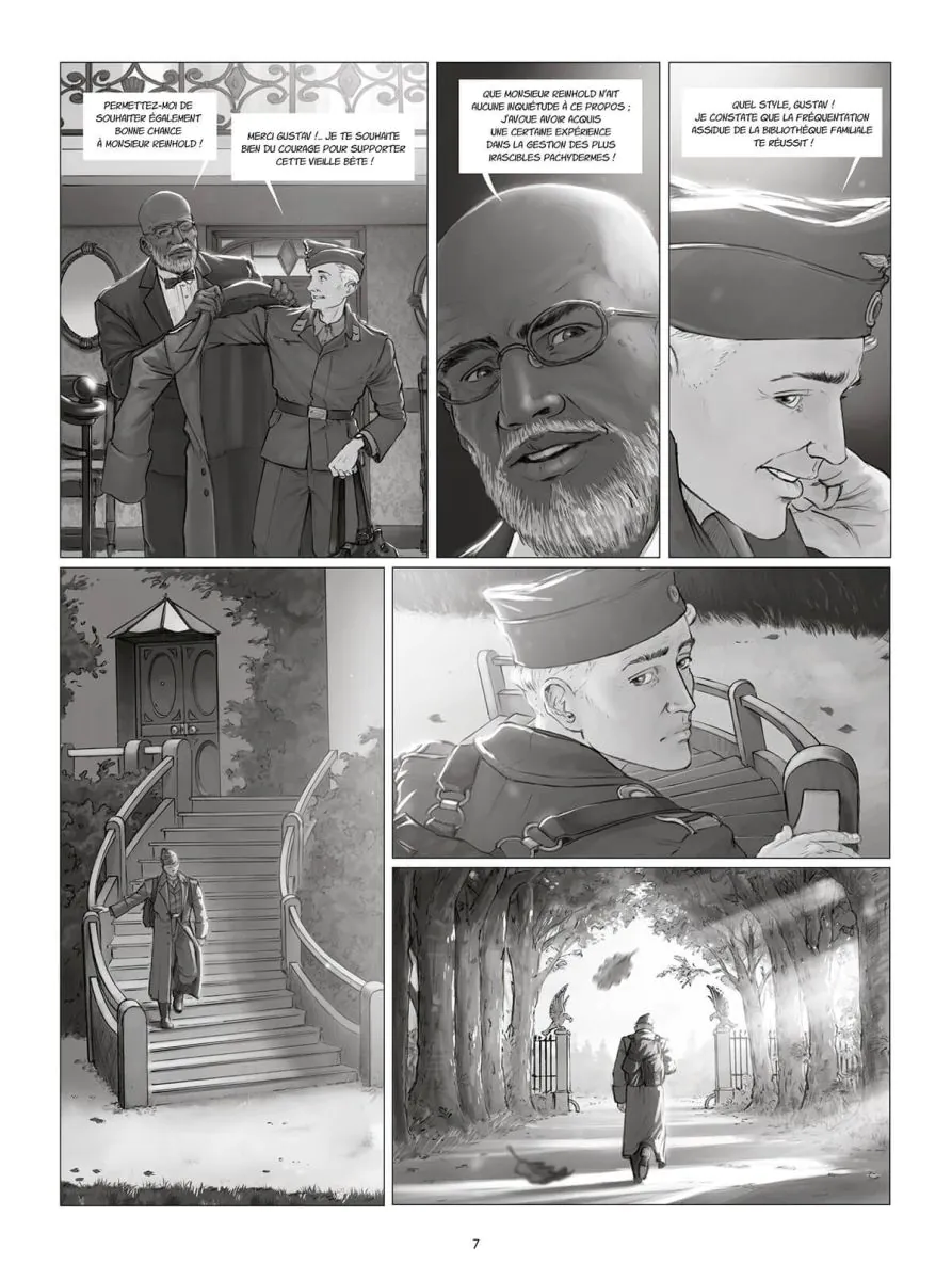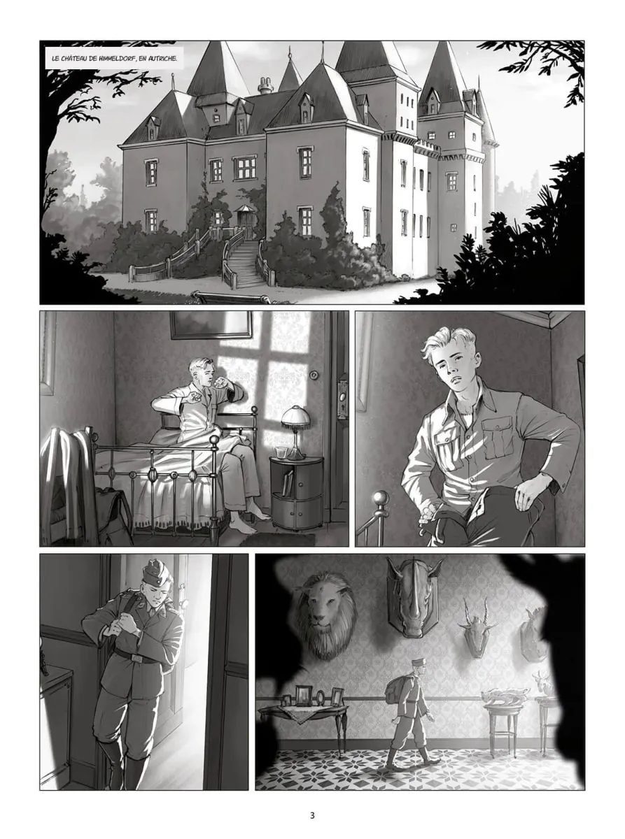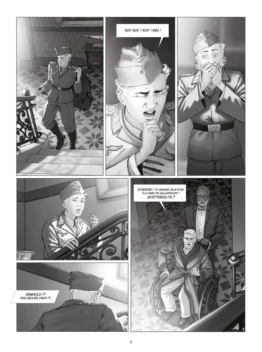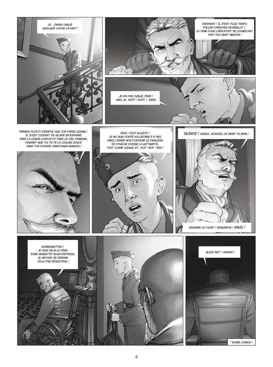 Seconde Guerre mondiale. Deux frères issus de la noblesse allemande sont pilotes dans la Luftwaffe. Autant l'un, basé à Guernesey alors occupée par les nazis, connaît le succès auprès des femmes et bénéficie surtout de l'admiration de leur père, autant l'autre est perçu comme un faible par ce dernier et survit à coups d'amphétamines sur l'éprouvant front russe. Pourtant, c'est bien ce plus jeune frère qui s'attire les honneurs après avoir détruit plus de cinquante chars soviétiques à bord de son lourd avion de combat. A l'inverse, l'aîné finit par faire la honte de sa famille en épousant une Britannique… juive. Rhino s'ouvre comme une série d'aviation et d'aventure historique très académique. Quelques flashbacks viennent préciser le contexte familial des protagonistes, les scènes de combat aérien sont propres et lisibles, et l'on découvre le portrait d'une famille noble en pleine déliquescence (un père handicapé et autoritaire, une mère qui se perd dans l'opium, un fils cadet qui lutte pour obtenir la reconnaissance paternelle, et un autre qui trahit l'honneur familial par amour pour une juive). Julien Camp a déjà fait ses preuves au dessin avec Eagle - L'Aigle à deux têtes. Son trait est impeccable, notamment dans la représentation des avions, parfaitement maîtrisée. La mise en couleur est plus inégale : parfois trop froide et informatique, notamment dans le flashback d'introduction, elle se révèle à d'autres moments lumineuse et convaincante, en particulier dans les scènes diurnes. L'intrigue est correcte et suscite l'intérêt, notamment par la question de l'évolution de cette relation familiale complexe au cœur de la Seconde Guerre mondiale. Mais elle manque encore d'envergure et d'originalité. La mise en scène souffre aussi d'un certain manque de clarté, avec des changements de lieux et de personnages peu balisés temporellement, ce qui rend la lecture parfois confuse tant que l'on n'a pas bien assimilé les différents éléments. Par ailleurs, tout n'est pas expliqué, en particulier la nature et la signification de ces "marques d'infamie" que les deux frères peignent successivement sur leurs avions (leur sens ne peut être que déduit a posteriori). N'ayant trouvé aucune trace historique de ce type de marquage, je ne vois pas non plus ce qui justifierait la réaction immédiate de Göring, ni pourquoi leur simple vue provoquerait sa fuite. Ce premier tome ne suffit pas à faire réellement décoller l'intrigue, mais il introduit des éléments qui pourraient devenir intéressants par la suite. Je demande donc encore à voir.