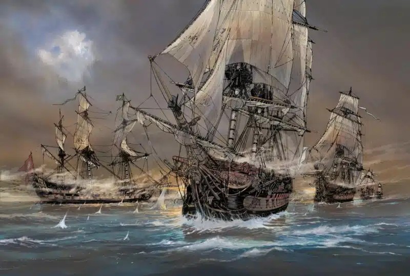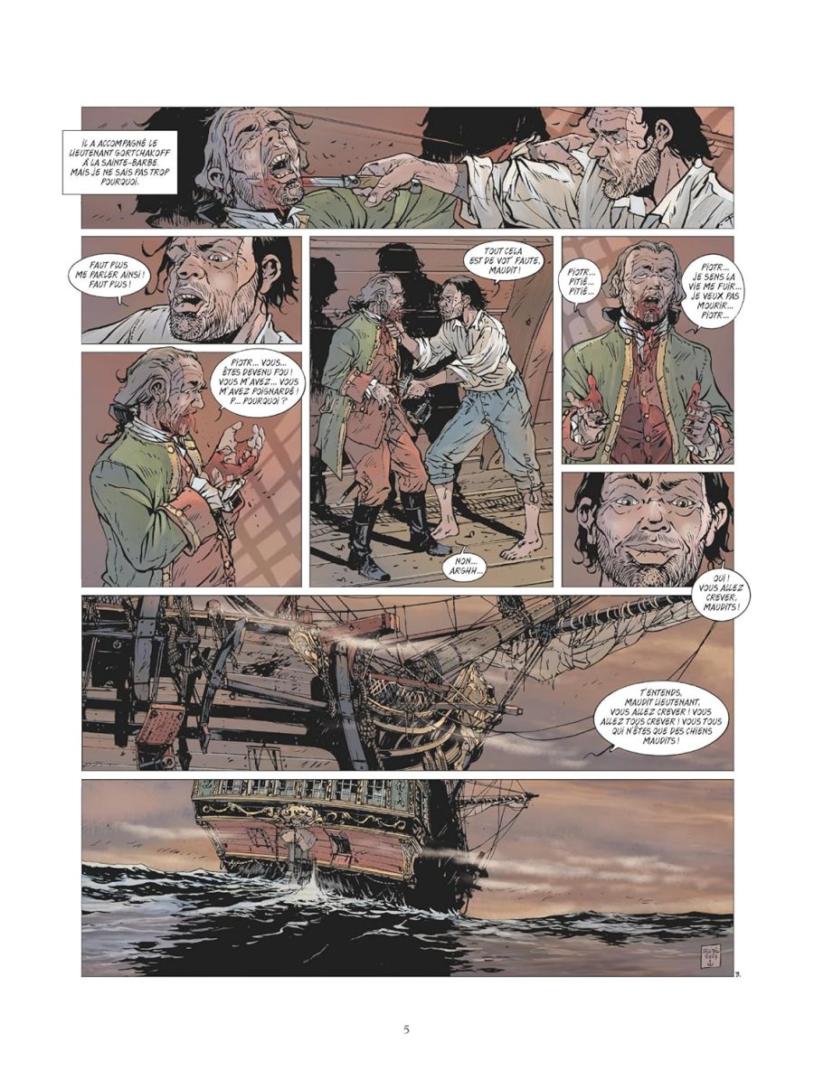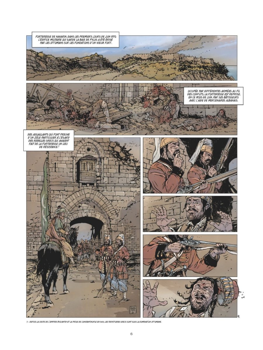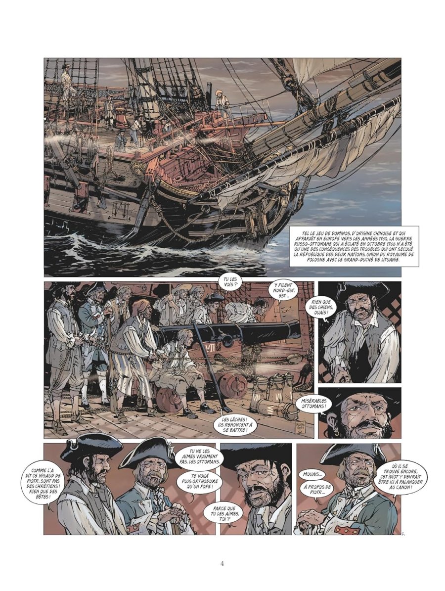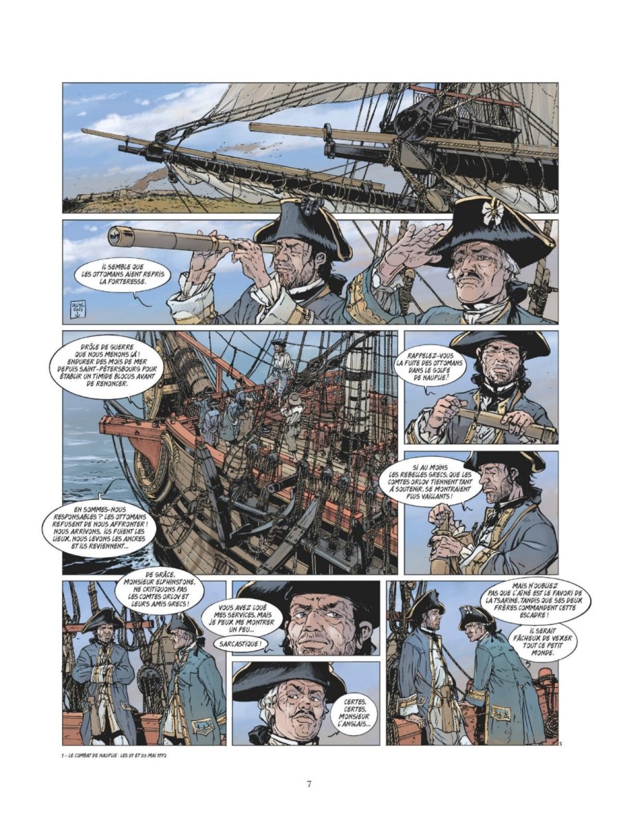 L’ordre et le respect de la hiérarchie ne peuvent pas être corrompus. - Ce tome contient une histoire complète indépendante de toute autre, qui ne nécessite pas de connaissances préalables. Il s’agit du vingt-troisième album de cette série sur les grandes batailles navales. Son édition originale date de 2025. Il a été réalisé par Jean-Yves Delitte pour le scénario et les dessins, avec une mise en couleurs réalisée par Douchka Delitte. Il comporte quarante-six pages de bande dessinée. Il se termine par un dossier de huit pages, rédigé par le scénariste, généreusement illustré par des documents d’archives, avec des parties portant les titres suivants : Il était une fois la Grande Catherine, Un jeu de dominos, Puisque c’est la guerre rêvons de grandeur, Une marine russe qui se relève, Et voguent les navires !, Se battre durant trois jours, Encore quelques batailles et puis la paix. On a appelé ce siècle celui des Lumières mais étonnamment, chaque fois qu’une guerre se terminait, on s’empressait d’en provoquer une autre. Dans une humanité qui ne peut se défaire de l’acte guerrier pour faire entendre sa voix, il y aura toujours des hommes prêts à en suivre d’autres. Et dans des temps où il en faut peu pour bouter le feu aux poudres et embraser le monde, le désordre finit toujours par s’étendre au-delà des frontières. L’homme a cette particularité de toujours trouver une raison prétendument légitime pour nuire. Tel le jeu de dominos d’origine chinoise et qui apparaît en Europe vers les années 1960, la guerre russo-ottomane qui a éclatée en octobre 1768 n’a été qu’une des conséquences des troubles qui ont secoué la république des Deux Nations, union du royaume de Pologne avec le grand-duché de Lituanie. À bord du Netron Menia, les servants s’affairent autour des canons pour tirer sur un navire ottoman. Pendant ce temps-là, le marin Piotr a accompagné le lieutenant Alexis Ivanovitch Gortchakoff à la sainte-barbe. Dans cette partie du vaisseau où sont serrés les ustensiles d’artillerie et la poudre, le marin embroche le lieutenant à la suite d’une algarade. Forteresse de Navarin, dans les premiers jours de juin 1770, l’édifice militaire qui garde la baie de Pylos a été érigé par les Ottomans sur les fondations d’un vieux port. Occupée par différentes armées au fil des conflits, la forteresse est reprise en ce mois de juin, par ses bâtisseurs avec l’aide de mercenaires albanais. Des assaillants qui font preuve d’un zèle particulier à l’égard des rebelles grecs qui avaient fait de la forteresse un lieu de résistance ! Sur le navire Netron Menia, un officier observe la scène avec une longue vue commentant qu’il semble que les Ottomans aient repris la forteresse. Il estime qu’il s’agit d’une drôle de guerre qu’ils mènent là : endurer des mois de mer depuis Saint-Pétersbourg pour établir un timide blocus avant de renoncer. Un autre officier lui demande s’ils en sont responsables. Il continue : Les Ottomans refusent de les affronter, ils arrivent, les ennemis fuient les lieux, ils lèvent les ancres et les Ottomans reviennent. Cette fois-ci, l’auteur peintre officiel de la Marine et membre titulaire de l’académie des Arts et Sciences de la Mer, emmène le lecteur en mer Égée dans le troisième tiers du dix-huitième siècle. Comme à son habitude, il donne corps à la reconstitution historique de cette bataille navale en entremêlant les faits, les visions des navires et des points de vue à hauteur de l’individu, exclusivement masculin. La lecture de la bande dessinée peut se suffire à elle-même pour un néophyte sur cette période de l’Histoire dans cette région du globe, ce qui requiert un bon niveau d’attention pour saisir les implications contenues dans les sous-entendus des discussions. Dès la deuxième planche, l’auteur mentionne la guerre russo-ottomane et les troubles qui ont secoué la république des Deux Nations. La première référence renvoie à la sixième guerre qui s’est déroulée de 1768 à 1774 et qui a opposé l’Empire russe à l’Empire ottoman, les premiers essayant d’obtenir un accès à la mer Noire. La seconde évoque un État formé par l'union du royaume de Pologne et du grand-duché de Lituanie de 1569 à 1795. Par la suite, le scénariste fait aussi bien mention d’événements ponctuels comme la prise de la forteresse de Navarin, que des grands de ce monde, comme Grigori Ivanovitch Orlov (1734-1783) et ses frères Alexeï Grigorievitch (1737-1807) et Fiodor Grigorievitch (1741-1796), de Catherine la Grande (1729-1796, Sophie Frédérique Augusta d'Anhalt-Zerbst). Il met également en scène John Elphinstone (1722-1785), un officier de marine anglais, ayant réellement existé, étant passé en 1768 au service de l’Empire russe. Le lecteur connaisseur de cette période replace sans difficulté ces repères, le néophyte apprécie qu’ils soient étoffés ou développés dans le dossier historique clôturant cet ouvrage, que ce soit le couple de Catherine II et Pierre III, un bref historique des enjeux des précédentes guerre russo-ottomanes, le début de celle qui éclate en 1768, l’état de la marine russe à cette époque, la composition de la flotte ottomane (seize vaisseaux de ligne, six frégates, treize galères, six chebecs et une trentaine de navires de charge, soit un total de mille trois cents canons), l’issue de la bataille terrestre de Larga en Moldavie, et la suite. Il en va de même pour la composante de la marine : la possibilité pour le connaisseur de voir ces bâtiments en action en conformité avec la réalité historique, ou l’occasion de découvrir à quoi pouvait ressembler une bataille navale à l’époque. Comme d’habitude les dessins des navires enchantent le lecteur. Une illustration en pleine page d’un navire russe pour commencer, au beau milieu de la bataille. Aucun dét