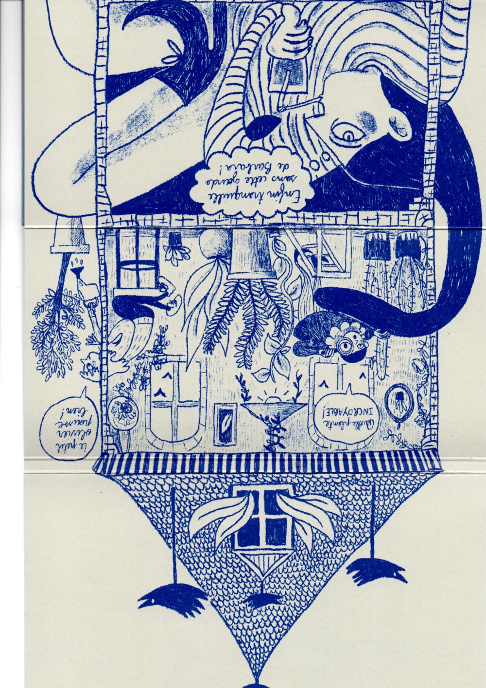 Comme la plupart du temps avec cette belle collection, je ressors avec un sentiment ambivalent de ma lecture. D’abord, comme toujours avec ce « petit éditeur », il faut saluer leur beau travail. C’est vraiment un bel objet, un chouette leporello, avec des couvertures aux belles couleurs. On prend vraiment plaisir à le déplier. Maintenant, le format original de cette collection bride forcément toute velléité de construire un récit, de développer ne serait-ce qu’une idée. Ça reste le plus souvent frustrant pour le lecteur. Et, si certaines fois j’ai davantage été réellement séduit, eh bien ici ça m’a moins captivé. Le dessin est un peu brouillon, mais ça passe. Mais surtout, ça ressemble plus à un assemblage de vignette, de petites observations. Et même les liens entre Claudine et Barbara (deux « géantes » qi semblent engoncées dans les étages de la maison qu’elles occupent avec d’autres personnages) restent finalement obscurs – si ce n’est que Claudine semble avoir quitté Barbara, ce qui la chagrine.