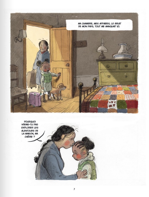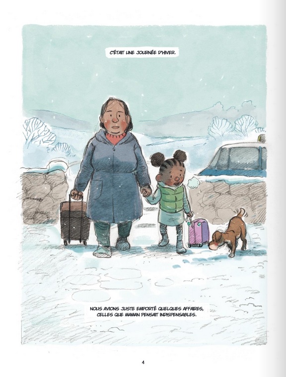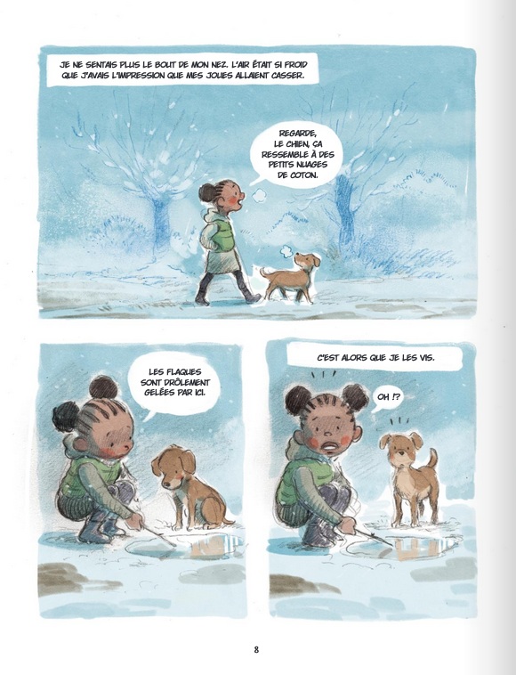 C'est avec la très bonne série sur la 2e Guerre Mondiale Quand la nuit tombe, que j'avais découvert le talent de dessinateur de Toni Galmés. Delcourt lui ouvre cette fois ses portes pour un album jeunesse où il gère cette fois le dessin et le scénario. C'est déjà un plaisir de retrouver toute la rondeur et la douceur de son dessin aquarellé ; je trouve qu'il se prête à merveille à la BD jeunesse. Avec cet album, nous suivons l'arrivée (en France ?) d'une maman et de sa jeune fille au coeur d'un rude hiver ; on les suppose réfugiées, sans trop savoir d'où elles viennent ni pour quelles raisons, mais il semble clair que la neige et l'hiver ne font pas parti de leurs habitudes. C'est lors d'une de ses balades que la jeune fille va tomber sur une troupe de démons qui traversent la campagne. Un des jeunes démon va finir par suivre la jeune fille et devenir son ami ; c'est le début d'une relation d'amitié singulière qui commence... Voilà un album qui vaut le détour ne serait-ce que pour le graphisme de Toni Galmés. L'album se lit vite (surtout pour un adulte), mais sait imposer une ambiance particulière en abordant par la bande des sujets sensibles qui devraient résonner aux oreilles des jeunes lecteurs.