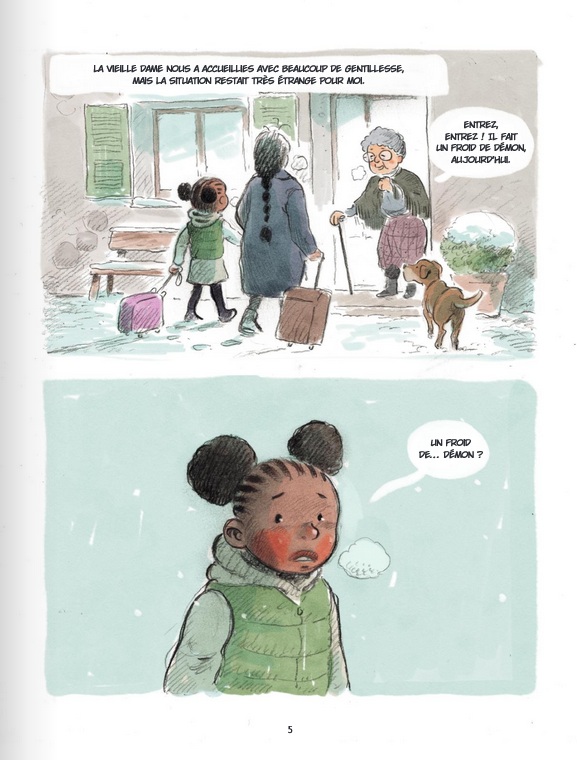 Une petite fille et sa maman, toutes les deux réfugiées d'un pays lointain, viennent vivre " de l'autre côté du monde ", un autre côté qui ressemble à la France. Elles débarquent en plein hiver et vont habiter chez une vieille dame qui les accueille et leur dit de rentrer " car il fait un froid de démons, dehors ". Il n'en faudra pas plus pour que notre petite héroïne en croise un pour de bon.