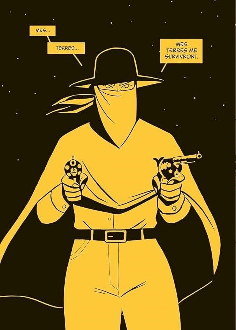 Mouais. Je ne sais trop quoi penser de ce petit album… Le dessin, qui use d’un Noir et Blanc tranché, stylisé et minimaliste est original. Mais le rendu est sec, parfois énigmatique. Et il concourt à ne pas trop dissiper le brouillard qui, me concernant, a passablement recouvert l’intrigue. Un en lieu indéfini, aux sonorités hispaniques pour les noms, à une époque elle aussi mal définie, mais dans une ambiance western (Mexique à la fin du XIXème siècle ???), nous suivons quelques personnages, issus de de grandes familles dominant la région. En particulier deux jeunes femmes (il faut dire que les femmes dominent, dirigent une sorte de société matriarcale, les hommes étant quasi absents du récit) qui, malgré les différends opposant les familles dont elles sont les héritières, vont devenir amantes. Voilà pour ce que j’ai réussi à clairement établir. Car pour le reste, c’est moins évident. En particulier, une sorte de fantastique latent, en tout cas une menace (des êtres nommés « Ceux-là ») décime les troupeaux, chaque famille luttant contre cette menace, et celle de classiques voleurs de bétails. Mais, comme pour le dessin, l’essentiel est esquissé, évoqué, on n’entre jamais réellement, en tout cas clairement, dans le sujet, et j’ai traversé l’album sans vraiment m’attacher au récit ou à ses protagonistes, c’est dommage. Note réelle 2,5/5.