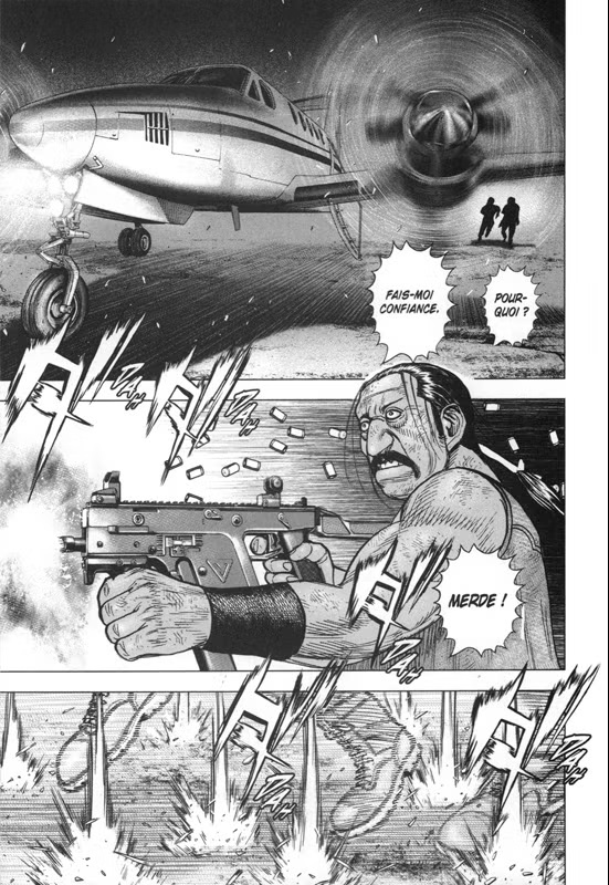 Histoire de malfrats. Zig est un héros pacifique, un ancien soldat japonais, puis engagé dans la Légion étrangère via la France. Il a vu trop de morts et fait tout pour l'éviter quand il se fait engager dans une nouvelle mission, usant d'armes non létales. Un petit côté Nicky Larson imbattable. En face il doit lutter contre 4 gros bourrins dotés d'armes lourdes. Les auteurs semblent s'éclater à dessiner tout un tas d'armes, avec des ralentis ultra réalistes de balles sortant de canons de toutes tailles. Plutôt pour amateurs d'action donc. L'histoire manque quelque peu de crédibilité et de finesse mais j'ai trouvé le contexte politique plutôt ancré dans la réalité par exemple sur les relations de pouvoirs entre états et le contexte politique. Je n'avais pas réalisé que le scénariste était un fidèle compère de Urasawa avec Pluto ou Billy Bat. Le niveau du scénario est un cran en-dessous. Malgré cela une lecture divertissante et un seul tome ce qui peut satisfaire les réfractaires des longues séries manga.