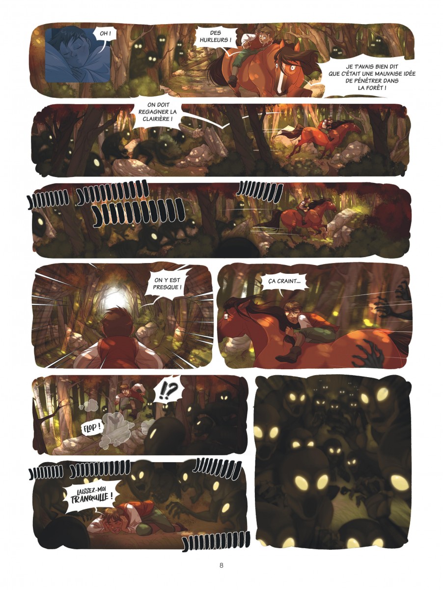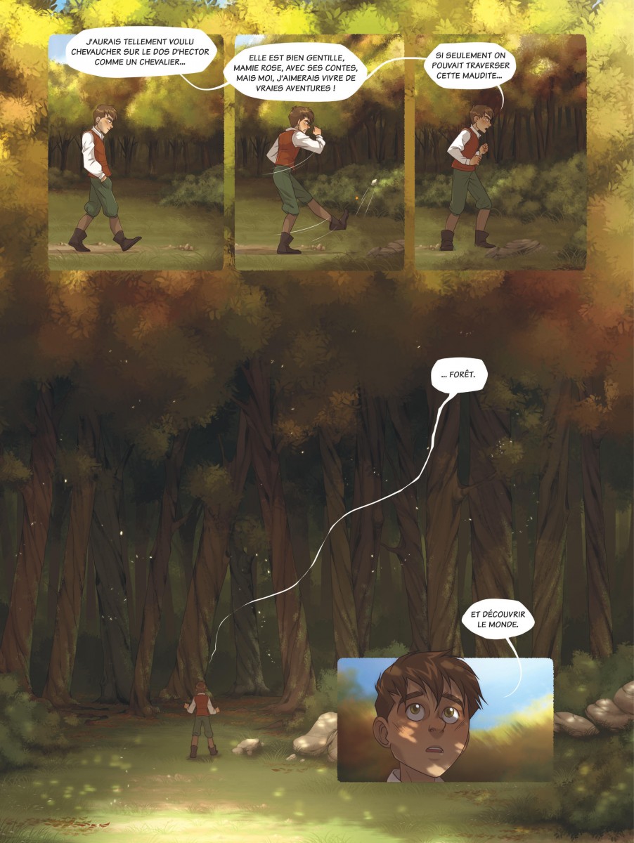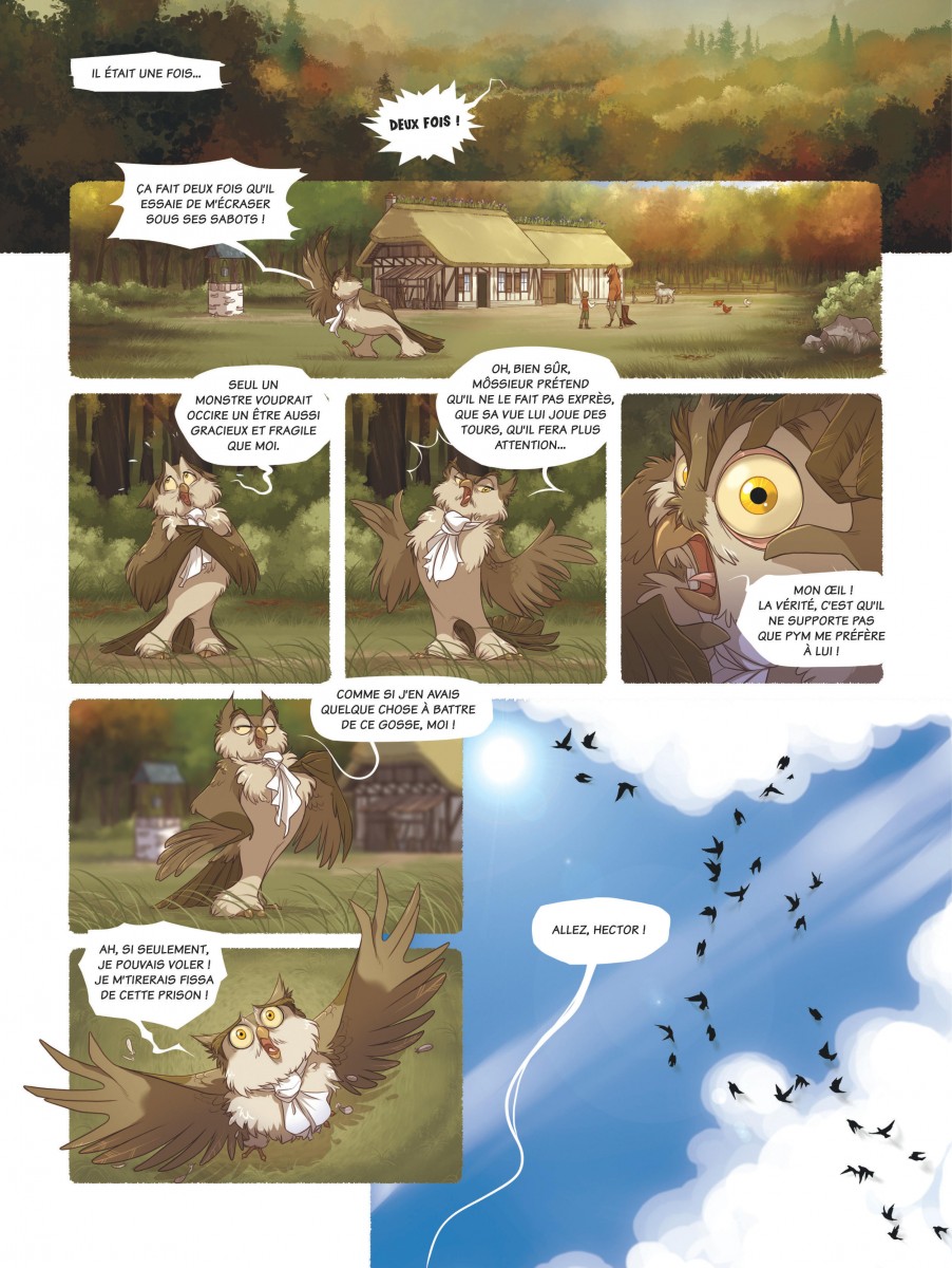 Pym et la forêt éternelle propose un univers entre contes traditionnels et fantasy médiévale, avec un jeune héros, une grand-mère énigmatique et leurs deux compagnons animaux parlants perdus au cœur d'une forêt hostile peuplée de créatures inquiétantes. Quelle est cette forêt ? Est-ce que les histoires que raconte la grand-mère sur la ville et la vie au-delà de ses sombres frondaisons sont vraies ? Ces Bien-nés, personnes dotées naturellement de pouvoirs magiques, sont-ils vraiment traqués par les sbires du jeune roi Owen ? Quels autres mystères sont ainsi cachés à la connaissance du jeune Pym ? C'est une histoire qui renoue avec les contes âpres, presque cruels, s'éloignant loin d'une fantasy trop lissée. Et pourtant ce n'est pas l'impression première qu'on a en découvrant le graphisme influencé d'une part par le manga, l'animation mais aussi beaucoup par l'école Disney. Cela saute aux yeux avec la représentation des animaux et en particulier le hibou Ned dont le côté râleur rappellera forcément l'Archimède de Merlin l'enchanteur. Ce trait léger contraste avec une ambiance inquiétante soutenue par une colorisation soignée et très appréciable. Je ne regrette que son origine un peu trop informatique qui se ressent dans les scènes d'obscurité qui devaient probablement bien mieux ressortir sur écran que sur papier où elles sont trop sombres et difficiles à distinguer. Mais pour le reste, c'est un bel ouvrage, très agréable à lire. Le scénario est globalement bien construit, dense pour une série jeunesse, avec une intrigue à tiroirs et des personnages plus ambigus qu'ils n'y paraissent au premier abord. La relation entre Pym et sa grand-mère, faite de protection, de non-dits et de secrets, est au cœur de l'intrigue du premier tome et attise la curiosité tout en agaçant un peu. Une grande part du récit est sombre, voire vraiment inquiétante, mais c'est contrebalancé par une dose de légèreté, notamment dans le comportement des animaux anthropomorphes qui apporte une touche d'humour et rend les protagonistes plus attachants. À noter qu'il semble, à voir les extraits du deuxième tome présentés en fin d'album, que la série va s'orienter vers une succession de points de vue puisque le premier est vu par les yeux de Pym tandis que le second semble se focaliser sur le prince Owen, sans doute pour lever davantage le voile sur les raisons de sa haine envers les Biens-nés qui a entraîné la situation actuelle de Pym. C'est encore une série en devenir. Le premier tome pose de belles bases mais n'est encore qu'une grande introduction et l'aventure au sens propre ne commence qu'à sa toute fin. Il faudra donc lire la suite pour se faire une opinion complète, mais cela commence très bien. Note : 3,5/5