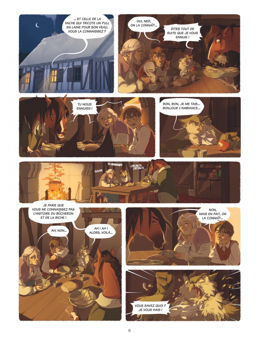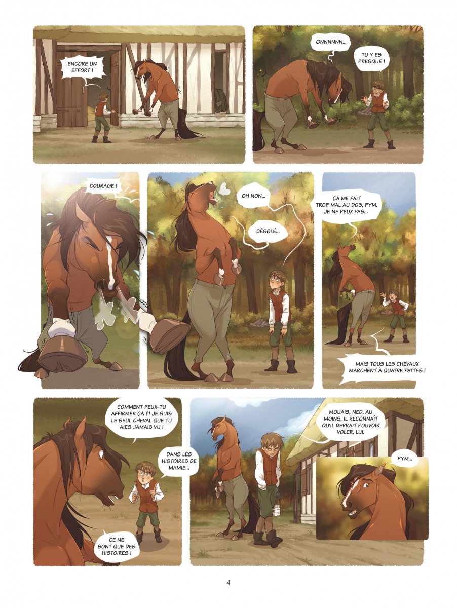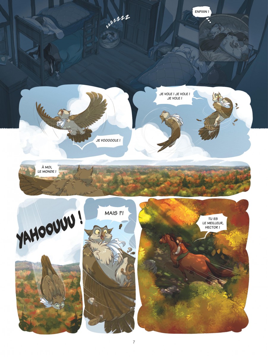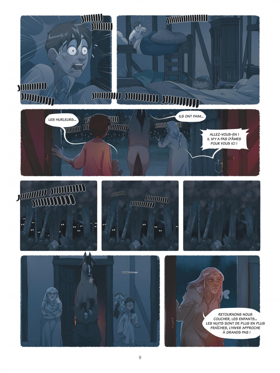 Pym et la forêt éternelle propose un univers entre contes traditionnels et fantasy médiévale, avec un jeune héros, une grand-mère énigmatique et leurs deux compagnons animaux parlants perdus au cœur d'une forêt hostile peuplée de créatures inquiétantes. Quelle est cette forêt ? Est-ce que les histoires que raconte la grand-mère sur la ville et la vie au-delà de ses sombres frondaisons sont vraies ? Ces Bien-nés, personnes dotées naturellement de pouvoirs magiques, sont-ils vraiment traqués par les sbires du jeune roi Owen ? Quels autres mystères sont ainsi cachés à la connaissance du jeune Pym ? C'est une histoire qui renoue avec les contes âpres, presque cruels, s'éloignant loin d'une fantasy trop lissée. Et pourtant ce n'est pas l'impression première qu'on a en découvrant le graphisme influencé d'une part par le manga, l'animation mais aussi beaucoup par l'école Disney. Cela saute aux yeux avec la représentation des animaux et en particulier le hibou Ned dont le côté râleur rappellera forcément l'Archimède de Merlin l'enchanteur. Ce trait léger contraste avec une ambiance inquiétante soutenue par une colorisation soignée et très appréciable. Je ne regrette que son origine un peu trop informatique qui se ressent dans les scènes d'obscurité qui devaient probablement bien mieux ressortir sur écran que sur papier où elles sont trop sombres et difficiles à distinguer. Mais pour le reste, c'est un bel ouvrage, très agréable à lire. Le scénario est globalement bien construit, dense pour une série jeunesse, avec une intrigue à tiroirs et des personnages plus ambigus qu'ils n'y paraissent au premier abord. La relation entre Pym et sa grand-mère, faite de protection, de non-dits et de secrets, est au cœur de l'intrigue du premier tome et attise la curiosité tout en agaçant un peu. Une grande part du récit est sombre, voire vraiment inquiétante, mais c'est contrebalancé par une dose de légèreté, notamment dans le comportement des animaux anthropomorphes qui apporte une touche d'humour et rend les protagonistes plus attachants. À noter qu'il semble, à voir les extraits du deuxième tome présentés en fin d'album, que la série va s'orienter vers une succession de points de vue puisque le premier est vu par les yeux de Pym tandis que le second semble se focaliser sur le prince Owen, sans doute pour lever davantage le voile sur les raisons de sa haine envers les Biens-nés qui a entraîné la situation actuelle de Pym. C'est encore une série en devenir. Le premier tome pose de belles bases mais n'est encore qu'une grande introduction et l'aventure au sens propre ne commence qu'à sa toute fin. Il faudra donc lire la suite pour se faire une opinion complète, mais cela commence très bien. Note : 3,5/5