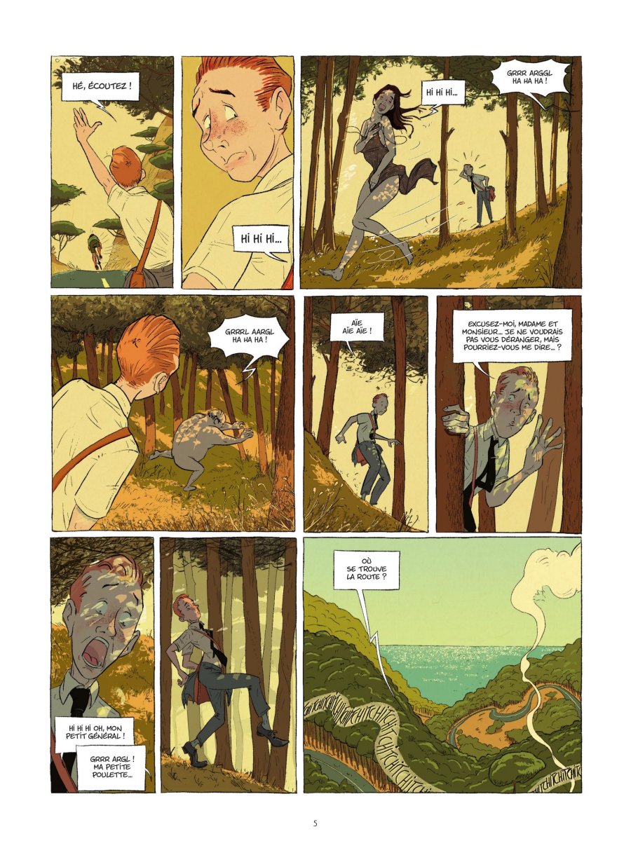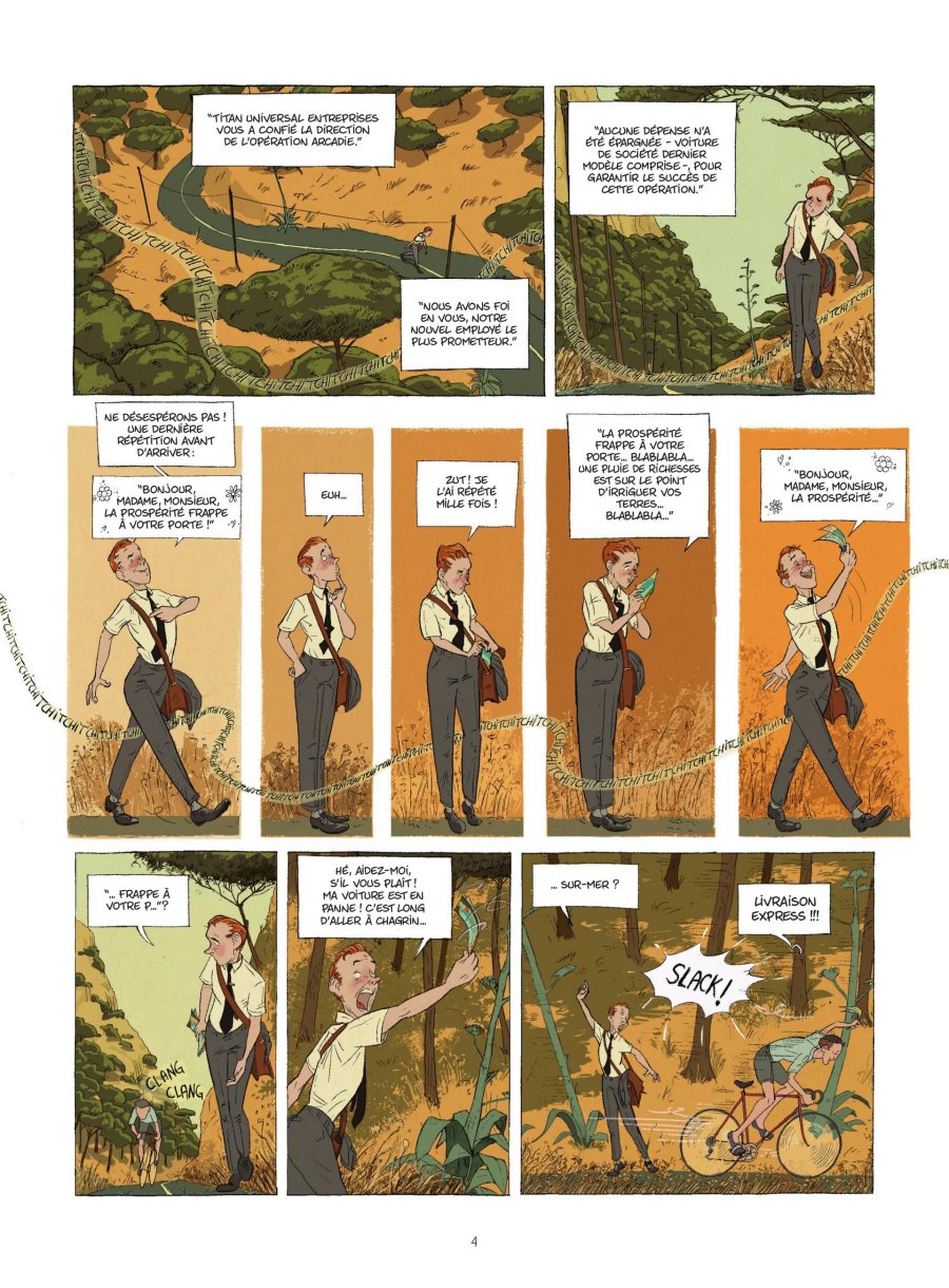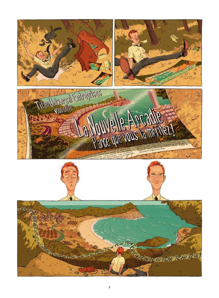 Sur une côte méditerranéenne encore préservée, Prométhée Foiemangé, jeune cadre persuadé d'œuvrer pour le progrès, est envoyé dans un petit port de pêche afin de convaincre la population de céder ses terres pour un projet d'avenir fondé sur le béton et le tourisme de masse. Pour y parvenir, il doit rallier à sa cause une grande famille locale pour le moins singulière, quitte à exploiter les failles et les tensions internes qui la traversent. Mais cette famille se révèlera bien plus profondément enracinée dans ces lieux qu'elle ne le laisse paraître. Avec La Nouvelle Arcadie, l'auteur espagnol Juanjo Rodríguez J. propose une fable comique à la croisée de la satire sociale, de la comédie familiale et... de la mythologie grecque. Il situe son récit dans un décor chaleureux aux accents provençaux, imprégné de l'insouciance des années 1960. Le dessin est expressif et séduisant, avec un soin particulier apporté aux décors et aux ambiances. Les couleurs patinées et la lumière méditerranéenne donnent beaucoup de charme à l'ensemble et incarnent visuellement ce monde ancien encore intact, confronté à une modernité froide et envahissante. Je regrette toutefois un encrage trop fin, qui prive le dessin du surplus d'élégance qu'il aurait mérité. Côté scénario, le récit débute comme une comédie légèrement absurde, à la manière d'un Qui a tué l'idiot ?, avec l'arrivée d'un jeune homme dans un village et une famille excentrique où la farce se mêle à la satire sociale. Les personnages sont hauts en couleur, presque excessifs au premier abord, mais cela relève d'un choix assumé. Assez rapidement, ce qui n'était d'abord suggéré s'affirme pleinement. J'ai eu le plaisir de deviner la révélation avant qu'elle ne soit explicitement formulée, mais très vite celle-ci ne se cache plus et devient même un peu trop appuyée, ce qui m'a fait regretter que le doute ne soit pas entretenu plus longtemps. Je préfère ne pas la dévoiler afin de vous préserver la découverte, même si elle occupe rapidement une place centrale dans l'intrigue. Disons simplement qu'il est question d'une famille profondément dysfonctionnelle, mais étonnamment stable depuis longtemps. La transposition mythologique fonctionne bien et reste fidèle à son modèle, tout en soulignant avec humour, et parfois une ironie douce-amère, le conflit entre tradition et modernité. J'ai toutefois trouvé que la mise en scène manquait souvent de finesse. Le registre de la farce est trop appuyé et certaines réactions sont surjouées. Le propos manque aussi par moments de mordant. La fable demeure agréable et engagée, mais elle n'explore pas toujours pleinement ses idées, et la critique du capitalisme touristique reste relativement sage, comme si le récit hésitait à durcir réellement son discours. La Nouvelle Arcadie est une comédie plaisante et humaine, portée par une idée forte et un univers visuel séduisant, malgré un encrage un peu trop discret. J'ai davantage adhéré à son concept qu'à l'ampleur réelle de son développement. Une telle idée aurait mérité plus d'élégance et de finesse pour être plus marquant.