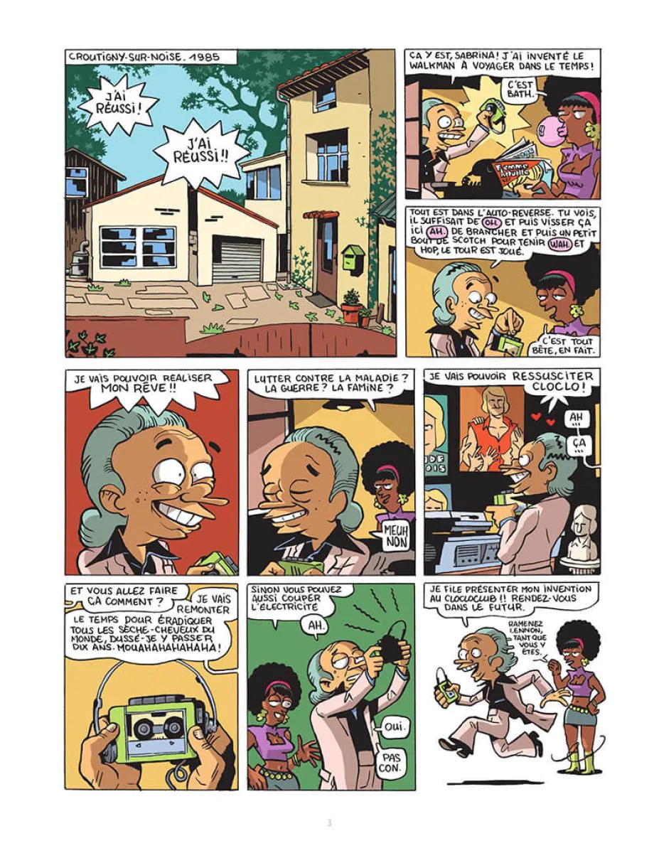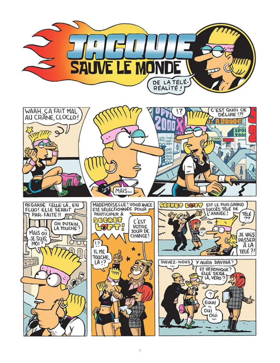 Jacquie, pur produit des années 80, fan d'aérobic et de musculature, tombe sur un walkman bricolé qui lui permet de voyager dans le temps. Propulsée à travers les époques, elle règle les problèmes à coups de bourre-pif, qu'il s'agisse d'envahisseurs barbares, de téléréalité, de malbouffe ou d'autres absurdités contemporaines ou futures. Le ton est donné d'emblée. C'est flashy, cartoonesque, très expressif, avec des trognes déformées et un côté Fluide Glacial pleinement assumé. Ça bouge dans tous les sens, c'est rempli d'onomatopées et de gags visuels, et cette énergie correspond bien au tempérament ultra rentre-dedans de l'héroïne. Rien de très subtil, mais c'est vivant et efficace. Côté scénario, le principe de départ est amusant, notamment grâce au choix de son héroïne. Confronter une caricature des années 80 particulièrement bourrine au reste de l'Histoire crée des décalages comiques et permet quelques piques bien senties sur la société de consommation, les médias ou la bêtise ambiante. Jacquie cogne d'abord et réfléchit, éventuellement, ensuite. J'ai surtout apprécié ses deux premiers voyages : son irruption sur un tournage d'une forme de Loft Story, expédié sans ménagement, puis sa rencontre avec une invasion de Huns nettement moins brutaux qu'elle. Malheureusement, la suite devient plus répétitive et moins enthousiasmante. Le schéma reste le même : elle débarque dans une époque, constate que tout part en vrille, distribue des baffes, puis repart. L'ensemble finit par tourner en rond, surtout en lisant l'album d'une traite et ce n'est plus tellement amusant ; au plus un vague sourire ici et là. Le début de cette BD est fun et bien déjanté, mais son idée s'essouffle trop vite et manque de renouvellement. Heureusement, l'énergie de Jacquie permet tout de même de passer un assez bon moment. Note : 2,5/5