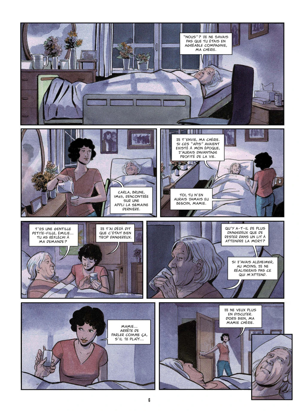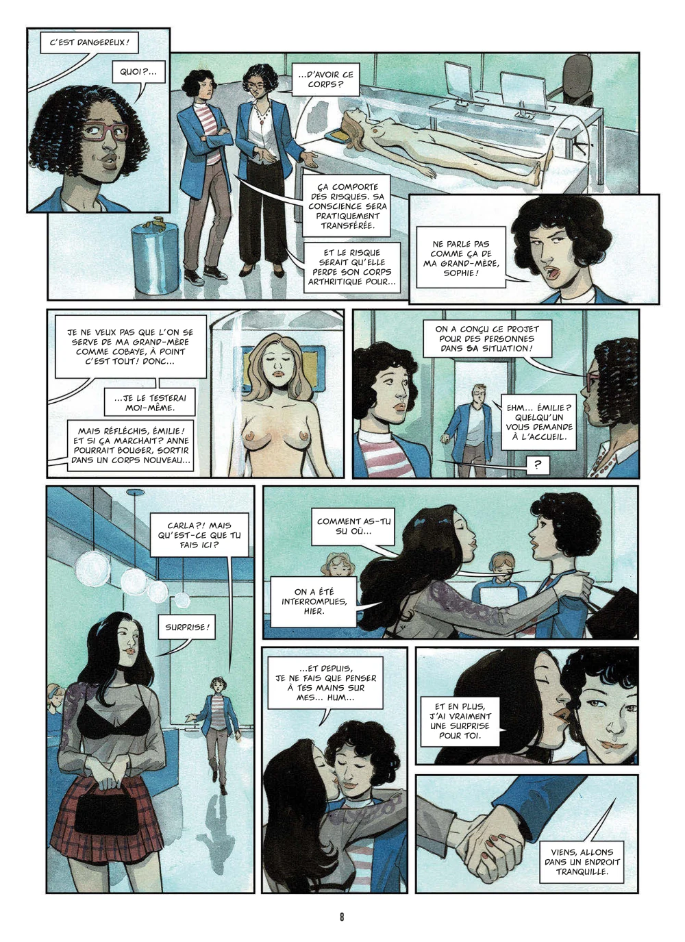 Après la phase de conception, elle décide de tester ce dernier sur sa grand-mère, alitée par son âge avancé et qui n’a plus beaucoup de temps à vivre. Cette invention offre à la vieille dame une seconde chance de vivre toutes ses envies de jeunesse. Avec son trait doux et élégant et ses couleurs pastel Elena Ominetti aborde avec cet album un thème fort sur la sexualité et le handicap. Si aujourd’hui, les développements de l’intelligence artificielle, du machine learning, des technologies immersives bouleversent progressivement notre rapport au monde, à notre quotidien, alors pourquoi pas à notre intimité ?