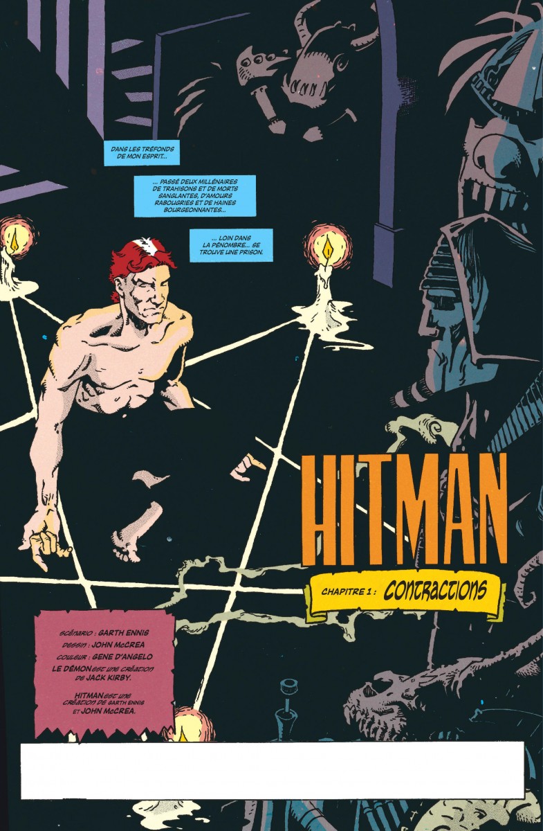 Agressé par un parasite extraterrestre, le tueur à gages de Gotham, Tommy Monaghan, obtient deux dons surhumains : une vision à rayons-X et la capacité de lire dans les pensées. Désormais, entre deux parties de billard au bar Chez Noonan, Tommy remplit des contrats placés sur la tête des métahumains. Au cours de ces expéditions périlleuses qui mettent en danger la vie de ses proches, celui qui se fait appeler Hitman croise la route d'Etrigan le Démon, de Batman et du Joker, et même d'animaux aquatiques zombies ! Texte: L'éditeur