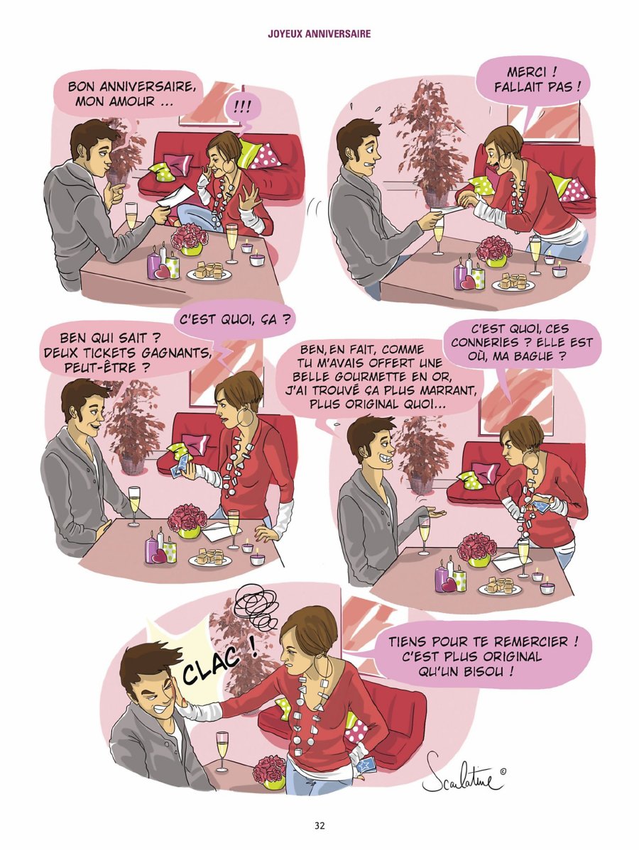 Une succession de gags qui dénoncent et se moquent d'hommes lourds, égoïstes, obsédés ou lâches, à travers des scènes de couple ou de drague du quotidien. L'idée est clairement de pointer du doigt les comportements sexistes ordinaires et, plus largement, les rebuts d'une société patriarcale qui les produit. L'œuvre est entièrement scénarisée par Sophie de Villenoisy sur la base d'anecdotes qu'elle a collectées, mais le dessin est réalisé collectivement par une dizaine d'autrices majoritairement issues de l'univers des blogs BD. Le résultat est un peu inégal. Quelques planches sortent clairement du lot, notamment celles de Gally, dont le trait est plus expressif et maîtrisé (elle a d'ailleurs creusé le sujet du sexisme avec davantage de finesse dans d'autres œuvres). En revanche, pas mal d'autres planches oscillent vers un style blog-BD girly assez plat, pas toujours très professionnel, qui manque de personnalité et de mise en scène. L'ensemble reste lisible, mais manque de relief. Sur le fond, le concept est pertinent. Dénoncer ces attitudes de vrais connards, celles que les femmes subissent mais que beaucoup d'hommes désapprouvent aussi, est légitime, et certains gags font mouche. Quand l'album vise les réflexes machos, l'infidélité minable ou la goujaterie pure, ça fonctionne bien et le message passe sans forcer. Je sens une véritable volonté de satire sociale, pas seulement de défouloir. Là où je décroche davantage, c'est qu'à côté de planches vraiment pertinentes, plusieurs autres se situent dans une zone floue entre critique du patriarcat et simple anecdote de couple un peu caricaturale, avec un mec lourdaud face à une femme parfois capricieuse. Le propos politique se dilue alors. Je pense par exemple à ces deux ou trois gags où la femme exige un cadeau à la hauteur de ses principes ou de celui qu'elle a offert elle-même, puis s'arroge le droit de frapper son conjoint s'il n'a pas payé assez cher : on n'est plus dans la dénonciation d'un système, mais dans une petite mesquinerie symétrique qui brouille complètement le message. À force d'accumuler des sketches de niveaux très variables, l'album perd en cohérence et en mordant. Au final, je retiens une bonne intention et quelques traits d'humour bien trouvés, mais trop d'inégalités pour que l'ensemble soit vraiment percutant. Note : 2,5/5