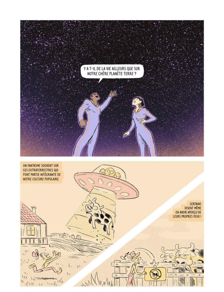 3.5 Un documentaire qui pose une question intéressante: avec toutes les galaxies et les planètes qui existent dans l'univers, pourquoi il n'y pas eu une race extraterrestre qui a prit contact avec la terre ? Est-ce que la terre est la seule planète habitable dans l'univers ? Personnellement, si je ne crois pas à toutes les histoires d'extraterrestres débarqué sur terre, j'aime bien l'idée qu'il y a une autre planète habitable quelques part dans l'univers et on le sait pas tout simplement parce que les galaxies sont très loin l'une de l'autre et les aliens ont juste pas la technologie pour venir nous parler ou peut-être qu'ils ont encore à un stade plus primitif que nous. En tout cas, les auteurs proposent diverses théories et j'ai bien aimé que le ton est scientifique. On ne tombe pas dans le farfelu ou le conspirationniste comme c'est trop souvent le cas lorsqu'on touche au paranormal. La narration est dynamique et les deux personnages principaux, un scientifique un peu farfelu et sa petite-fille qui est curieuse de tout, sont attachants. Le dessin est très bon. Un bon documentaire que je recommande.